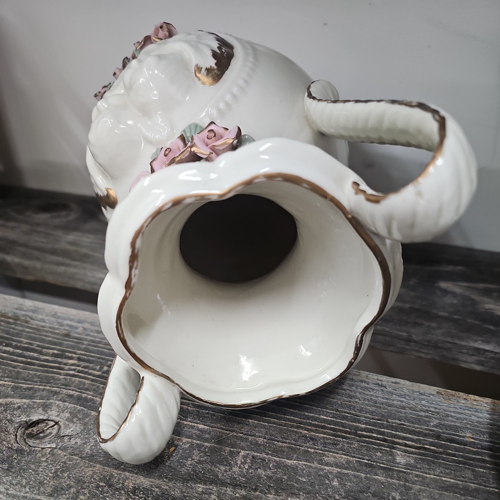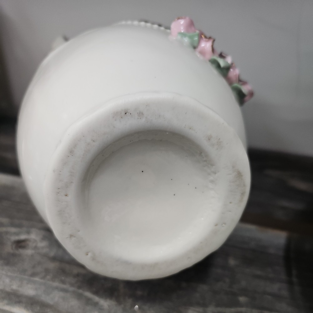 Item Weight: 42.33 oz Finish: Embossed gold Subject: Cherub Color: White Country of Origin: Unknown Type: Vase Shape: Round Pattern: Roses Size: 10.5 " x 5" Vintage: yes Occasion: All Occasions Material: Ceramic & Porcelain Brand: PINK Time Period Manufactured: unknown