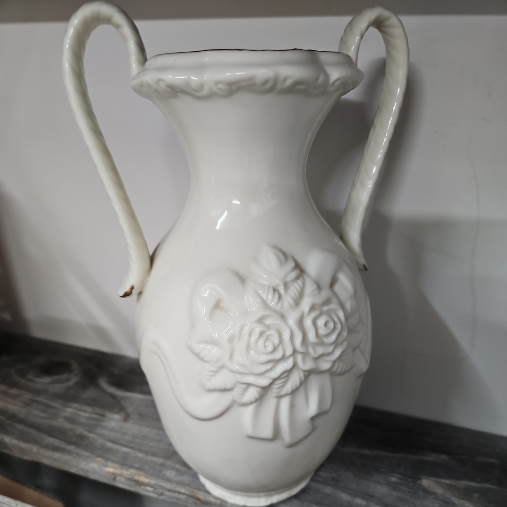 VINTAGE VASE EMBOSSED CHERUBS 1 SIDE & WHITE ROSES 2 W PINK ROSES AND GOLD TRIM