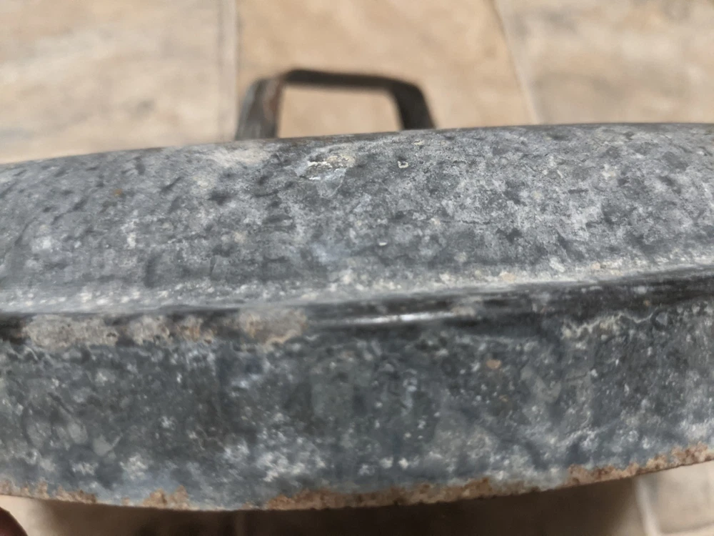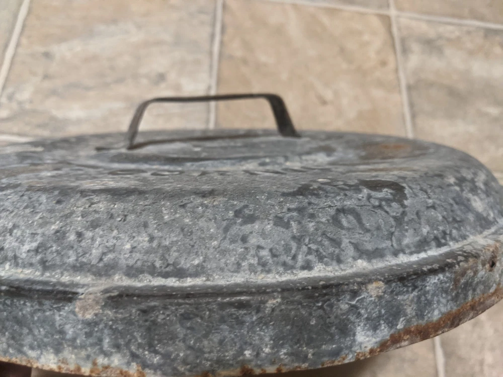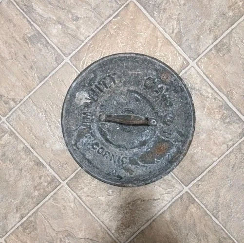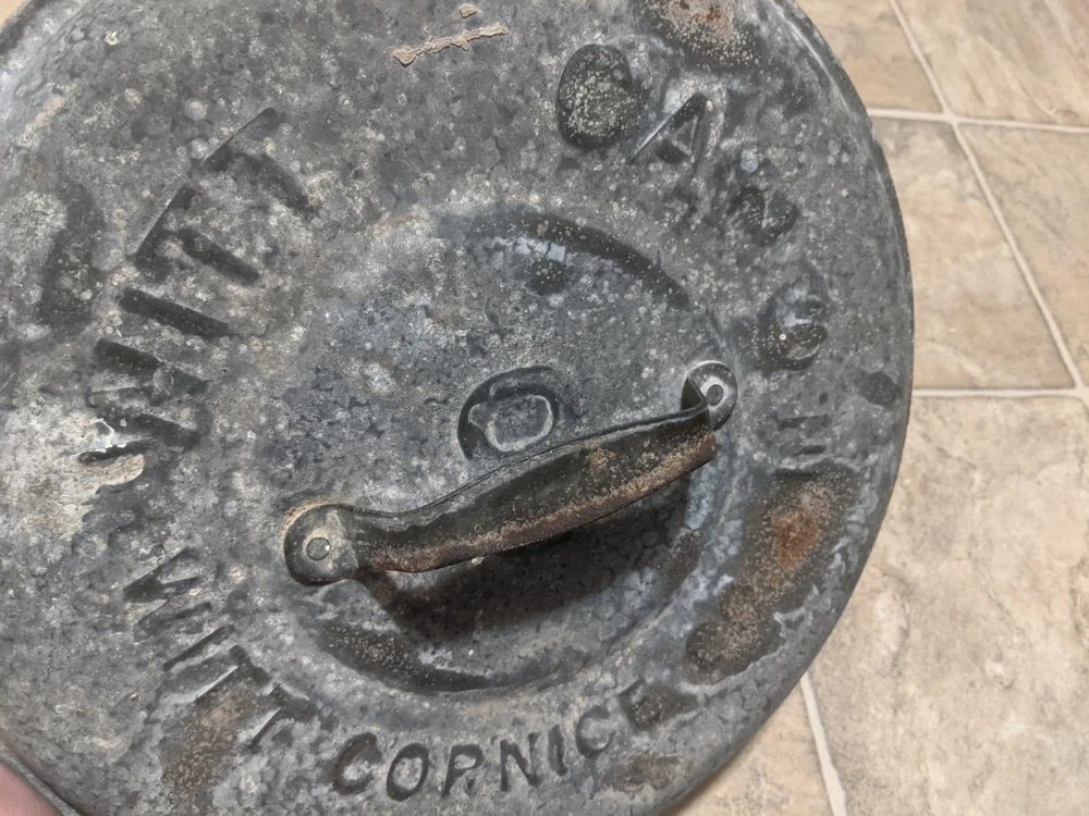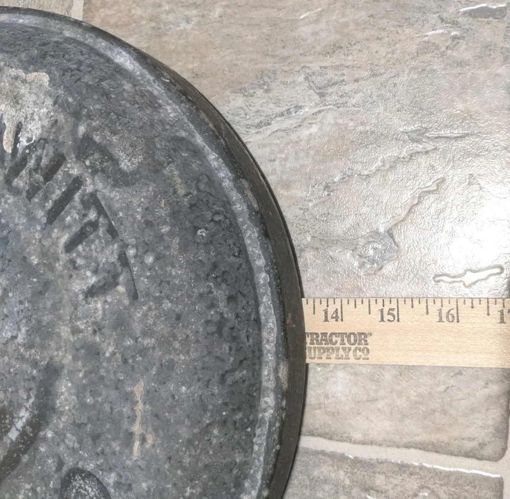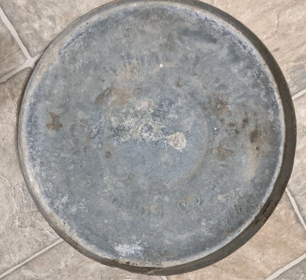 Item is a VINTAGE WITT CAN CO CIN O. GALVANIZED SMALL TRASH CAN LID, LID ONLY, FREE SHIPPING. DIAMETER IS APPROX. 13 in. Center of lid is marked "8". Other markings, "WITT CAN WITT CORNICE CO. CIN. O." Little rust, surface rust mostly, but some small spots on rim exist where rust penetrates from exterior to interior, one spot where rust has created a pin hole seen when held to bright light. See images. Please view all images before purchasing. Do reach out via eBay messaging with any questions or concerns. Note: I have the can that this lid belongs to. The bottom two inches of the can are gone due to rust. If anyone is interested in that can for parts, please message me and I will provide images and/or list it for sale.