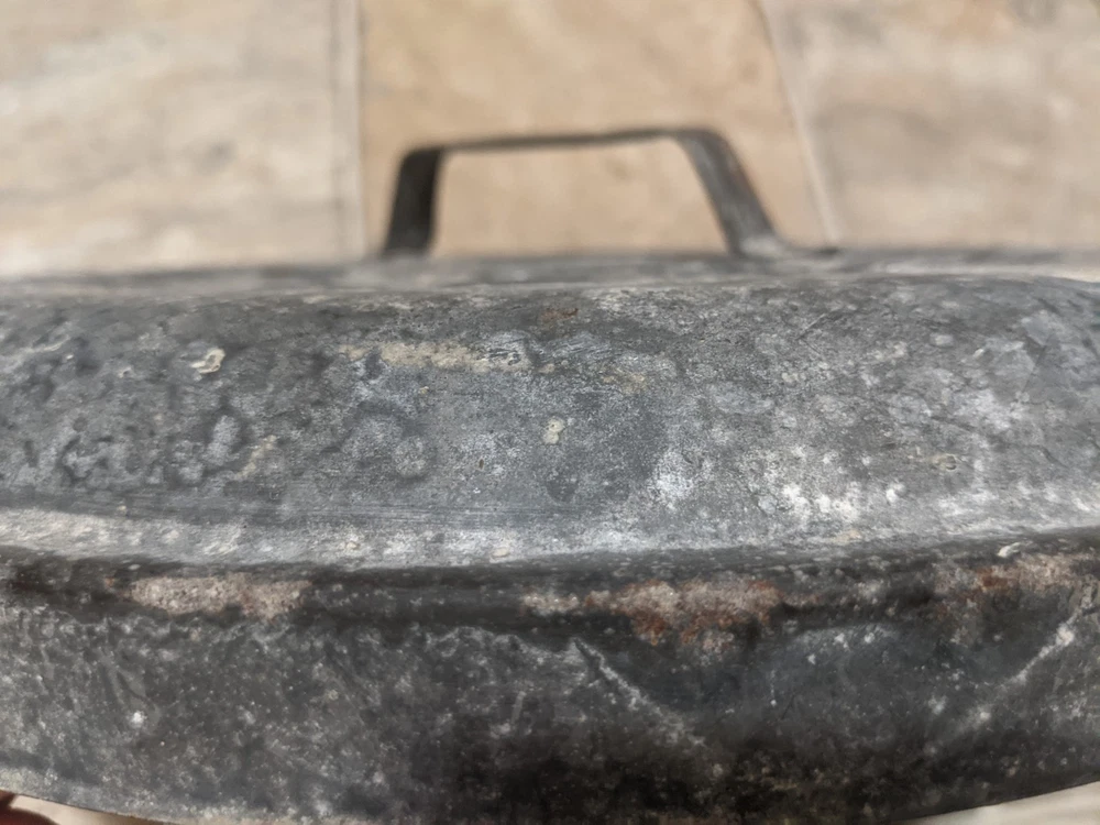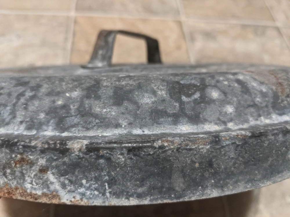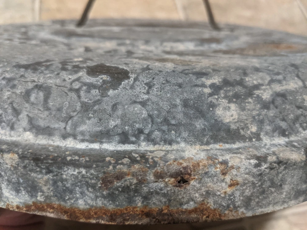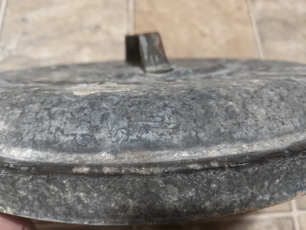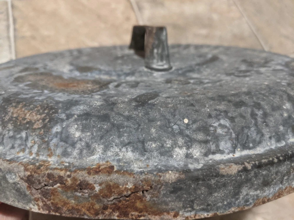 Item is a VINTAGE WITT CAN CO CIN O. GALVANIZED SMALL TRASH CAN LID, LID ONLY, FREE SHIPPING. DIAMETER IS APPROX. 13 in. Center of lid is marked "8". Other markings, "WITT CAN WITT CORNICE CO. CIN. O." Little rust, surface rust mostly, but some small spots on rim exist where rust penetrates from exterior to interior, one spot where rust has created a pin hole seen when held to bright light. See images. Please view all images before purchasing. Do reach out via eBay messaging with any questions or concerns. Note: I have the can that this lid belongs to. The bottom two inches of the can are gone due to rust. If anyone is interested in that can for parts, please message me and I will provide images and/or list it for sale.