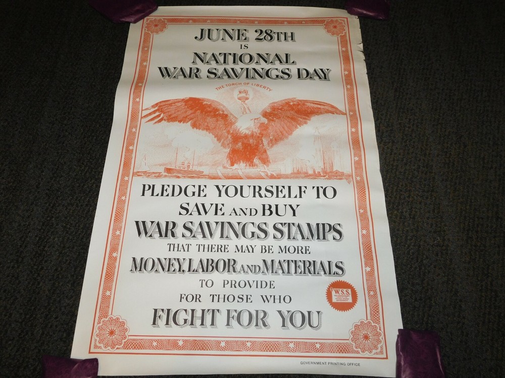 YOU ARE BIDDING ON AN ORIGINAL..NOT A REPRODUCTION ...... VINTAGE WWI WORLD WAR 1 NATIONAL WAR SAVINGS DAY WSS FIGHT FOR YOU EAGLE POSTER ... ....MEASURES APPROX 32" X 21"...MADE OF PAPER.... SHOWS HANDLING WEAR/ AGE DISCOLORATION......HAS EDGE TEARS....CREASE LINES....... ............PLEASE VIEW PHOTOS FOR CONDITION...SHIPS ROLLED ***PLEASE E-MAIL IF YOU HAVE A QUESTION OR WANT AN ADDITIONAL PICTURE....PLEASE VISIT MY EBAY STORE FOR ADDITIONAL WORLD WAR 1 POSTERS & VINTAGE ITEMS..THANK YOU***18960213-1V-BX3939-UUUU