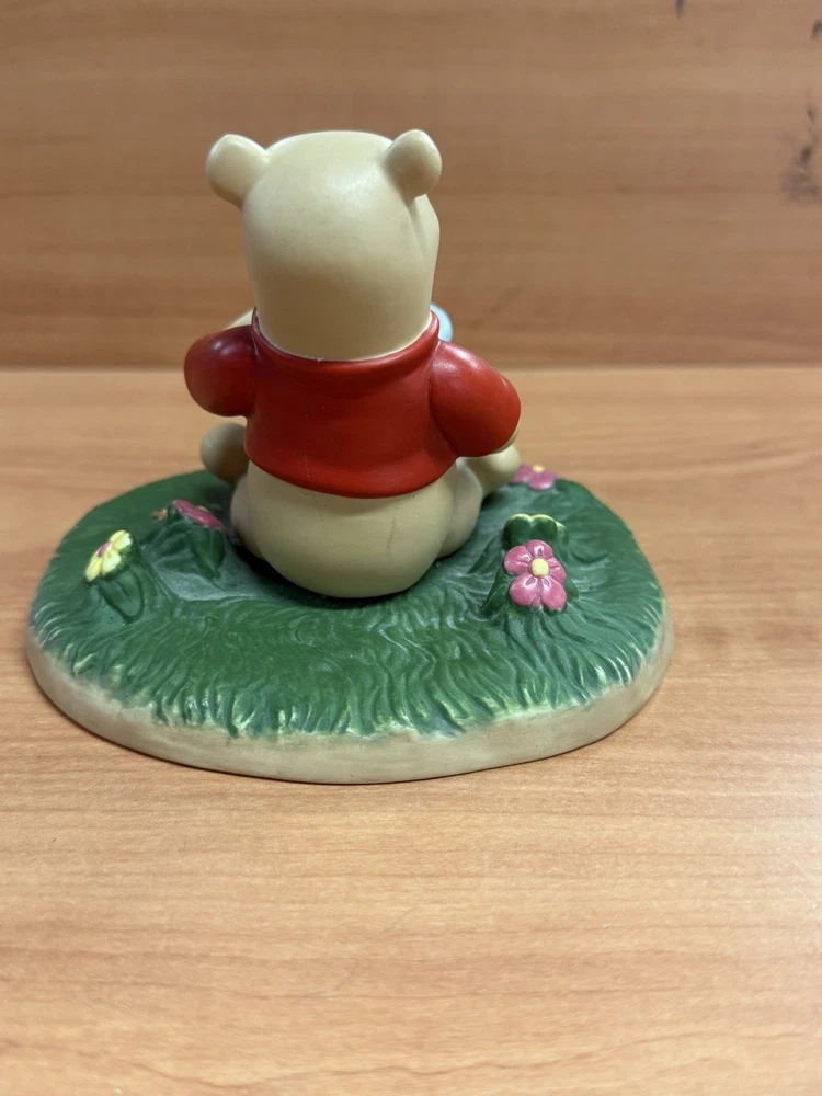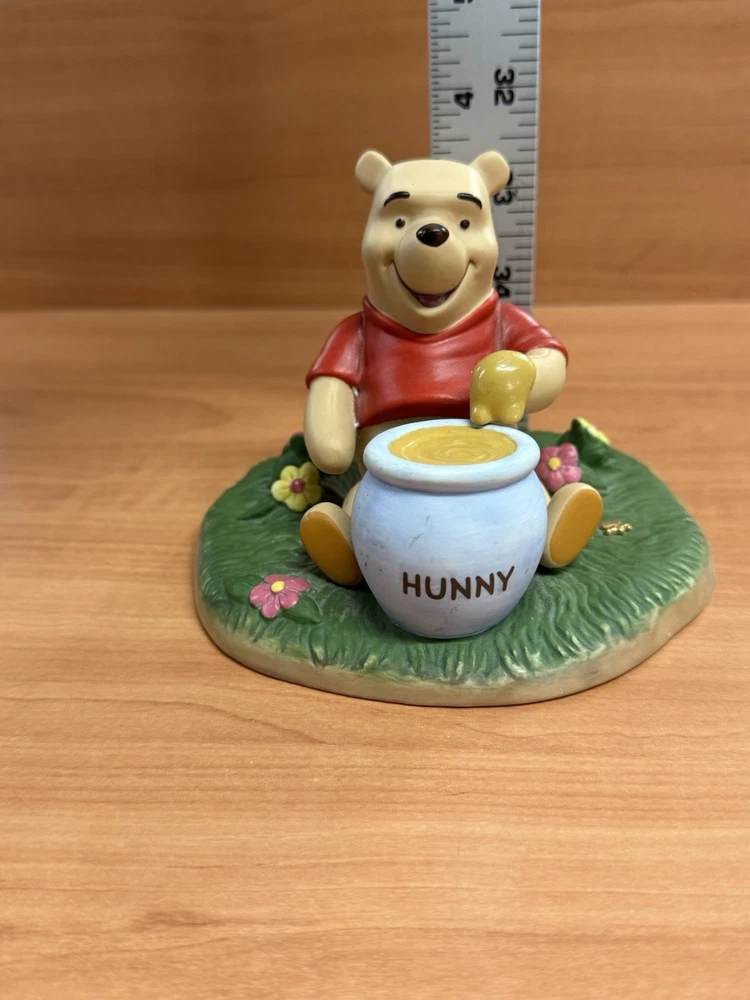 The collectible depicts Winnie the Pooh enjoying his favorite treat, honey, from a pot labeled "HUNNY". This piece is part of the "Pooh and Friends" collection by Disney. The honey dripping from the pot and Pooh's paw is made of glistening resin. It was a 1996 membership sculpture from the Walt Disney Classics Collection. The figurine stands approximately 4 3/4 inches tall. **** no box ******