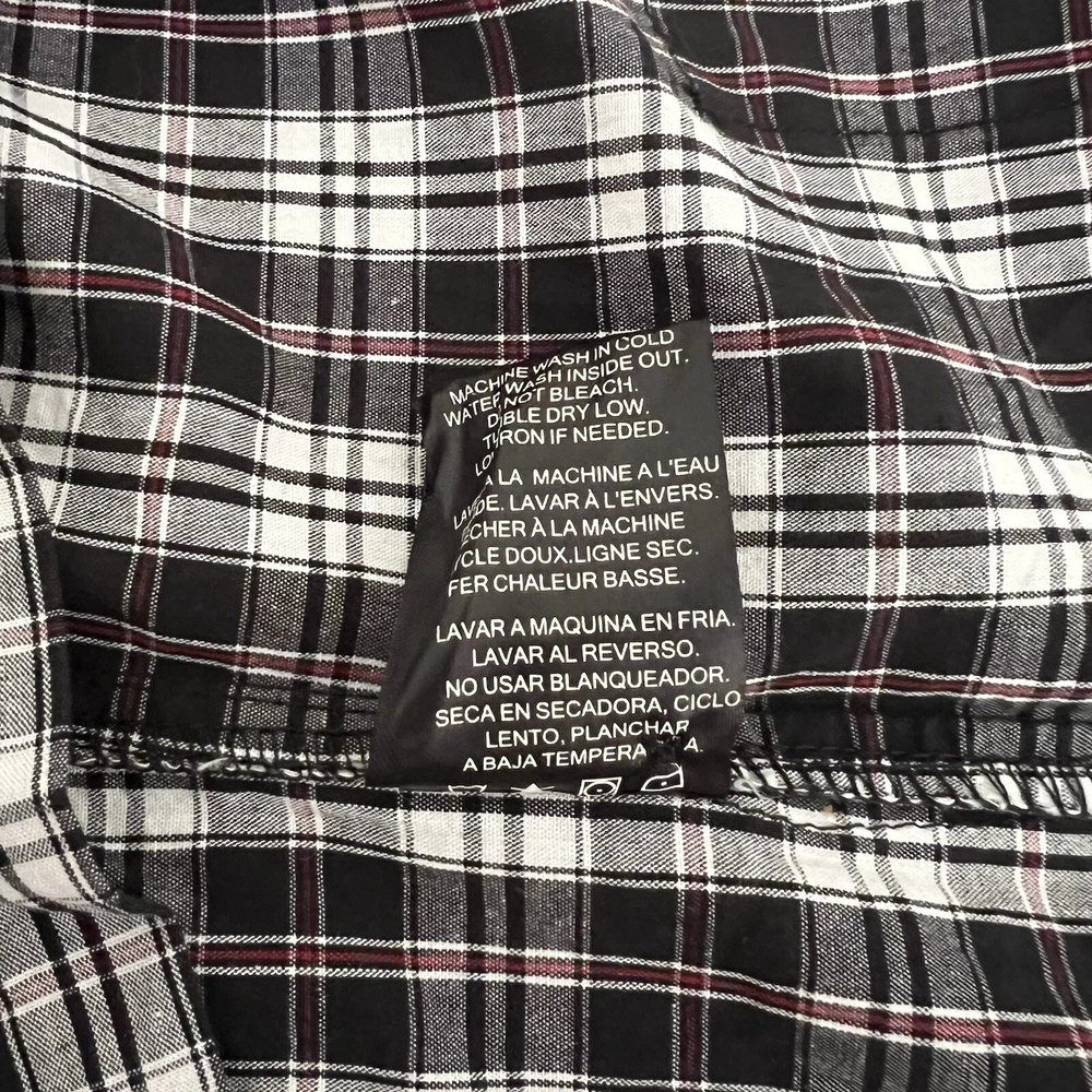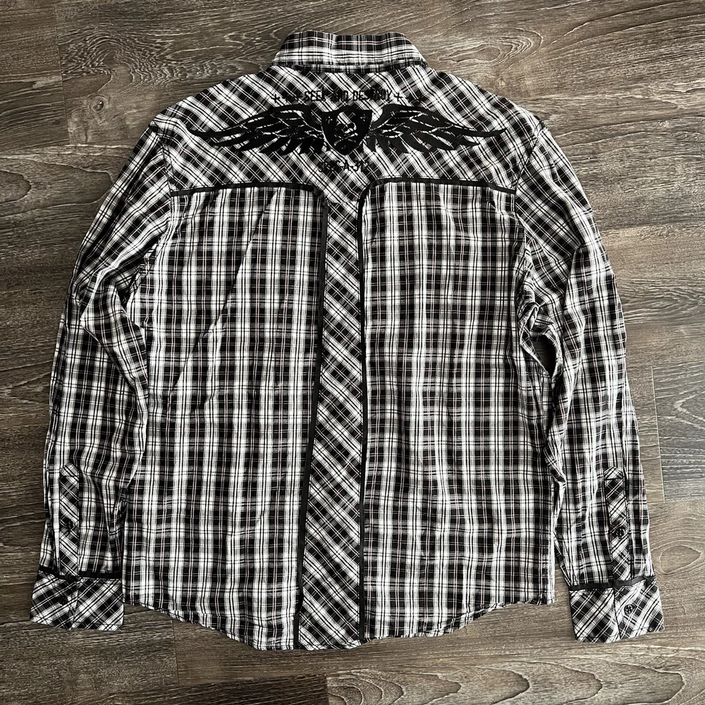 This vintage Affliction Black Premium button-up shirt is a must-have for any fashion-forward man. The collared neckline and long sleeves make it perfect for a variety of occasions, from casual to formal. The classic black and burgundy color and embroidered accents add a touch of edginess to the shirt, while the cotton fabric ensures both comfort and durability. With a chest size of 46 inches and a size of XL, this shirt fits true to size and is machine washable for easy care. The shirt's theme is inspired by motorcycle culture, with elements of Y2K, punk, grunge, and steampunk. This shirt is sure to make a statement and is perfect for any season, whether it's winter, summer, fall, or spring. Add this unique shirt to your wardrobe today! Size: XL Measurements: 23" x 29"