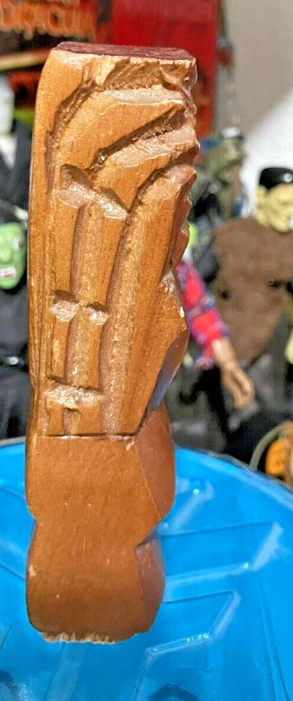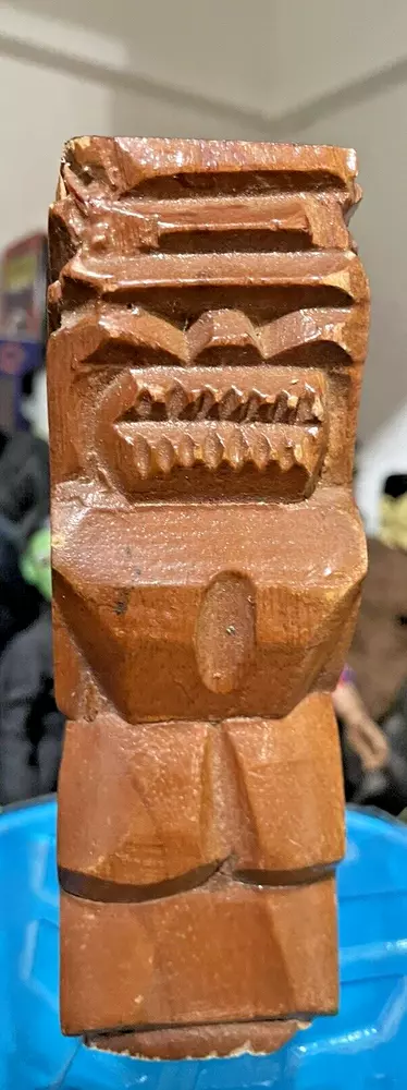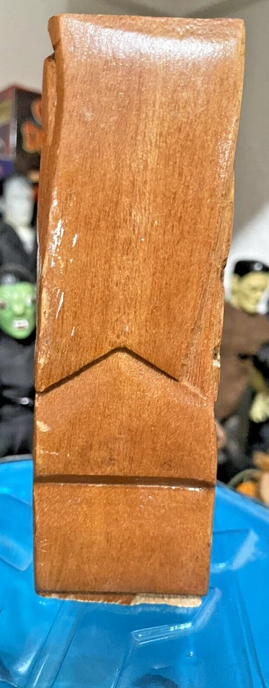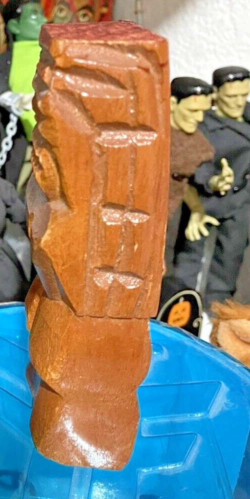 This is a vintage carved wooden Tiki (Ki'i in Hawaiian) statue of the Hawaiian ancestor/God Ku Kukailimoku, measuring 5 inches tall. The Tiki statue is made in the Philippines and features a Hawaiian cultural influence in its design. Mid-century made. Crafted of monkey pod wood. Please refer to photos for condition.