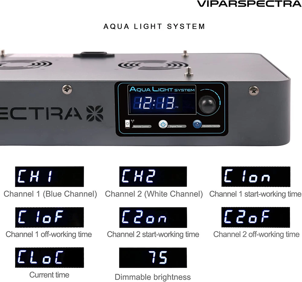 Timer 165W Led Aquarium Light Specifications: - Dimension:15.8x8.3x2.4 inches - Weight: 6.8 lbs - One light is ideal for 24x24x24” tank - Max Coverage at 8" Height: 30x24” - Core Coverage at 8" Height: 24x24” - LED Quantity: 55pcs 3W LEDs - Channel one: Violet/Indigo(420nm), Royal Blue(450nm), Blue(470nm) - Channel two: Green(520nm), Red(660nm), Neutral White(6500K), Cool White(12000K) - Actual Power Consumption: 105W±3% - LED Brand: Bridgelux/Epiled - Lifespan: 100,000 hours - Secondary LED Focusing Lens 90° - Cooling system: quiet fans and heat sink - Input Voltage: AC100-240V - Frequency: 50-60Hz VIPARSPECTRA Timer Control 2pcs 165W LED Aquarium Light For Coral Reef Fish Tank The V165 165W LED Aquarium Light on eBay platform was updated to the new version from February 6th, 2024. The intensity interval of the new version is 1%, while the old version is 10%. Welcome to the VIPARSPECTRA Timer Control Series Dimmable V165 165W LED Aquarium Light, with full spectrum layout, built in timer, dimmable ability and advanced heat dissipation system, specially designed to provide perfect lighting environment for all your precious water creatures. Features: - VIPARSPECTRA Timer Control Series V165 LED Aquarium Light is scientifically engineered to keep the balance of the PAR output and coverage. - Internal timer allows you to turn the light on or off automatically and separately. Dimmable feature can be used to adjust two channels brightness individually. - V165 is full spectrum with our proprietary layout, which is contributed by thousands of ReefCentral members, has had years of success. - Suitable for all photosynthetic corals, be sure to acclimate your tank or new corals to the new light by slowing increasing its exposure/intensity to the light. - 1 year local warranty plus 30 days satisfaction or return guarantee. Timer 165W Specifications: - Dimension:15.8x8.3x2.4 inches - Weight: 6.8 lbs - One light is ideal for 24x24x24” tank - Max Coverage at 8" Height: 30x24” - Core Coverage at 8" Height: 24x24” - LED Quantity: 55pcs 3W LEDs - Channel one: Violet/Indigo(420nm), Royal Blue(450nm), Blue(470nm) - Channel two: Green(520nm), Red(660nm), Neutral White(6500K), Cool White(12000K) - Actual Power Consumption: 105 W±3% - LED Brand: Bridgelux/Epiled - Lifespan: 100,000 hours - Secondary LED Focusing Lens 90° - Cooling system: quiet fans and heat sink - Input Voltage: AC100-240V - Frequency: 50-60Hz Design: - Built-in-Timer with two on/off settings one for blue and the other one for white. - One remote in hand, everything is simple. - Two channels brightness can be adjusted from 0% to 100% separately, interval 1% . - Full spectrum that mimic natural light to help corals/fish achieve the best balance. - Advanced high speed quiet fans and upgraded aluminum heat sinks are easy for heat dissipation. - Easy adjustable hanging kits. Package includes: ·2 x Timer 165W ·2 x Wireless Remotes ·2 x User Manuals ·4 x Hanging Kits ·2 x 6ft Power Cords (US Standard 110V grounded 3 prong plug) Attention please: - Indoor use only, not water-proof. No extra ballast is needed. APEX does not currently support this product. - Can not program sunrise, sunset and moonlight. - Can not be daisy chained. - Does not have a shimmering/ storm effects mode setting. - Can not set up multiple lights by one remote at the same time, have to do it separately. - 1 year US local warranty and 30-day money back guarantee. Payment Delivery details Ruturns Feedback Contact us Payment 1. We only accept payment by PayPal. PO. BOX Not Acceptable. 2. Please make payment within 7 days. If you don't need it, please inform us to cancel it, for eBay will open UNPAID dispute automatically in eighth day. 3. Paypal allows you to complete your purchase quickly and securely. It offers a variety of payment options including all the major card carriers. Delivery details 1. We will ONLY ship item to eBay physical Paypal address. Your eBay address must match Paypal address. 2. Monday-Friday. All orders will be shipped within one working day after payment. 3. Tracking number will be upload on ebay within 24 hours after shipment. 4. Shipping Time: 3-6 working days for US buyers. 5. To US buyers: for the led grow lights over $250 . We will send by Signature Service . Customer who inconvenience to sign for the package, please leave us a note when you place order. If customer's community is not very safe for post man delivered package when no one at home, customer can leave us a note to require signature service, we will send by signature to you for any item. Ruturns 1. Please kindly CONTACT US via eBay message if there is any problem, instead of Open Case or Return Requests, We will always try our best to solve the problem for you. 2. We provide a 30 days satisfaction or return guarantee for exchange or refund. Return shipping and handling is responsibility of the buyer. 3. The package must be in its original packaging and include all of the original accessories or items that came with it when returning an item. The item and package should be in original and perfect condition. Feedback 1. We are really appreciated that all the customers can give us 5-star positive feedback. 2. Please don't give us neutral and negative feedback before contacting us. Don't forget that good communication can solve all problems. Any questions, please feel free to send message to us first. 3. Please remember we are always here to serve you and ensure you a happy shopping experience. Contact us 1. We work from 9:00am. to 18:00pm.(GMT+8) of Monday to Friday . 2. If you have any questions, please message us and give us a chance to assist you. All messages will be answered within 1 business day (except Public holidays in China).