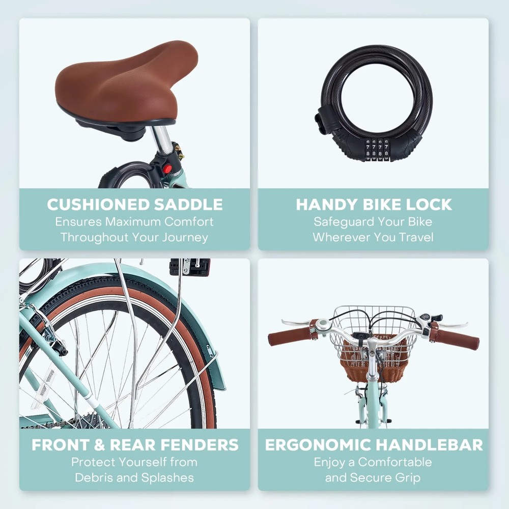 Product details Enjoy a healthier and more sustainable lifestyle with this women’s comfort bike! The design of this cruiser bike draws upon the classic step through bikes, creating a unique take on the everyday beach & city cruiser bike. Effortlessly shift gears with the 7-speed Shimano derailleur and thumb shifters, ensuring a smooth ride on any terrain. With a chic rattan front basket and reinforced rear rack, you can easily carry groceries, essentials, or even your furry friends along for the ride. Crafted from high carbon steel and featuring a low step-through frame, this bike for women is both strong and accessible, supporting riders up to 330 lb. Whether you're commuting to work or exploring new adventures, this women's bicycle ensures you'll arrive in comfort and confidence. Get out There: This women’s bike is the perfect way to travel in style and safety; it has a combination of a retro look inspired by comfort bikes and modern features, making it a unique beach & city cruiser bicycle that stands out from the crowd. Smooth Shifting: Equipped with a 7-speed Shimano derailleur and user-friendly thumb shifters, this cruiser bike ensures smooth and precise gear changes for stable rides on various terrains, from city streets to winding trails. Front & Rear Storage: This women's bicycle features a stylish rattan front basket and a reinforced rear rack, enabling you to effortlessly store groceries, carry essentials, or even bring your furry companions along on your urban escapades. Safe & Cozy Ride: Thanks to its shock-absorbing cushioned saddle, front & rear V brakes, and duplex aluminum rims, this bike for women is designed to provide a secure and wobble-free ride, ideal for extended commutes and adventures. Ideal Match for You: Expertly crafted from high carbon steel and featuring a low step-through frame, this comfort bike is tailored to offer optimal support for riders weighing up to 330 lb. and ranging in height from 5'1" to 5'7". Specifications Material: Carbon Steel, Rubber, Aluminum Alloy Color: Mint Tire Diameter: 24 in. (61 cm) Overall Length: 64.6 in. (164 cm) Handlebar Length: 25.2 in. (64 cm) Seat Height: 35.4 in. (90 cm) Front Basket Dimensions: 12.8 x 9.3 x 8.5 in. (32.5x23.5x21.5 cm) Rec. Rider Height: 5 ft. 1 in. -5 ft. 7 in. (155-175 cm) Weight Capacity: 330 lb. (150 kg) Front Basket Weight Capacity: 11 lb. (5 kg) Rear Rack Weight Capacity: 55 lb. (25 kg) Net Weight: 35.2 lb. (16 kg) Package List 1x Women’s Comfort Bike 1x Front Basket 1x Bike Lock 1x Assembly Instructions Viribus 24" 7-Speed Beach & City Cruiser Bicycle with Basket, Mint Cruise around in superior safety and ease with 7 variable speeds Easily carry groceries, picnic supplies, or pets in the stylish front basket and reinforced rear rack Enjoy a safe and cozy ride with its shockabsorbing saddle and dual V brakes Equipped with a Shimano derailleur and userfriendly thumb shifters for smooth gear changes Optimal support for riders weighing up to 330 lb and ranging in height from 5'1" to 5'7"
