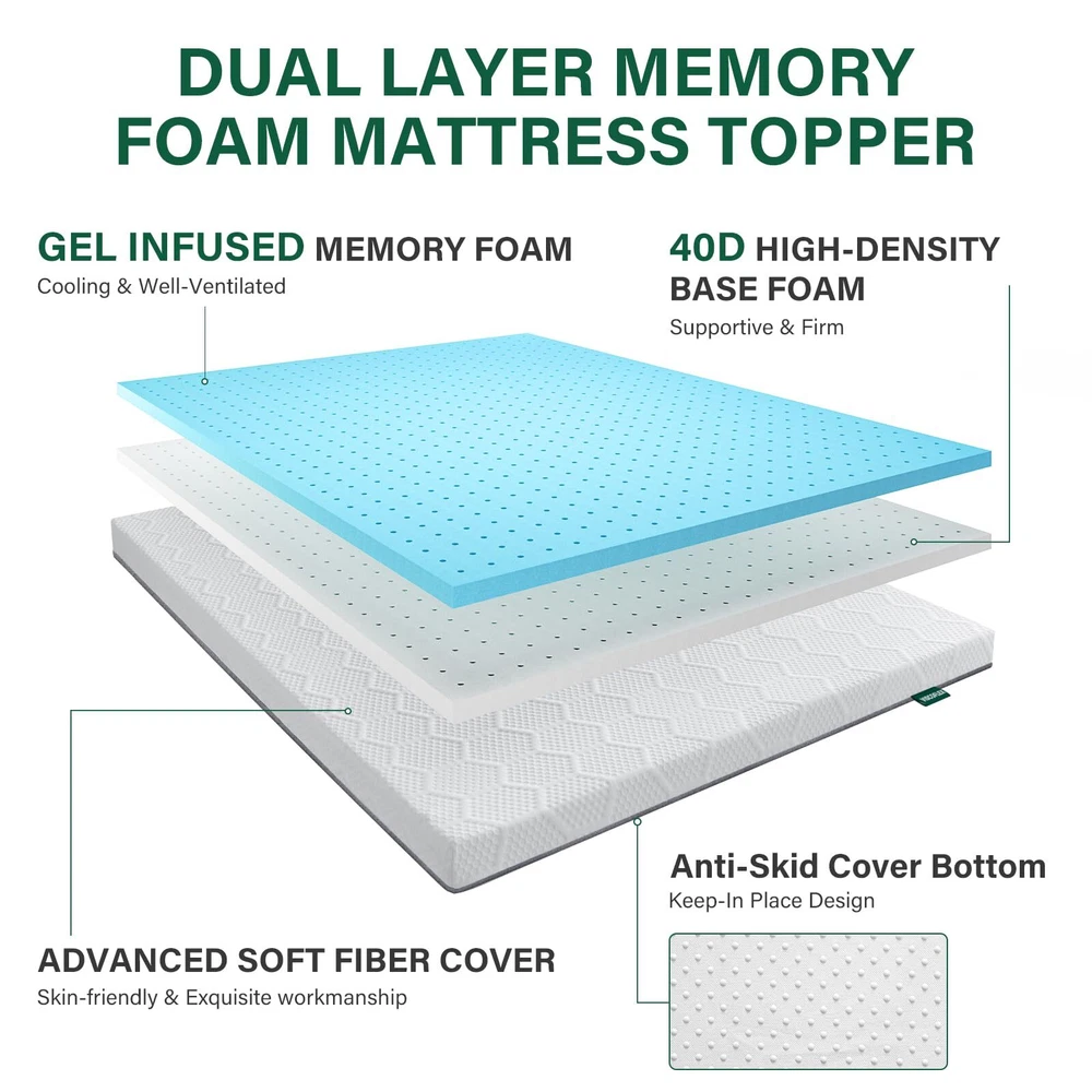 VISCOFLEX 3 Inch Mattress Topper TWIN XL: 38*80, Medium Firm to Firm TWIN XL Mattress Topper 3 Inch for back pain relief, Pressure relief and Balance support DUAL LAYER & OPTIONAL FIRMNESS: Viscoflex mattress topper features a dual-sided design—one side with luxury memory foam for softness, the other with high-density foam for firm support. Flip it to adjust the firmness to your preference and enjoy personalized sleep comfort! BREATHABLE & SKIN-FRIENDLY COVER: Made from Oeko-Tex certified fabric, the Viscoflex mattress topper cover is comfy, skin-friendly, and safe. with a high GSM (260g), it’s durable and smooth to the touch. The breathable design promotes airflow, keeping your sleep environment fresh and comfortable. Plus, the cover is removable, easy to clean, and machine washable without losing its shape PRESSURE RELIEF & SPINAL ALIGNMENT: Our TWIN XL Mattress Topper evenly distributes body weight, relieving pressure on key areas and supporting proper spinal alignment. With optimal firmness, it promotes a healthy sleep posture and reduces pain, enhancing overall sleep quality GEL MATTRESS TOPPER & COMFY SLEEP: Enjoy a cooler, deeper sleep with the Viscoflex gel memory foam mattress topper. Made with premium memory foam and ventilated holes to enhance airflow and dissipate heat, it keeps you cool and comfortable all night long NON-SLIP STRAPS & Affordable Upgrade: The Viscoflex mattress topper features four elastic straps and non-slip beads to stay securely in place. Certified by Oeko-Tex and CertiPUR-US, An affordable way to upgrade your old mattress, our luxury topper enhances comfort and support without the need for a costly replacement