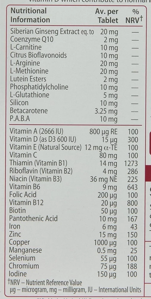 WELLMAN Vitabiotics 50+ is a comprehensive multivitamin and mineral supplement designed specifically for men aged 50 and over. It provides essential nutrients to support overall health, energy levels, and immunity, tailored to the needs of aging men. Key Benefits: Heart Health Support: Includes magnesium, thiamine, and vitamin B1 to promote normal heart function. Energy and Metabolism: B vitamins, iron, and copper help reduce fatigue and support normal energy levels. Immune System: Zinc, selenium, and vitamins C and D contribute to the normal functioning of the immune system. Cognitive Function: Iodine and zinc help maintain concentration and mental sharpness. Bone and Joint Health: Vitamin D, calcium, and magnesium support strong bones and joint health. Vision Support: Vitamin A and zinc help maintain healthy vision. Ingredients: Vitamins: A, D, E, C, B1, B2, B6, B12, folic acid. Minerals: Zinc, magnesium, iron, copper, selenium, chromium. Special Components: Plant extracts and amino acids. Usage Instructions: Take one tablet daily with your main meal, with water. Do not chew. Do not exceed the recommended dose. This formula is specifically developed to meet the nutritional needs of men over 50, supporting an active and healthy lifestyle.