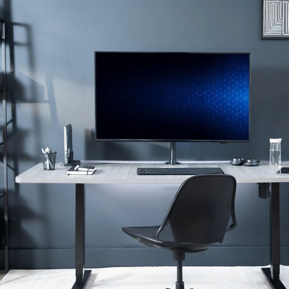 Ultrawide Screen Desk Stand - Fits most ultra-wide monitors, regular monitors, and TV's up to 42??? in size and 22 lbs in weight. This is a standard VESA mount with 75x75mm, 100x100mm, 200x100mm, and 200x200mm mounting holes. Articulation & Height Adjustment - Enjoy ergonomic viewing angles with an adjustable mounting bracket offering +45?? to -45?? tilt, 90?? swivel, 360?? rotation, and height adjustment along the center pole. Your monitor can be placed in portrait or landscape orientation to fit your desired layout. Mounting Options - This solid steel and aluminum stand installs on desks and table surfaces up to 3.25" in thickness via the heavy-duty C-clamp or optional grommet mount. Easy Assembly - All hardware and instructions are provided so you can get your new stand assembled and screen mounted in no time! We've Got You Covered - Sturdy steel design is backed with a 3 Year Manufacturer Warranty and friendly tech support to help with any questions or concerns.