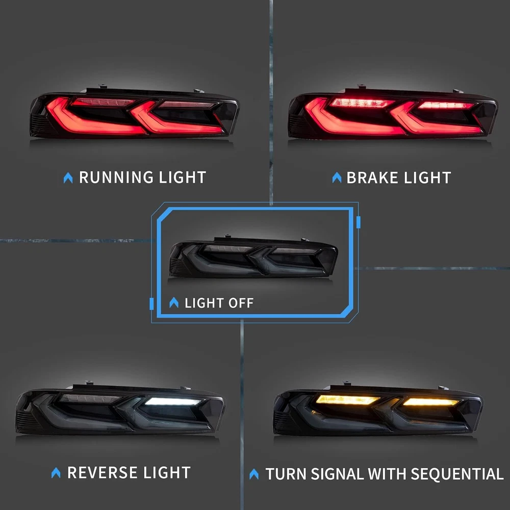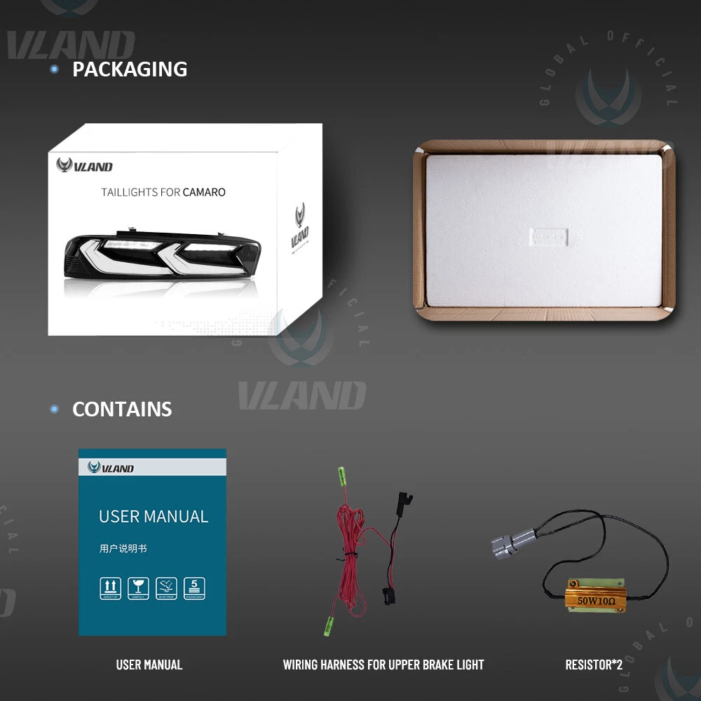 VLAND 2xSmoked LED Tail Lights For 2016-2018 Chevrolet Chevy Camaro Rear Lamps Fitment: Fit For Chevrolet [Chevy] Camaro 2016 2017 2018 (Not fit for European models) Item Features: Lens Color: Smoked Running Light: LED (Red) Brake Light: LED (Red) Reverse Light: LED (Diamond White) Turn Signals: LED (Amber.With Sequential Turn Signal) Full LED Tail Lights, no need bulbs. Description: The package includes: 1 pair of taillights with left and right side . This item has the same connections and wires with the original taillights. It is easy to install still professional installation is recommended. Warranty: One Year You May Also Like: 👇 SPECIFIC SHIPPING ABOUT PAYMENT RETURN SPECIFIC SHIPPING ABOUT PAYMENT RETURN VLAND Headlights VLAND Tail Lights VLAND Combination Set VLAND Bulbs For Chevrolet For Dodge For Ford For Honda For Mitsubishi For Hyundai For Lexus For Toyota For BMW For GMC For Volkswagen For Tesla For Subaru Other On Dec 31, 2024 at 22:02:40 PST, seller added the following information: