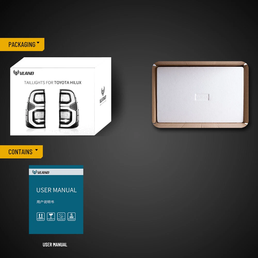 VLAND LED Smoked Tail Lights For Toyota Hilux 2015-2020 W/Start-up Animation INCLUDES: (1) Front Headlight Assembly Right Passenger Side (1) Front Headlight Assembly Left Driver Side Fitment: for 2015 -2020 Toyota Hilux Contact Us SHIPPING & RETURN WARRANTY Contact Us 100% satisfaction goal. If you have had less than 100% positive experience, please contact us, so we can work out a resolution. Your questions will be replied within 24 hours except the weekend and holiday. We will serve for you with all sincerity! SHIPPING & RETURN Shipping Information - Policy The goods will shipped by the eBay address, so please leave the right address on eBay Please, choose some local sellers, If you cannot wait patiently in the shipping time we declared. Once you purchase, please DON’T leave negative or neutral feedback if you haven't received item in 30 days, because we have mentioned the shipping time repeatedly. If you not satisfied with the goods please contact us before leave the feedback, we will try ourbest to satisfy you. Standard Order Processing time: W e'll update you when proceeding with your order from (Monday - Friday). Payment cleared/received on Friday will be shipped on the next business days (Monday or Tuesday). We are not responsible for carrier transit time. This information is provided by the carrier and excludes weekends and holidays. Note that transit times may vary, particularly during peak periods or in climate weather conditions, and that delivery times frames will need to be extended for any processing time frames in excess of 2-3 business days. WARRANTY Standard Replacement Specifically excluded from this warranty are failures caused by misuse, negligence, modification, abuse, improper application, installation or operation, or by unauthorized service or use of unauthorized parts in connection with the product and inadequate maintenance, normal wear and tear or normal consumption of the product. One time replacement Customers are responsible for the return shipping cost on warranty claims. We will refund you the money you paid for the parts less shipping and handling charges Please Note: - We also have more models available, please contact us if you can't find your specific model. - When products are noted in the description as out of stock, these products will then be offered as pre-sale items, normally they will be posted within 20 days from the date of cleared payment. - Item sold in a pair (left and right), bulbs may or may not be provided. On Jan 13, 2025 at 21:45:40 PST, seller added the following information: