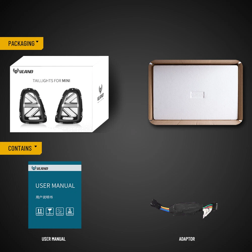 VLAND LED Tail Lights For 2007-2013 Mini Cooper R56 R57 R58 R59 W/Sequential Part #: 63212751307, 63212757009, 63212751308, 63212757010, 63212753625, 63212757011, 63212753626, 63212757012 INCLUDES: (1) Front Taillight Assembly Right Passenger Side (1) Front Taillight Assembly Left Driver Side Fitment: Mini Cooper R56 R57 R58 R59 2007 2008 2009 2010 2011 2012 2013 Mini Hatch(R56) 2007-2013 Mini Cabrio(R57) 2009-2015 Mini Coupé(R58) 2011-2015 Mini Roadster(R59) 2012-2015 Contact Us SHIPPING & RETURN WARRANTY Contact Us 100% satisfaction goal. If you have had less than 100% positive experience, please contact us, so we can work out a resolution. Your questions will be replied within 24 hours except the weekend and holiday. We will serve for you with all sincerity! SHIPPING & RETURN Shipping Information - Policy The goods will shipped by the eBay address, so please leave the right address on eBay Please, choose some local sellers, If you cannot wait patiently in the shipping time we declared. Once you purchase, please DON’T leave negative or neutral feedback if you haven't received item in 30 days, because we have mentioned the shipping time repeatedly. If you not satisfied with the goods please contact us before leave the feedback, we will try ourbest to satisfy you. Standard Order Processing time: W e'll update you when proceeding with your order from (Monday - Friday). Payment cleared/received on Friday will be shipped on the next business days (Monday or Tuesday). We are not responsible for carrier transit time. This information is provided by the carrier and excludes weekends and holidays. Note that transit times may vary, particularly during peak periods or in climate weather conditions, and that delivery times frames will need to be extended for any processing time frames in excess of 2-3 business days. WARRANTY Standard Replacement Specifically excluded from this warranty are failures caused by misuse, negligence, modification, abuse, improper application, installation or operation, or by unauthorized service or use of unauthorized parts in connection with the product and inadequate maintenance, normal wear and tear or normal consumption of the product. One time replacement Customers are responsible for the return shipping cost on warranty claims. We will refund you the money you paid for the parts less shipping and handling charges Please Note: - We also have more models available, please contact us if you can't find your specific model. - When products are noted in the description as out of stock, these products will then be offered as pre-sale items, normally they will be posted within 20 days from the date of cleared payment. - Item sold in a pair (left and right), bulbs may or may not be provided. On Jan 11, 2025 at 00:08:37 PST, seller added the following information: