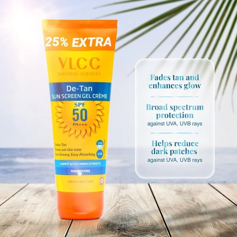 A skin-brightening and sun-protecting formulation, this de tan sunscreen gel crème is non-greasy that easily absorbs into the skin to help prevent UVA and UVB damage. The long-lasting formulation contains cucumber, carrot, and aloe vera extracts that hydrate and soothes, leaving the skin soft and supple. The SPF50+++ formulation helps fade dark patches making the skin even tone. Helps reduce dark patches, evens skin tone, Broad spectrum protection against UVA, UVB rays. Non Greasy and Easy absorbing. For all skin types. Paraben free.