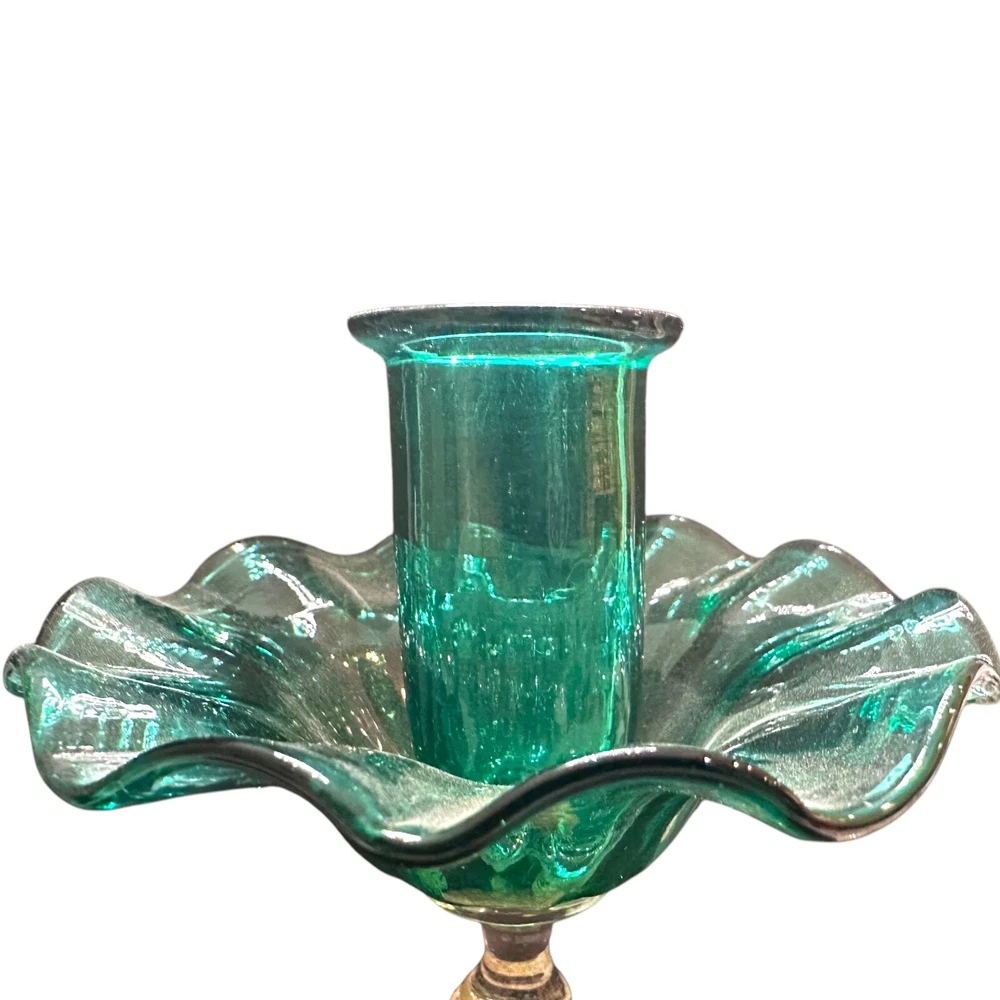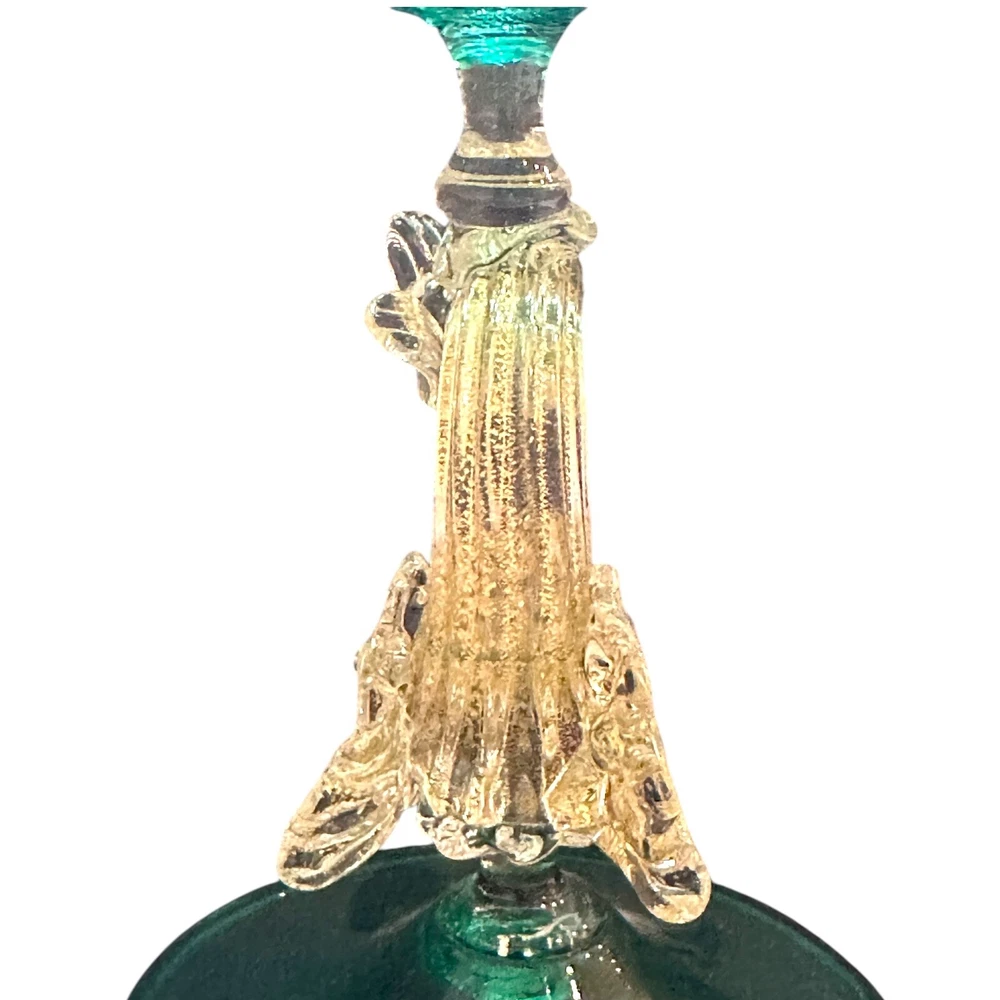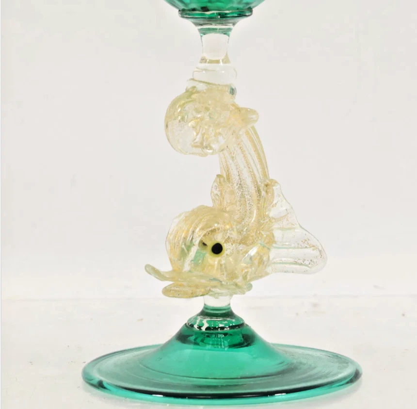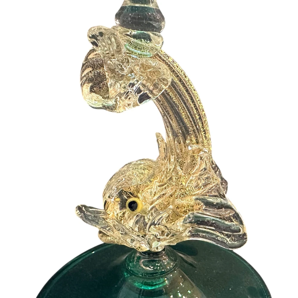Vintage Murano Green Venetian Art Glass Figural Dolphin Candlestick originating on the Venetian Island of Murano is Vetreria Artistic La Fenice di Albertini created by Gianfranco Albertini. Candlestick measures 5ʺW × 5ʺD × 8.75ʺH and employs bright green glass symbolizing the Grand Canal waters. Dolphin is made with gold dust inclusions known as Aventurine. History Major Vintage provides a reliable, honest, and transparent experience for our buyers. We've endeavored to describe all items to the best of our knowledge. We're collectors, buyers and sellers who ship fast at a low cost to our customers. Most items are cleaned before being photographed and listed. Please don’t hesitate to contact us with any comments, questions, concerns or corrections. We love hearing from you!