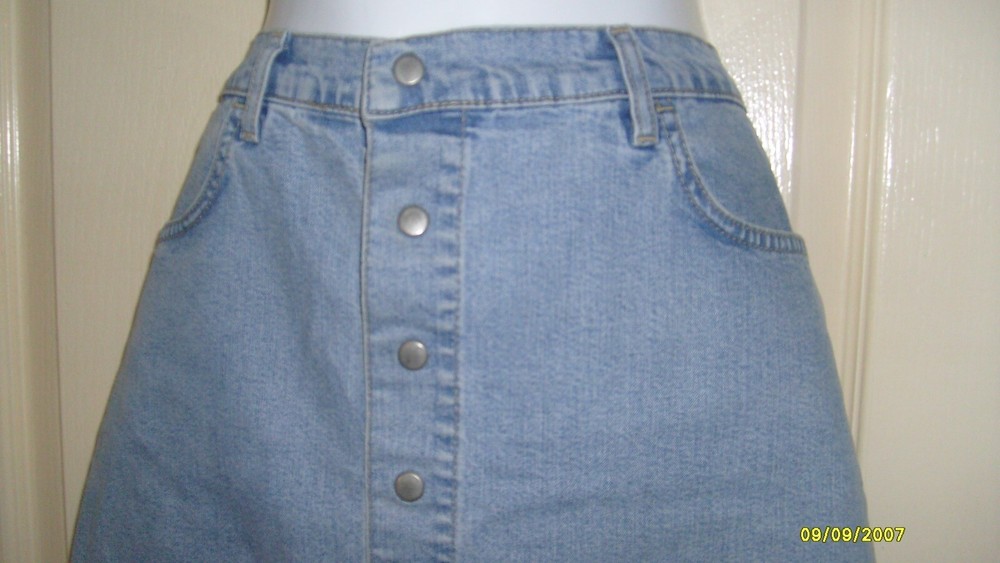 HERE I HAVE A VOI DENIM LINE DESIGNER CASUAL LIGHT BLUE COLOURED SHORT SKIRT IN SIZE LABEL SAYS 12. THIS SKIRT FASTENS WITH SILVER PRESS STUDS DOWN THE FRONT AND HAS FRONT AND BACK POCKETS. THIS SKIRT MEASURES 16 1/2" INCHES LONG. IN GOOD CONDITION!!!