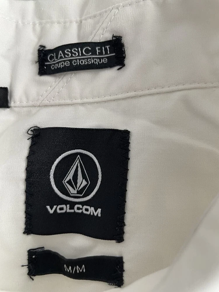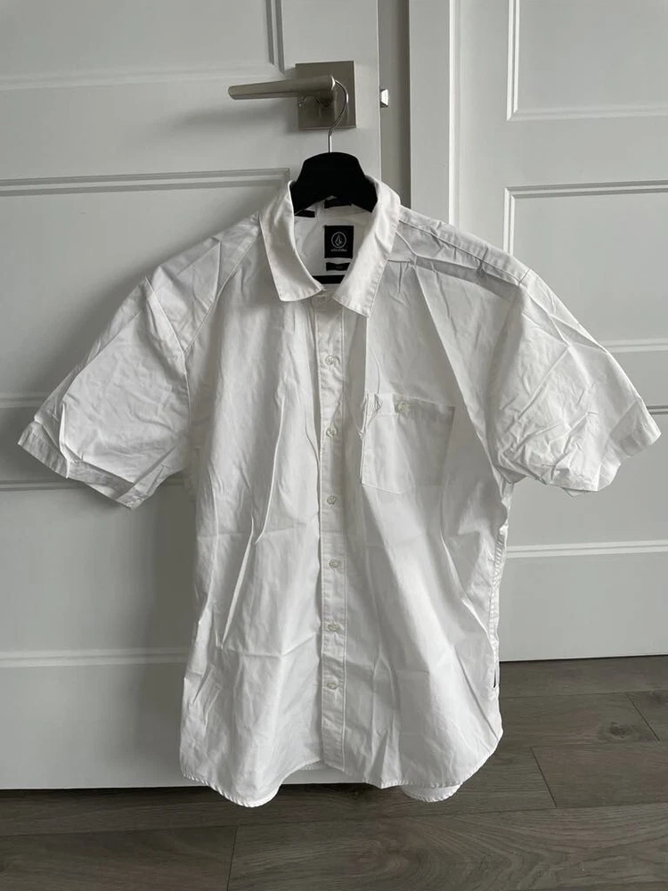 Pattern: Solid Fit: Classic Fabric Wash: Medium Type: Dress Shirt Department: Men Sleeve Length: Short Sleeve Size: Medium Color: White Size Type: Regular Closure: Button Brand: Volcom