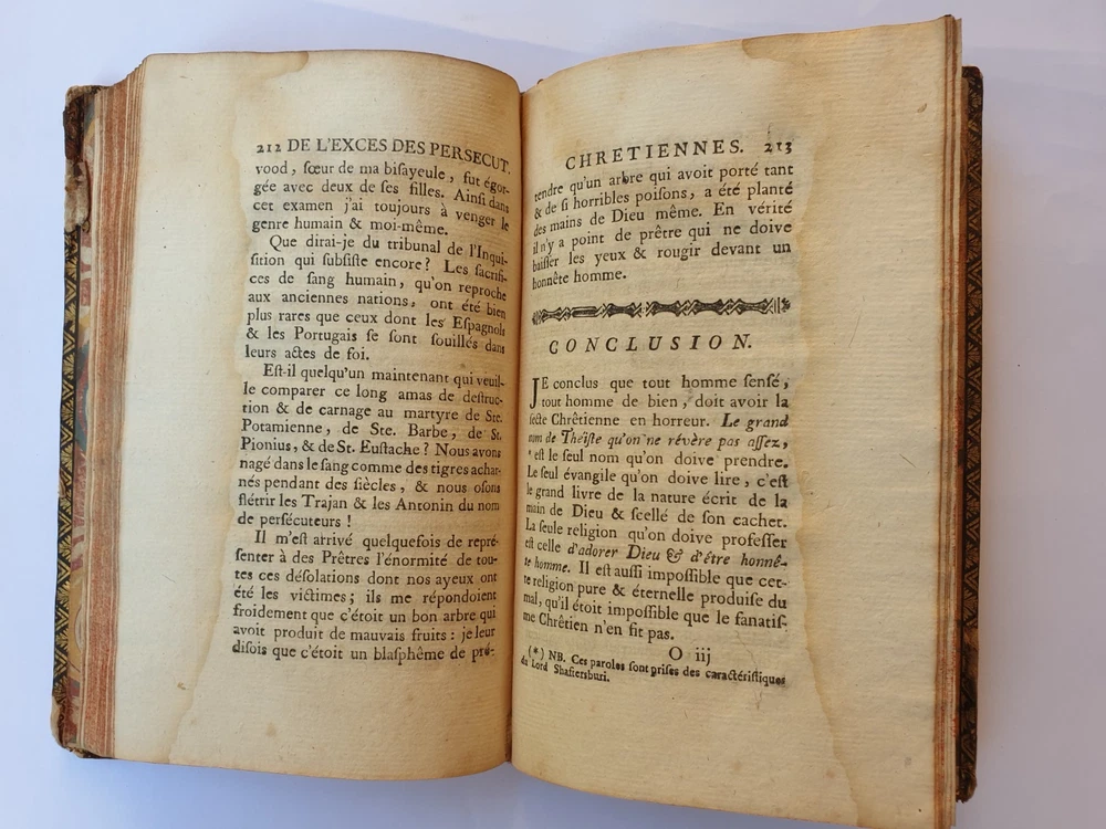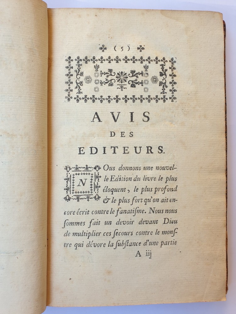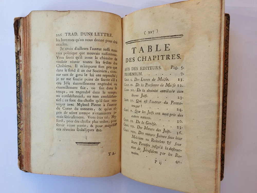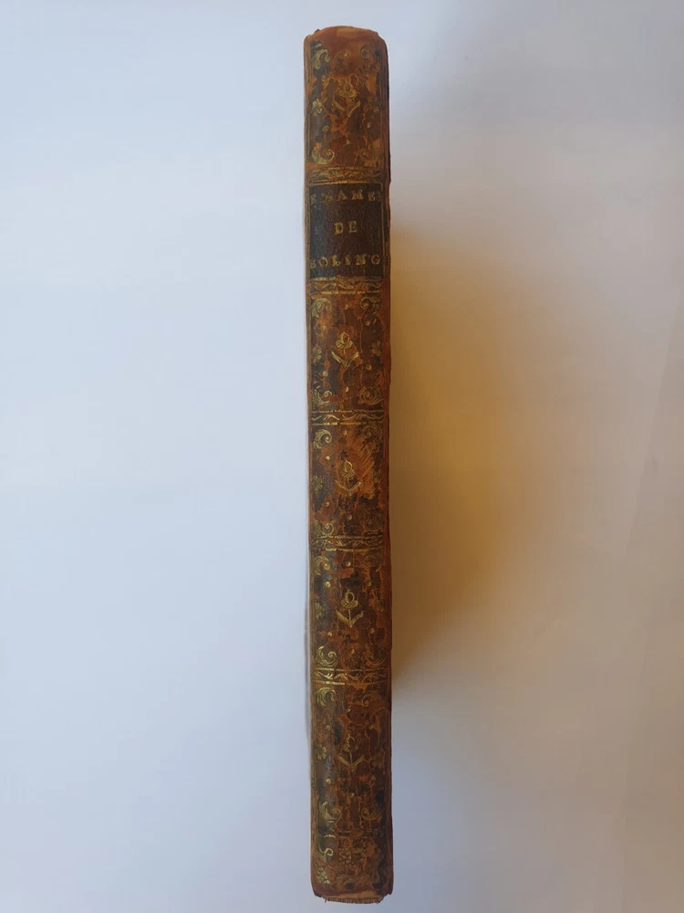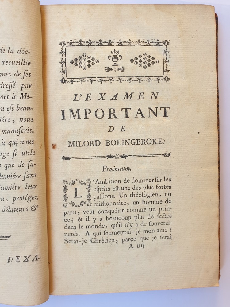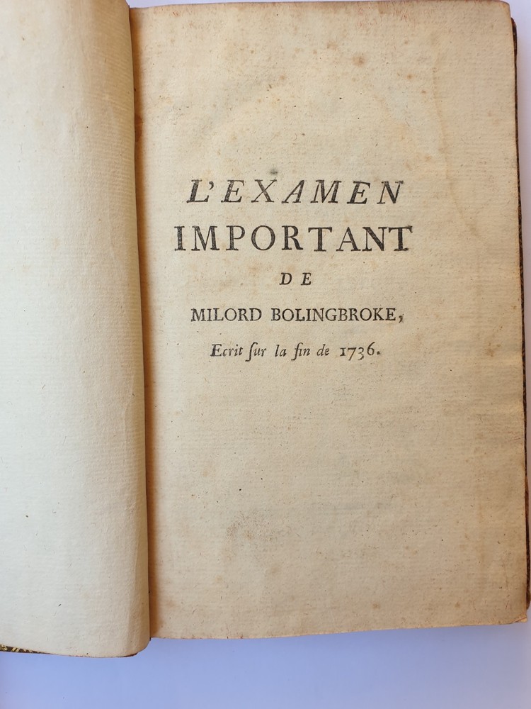 " L'examen important de Milord Bolingbroke: ecrit sur la fin de 1736 " Author: Voltaire Publication: (Genève : Cramer,), 1767 First edition. Description: 200x 128mm. 230 pages. With "Avis des éditeurs", "Proemium", "Conclusion", and "Traduction d'une lettre de Mylord Bolingbroke à Mylord Cornsbury" Chapter IX misnamed Chapter X, so 36 chapters instead of 37 mentioned in the table. For condition, please see pictures.