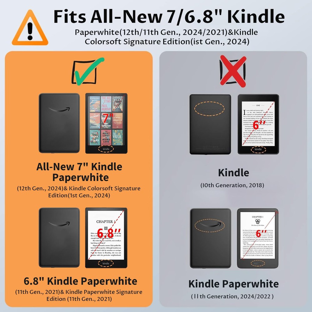 [Precision-Fit Kindle Paperwhite 7"/6.8" Cover]: Designed exclusively for Amazon All-New Kindle Paperwhite and Kindle Colorsoft Signature Edition E-Reader (7"/6.8", 12th/11th Generation, 2024/2021 Release) which will not fit any other generation Kindle devices. Please check the 2nd picture [Hands-Free Book Reading Stand]: With a foldable stand design so you can set it on the table and read without having to hold it, the cover folds back and secures to the back of the case. Adjustable hand strap allows you to hold your tablet with one hand when you are laying down or getting out [Auto-wake/sleep]: Wake or put your device to sleep by opening or closing the cover. Magnetic clasp ensures the cover is securely closed, secures your device without straps covering the front; Build-in card slot is convenient to store your cards; Easy access to charge and turn on/off [Premium PU Leather Protection]: This stylish and colorful case for Kindle Paperwhite 12th/11th Generation readers is made with high-quality PU leather that offers durable protection against scratches, dirt, scuffs, water splashes, and shock damage [Thoughtful Gift Idea for Readers]: VORI case and cover for Kindle Paperwhite 2024/2021 is a smart gift choice for anyone who loves reading, especially travelers who never leave their digital books behind. Get one for friends or loved ones who use a 7"/6.8" Kindle reader