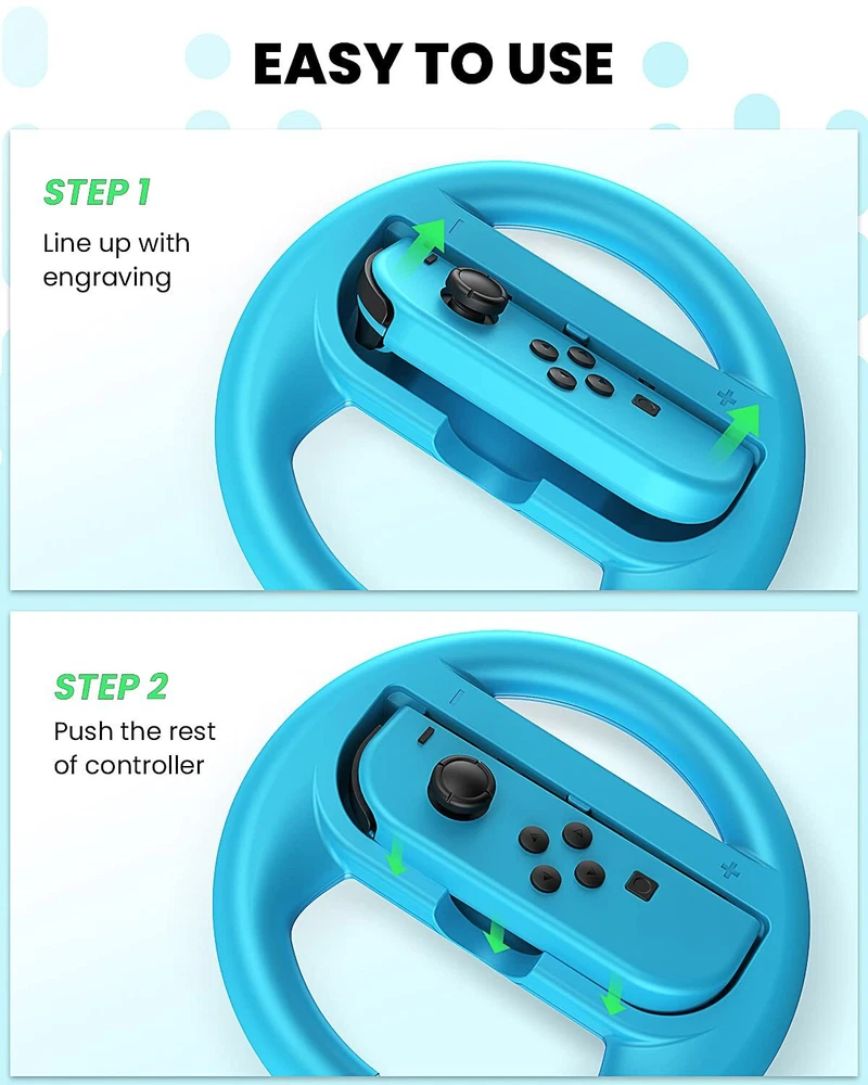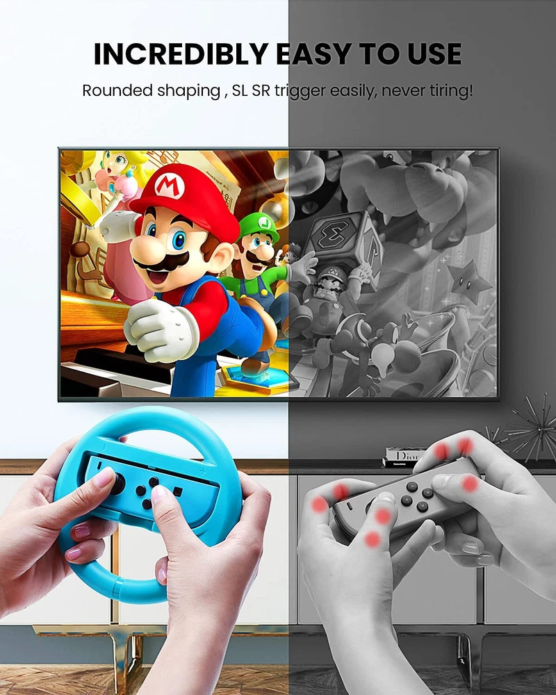 VOYEE Steering Wheel Compatible with Nintendo Switch Wheel, Family Use Accessori Features: 【UNIVERSAL COMPATIBILITY】VOYEE steering wheel compatible with switch joycon,which has better hand grip feeling and works perfectly for ALL interactive games like Mario Kart 8 Deluxe, Snipperclips and so much more! 【EASY TO TRIGGER & FEEL】Compatible with nintendo switch racing wheel to drift and get boost in Mario Kart, our wheel packs added trigger shoulder, matches your - & + buttons accurately, easily for you to feel the track, every children and adults are talented player! 【ERGONOMICS TOUCHING SURFACE】Compatible with nintendo switch steering wheel passed thousand-time testing, selected ZERO fingerprint materials, made of US Standard ABS plastic with curved handle, players feel more comfortable than using original controller, just gaming the way you like. 【FUN FOR MULTIPLEPLAYER MODE】Compatible with switch steering wheel a palm size designed allows you to carry and share it with your family and friends at any time. Everyone can swing hands and body, the gaming moment will be more fun and surprising! 【VOYEE'S SERVICE ASSURANCE】VOYEE have confidence in our products’ build quality, we offer 18-month quality assurance. Our customer service is happy help you out within 24 hours, your 100% satisfaction is our pursue! * Package include: VOYEE steering wheel pair compatible with Switch Joycon x 2 pack. Features: 【UNIVERSAL COMPATIBILITY】VOYEE steering wheel compatible with switch joycon,which has better hand grip feeling and works perfectly for ALL interactive games like Mario Kart 8 Deluxe, Snipperclips and so much more! 【EASY TO TRIGGER & FEEL】Compatible with nintendo switch racing wheel to drift and get boost in Mario Kart, our wheel packs added trigger shoulder, matches your - & + buttons accurately, easily for you to feel the track, every children and adults are talented player! 【ERGONOMICS TOUCHING SURFACE】Compatible with nintendo switch steering wheel passed thousand-time testing, selected ZERO fingerprint materials, made of US Standard ABS plastic with curved handle, players feel more comfortable than using original controller, just gaming the way you like. 【FUN FOR MULTIPLEPLAYER MODE】Compatible with switch steering wheel a palm size designed allows you to carry and share it with your family and friends at any time. Everyone can swing hands and body, the gaming moment will be more fun and surprising! 【VOYEE'S SERVICE ASSURANCE】VOYEE have confidence in our products’ build quality, we offer 18-month quality assurance. Our customer service is happy help you out within 24 hours, your 100% satisfaction is our pursue! * Package include: VOYEE steering wheel pair compatible with Switch Joycon x 2 pack. eBay integration by