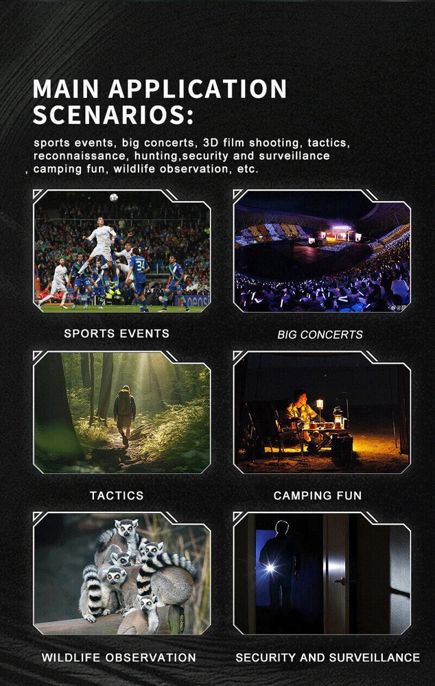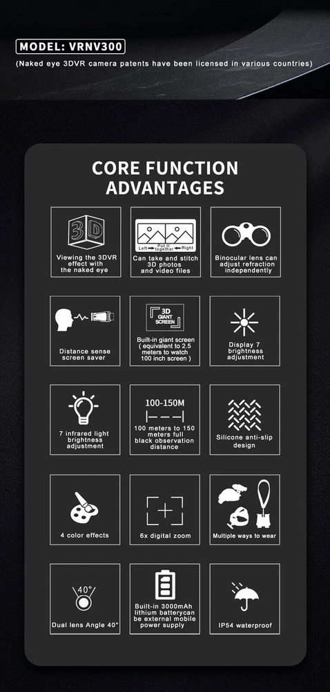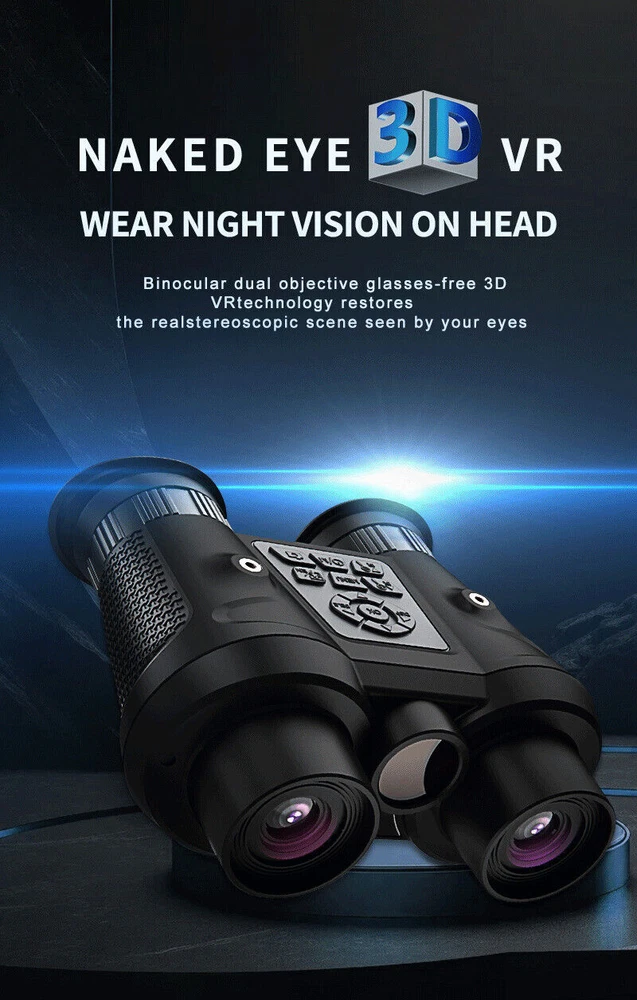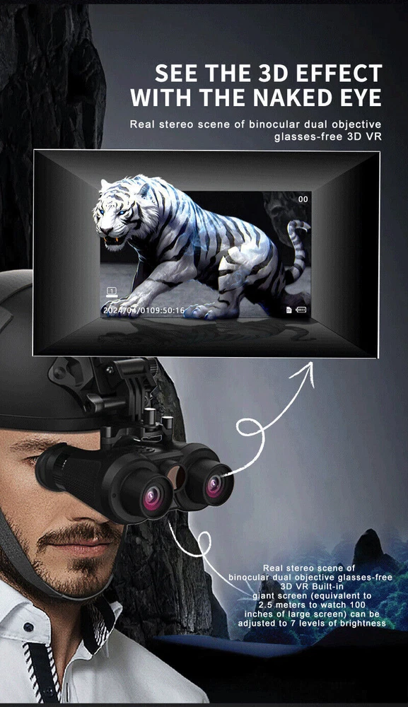 Specifications: 3D image resolution :8064x3024, 7840x2940, 6528x2448, 5184x1944, 4096x1536, 3200x1200, 2560x960, 1280x360 night vision enhancement 3D video resolution :3840x1080, 2880x1080, 2560x720, 1280x360 night vision enhancement Video frame rate: automatic / 5 FPS / 10 FPS / 15 FPS / 20 FPS / 25 FPS / 30 FPS, can choose according to different scenarios set up different frame rate (the lower frame rate, the higher the night vision brightness) Lens: Dual lens, F1.2 wide aperture, f=25mm, FOV 32 degrees, automatic infrared filter Display: Built-in giant screen, equivalent to 2.5 meters to watch 100 inches of large screen, 7 brightness adjustment Memory card: Dual TF card, up to 32GB USB port :TYPE-C Automatic shutdown: Off /1 minute / 3 minutes / 5 minutes / 10 minutes Infrared light :3W, 850nm strong infrared spotlight, 7 levels of infrared adjustment Distance screen saver: The screen is turned on when viewing near the eyepiece, and the screen is turned off when leaving the eyepiece to save power Visual range in total darkness: about 100-150 meters Low light visual distance :1.5 m ~ infinity Digital zoom: 6x digital zoom Color effects: color, black and white, luminous green, infrared light Power supply :3000mAh polymer lithium battery Language: Multiple languages are available Date stamp: Supports setting date and time. Date and time stamps on photo and video files Operating buttons :11 buttons Operating temperature :-20℃ to +50℃ Storage temperature :-30℃ to +60℃ Size and weight: Approx. 126*125*58mm/TDB g Features: ♦ Binocular binocular naked eye 3DVR technology, restore the real stereoscopic scene seen by the human eye (naked eye 3DVR camera patent has been authorized in various countries) ♦ 3DVR effect can be viewed, and 3D photos and video files can be shot ♦ Built-in giant screen, equivalent to 2.5 meters to watch 100 inches of large screen, 7 brightness adjustment ♦ Fully independent binocular technology can independently adjust the vision compensation of the left and right eyes (refractive adjustment range +/-4, suitable for vision compensation adjustment of 400 degrees of nearsightedness/farsightedness) ♦ With distance sense screen saver function, the display opens when watching near the eyepiece, and the display switches off when leaving ♦ Small size, light weight, a variety of portable use, strap on the neck, strap portable head wear, tactical helmet head wear ♦100 m ~150 m full black observation distance, 1.5 m ~ infinite weak light observation shooting distance ♦ Built-in 3000mAh lithium battery, rechargeable ♦ High-power infrared light, 7 brightness adjustment ♦4 color effects: color, black and white, moonlight green, infrared light ♦IP54 waterproof rating Main application scenarios: sports events, large-scale concerts, 3D film shooting, tactics, reconnaissance, hunting, security and surveillance, camping fun, wildlife observation, etc. The package includes: Binoculars *1 USB cable *1 Portable headband holder *1 Instructions *1 About Us Payment and Shipping: 1. we only accept PayPal payment. 2. We will ship your order within 5 days. Please make sure your shipping address and phone number are correct. Returns 1. If the item arrives with defects or errors, before you start the return process, please contact us via ebay message and we will provide you with a satisfactory solution. Communication is always the best way to solve problems. 2. If you do not receive your item on time, please contact us for further assistance. Feedback and Contact Us 1. we always try to provide every customer with the best service and the best quality products, but sometimes there may be accidents, if you are not satisfied with our goods or services, please feel free to leave a message to contact us, we believe we can solve all the problems for you. Please do not feel free to leave negative feedback. 2.If you are satisfied with our products, we also hope you can give us a five-star positive feedback. We will be grateful for that. About tariffs 1. Import duties, taxes and charges are not included in the item price or shipping cost, these charges are collected by the customs of your country. Buyers are responsible for paying import duties and taxes themselves, as stipulated by eBay. 2. Please check with your country's customs office before purchasing to determine these additional customs fees.