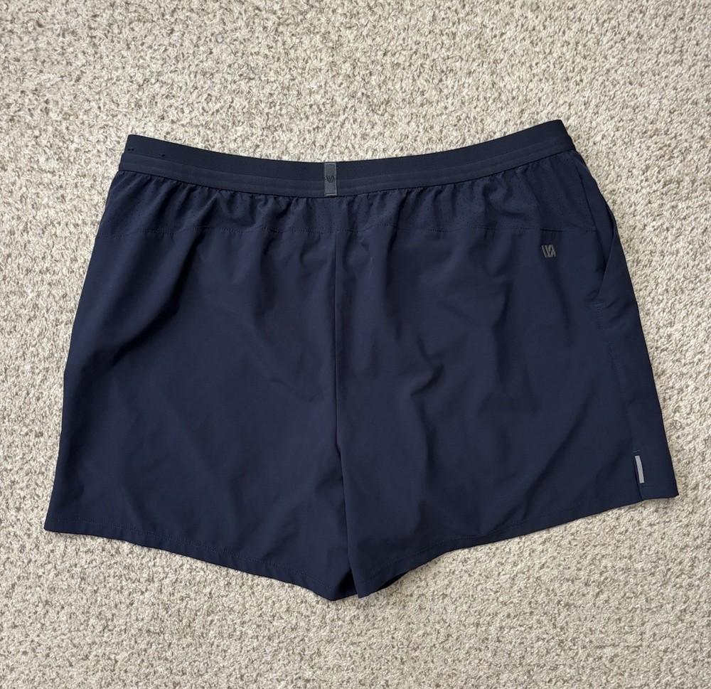 The VRST Shorts for men in size XL are designed for running and other athletic activities. These dark navy blue shorts feature a 5-inch inseam with an elastic waist and drawstring closure for a comfortable and secure fit. Made from a blended fabric of polyester and spandex, they are lightweight, quick-drying, and moisture-wicking, making them ideal for summer, fall, and spring seasons. The reflective details add visibility during low-light workouts, while the solid pattern and athletic style make them suitable for outdoor sports activities. Perfect for gym training and jogging, these shorts are a versatile addition to any activewear collection.