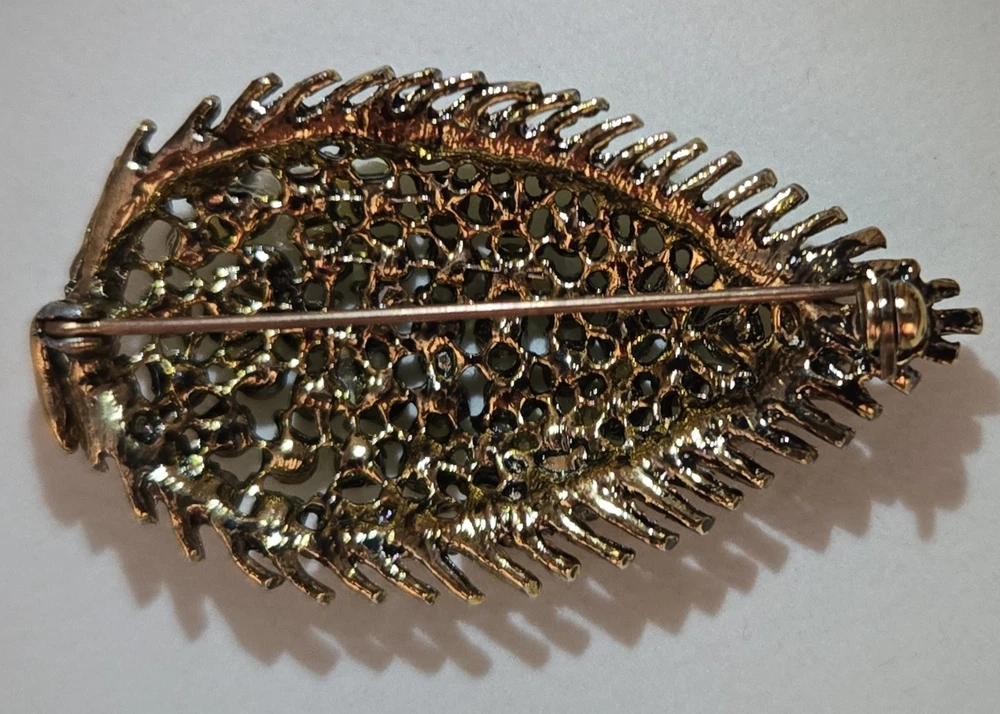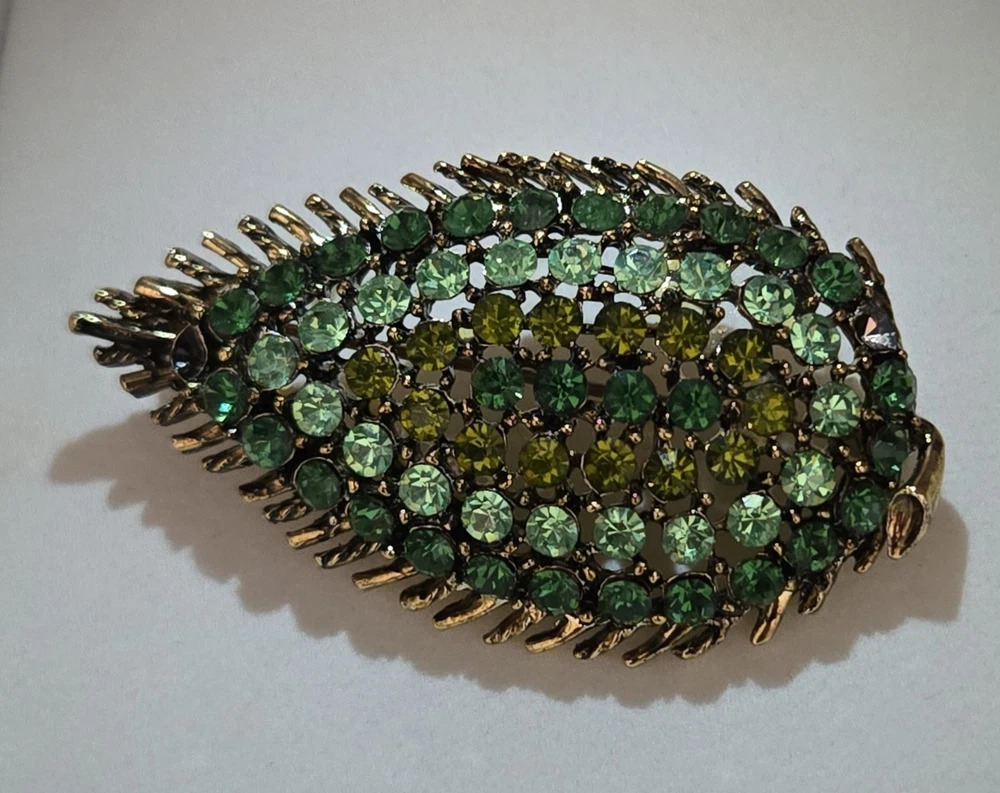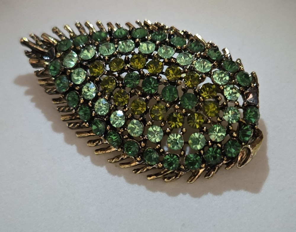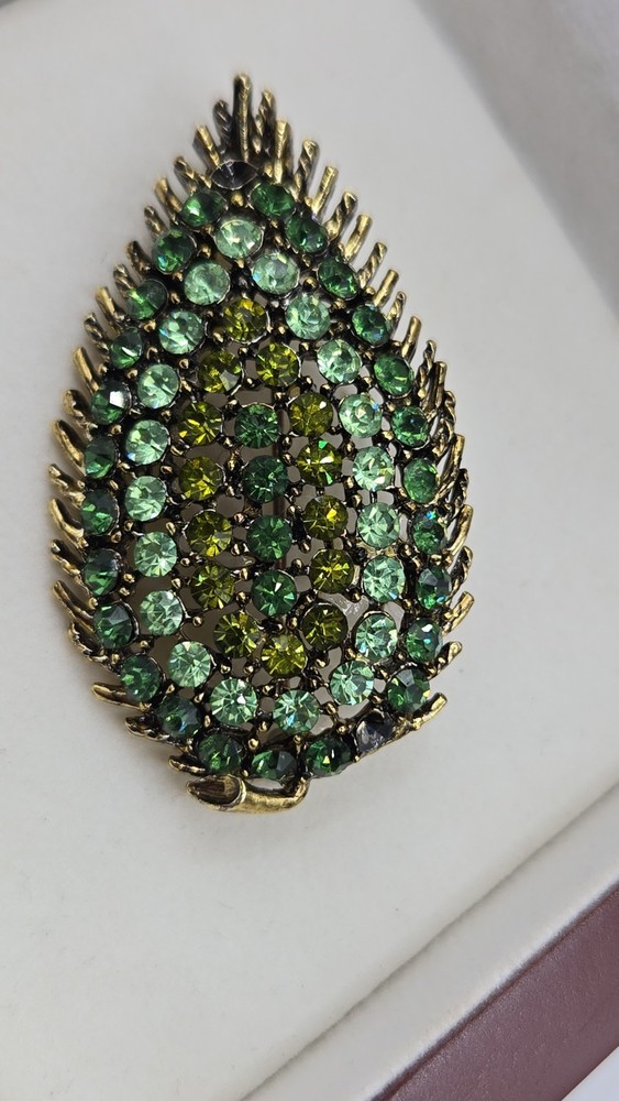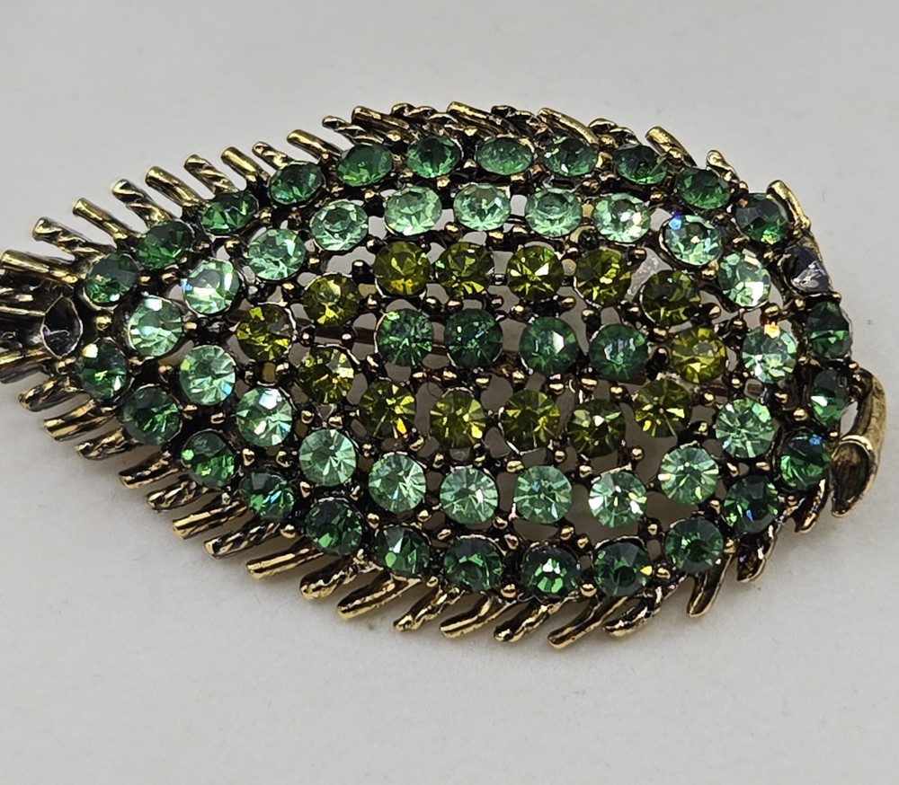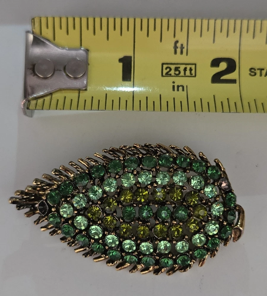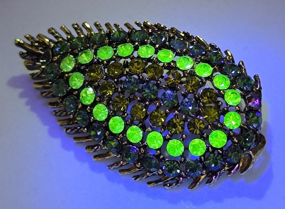 Awesome vintage leaf brooch loaded with shimmering green and yellow rhinestones — several of which fluoresce brightly under UV light, confirming they’re uranium glass! Classic atomic-era sparkle in a gold-tone setting with spiked leaf edges and great visual texture. This piece dates to the 1950s–60s and measures about 2 inches long. Please note: one rhinestone is missing (see photos), but all others are securely in place and still shine beautifully. The clasp works perfectly. Highlights: Glows under blacklight – uranium-tested Classic mid-century atomic leaf shape Mix of green and yellow vintage rhinestones Gold-tone metal backing Size: Approx. 2” Condition: One stone missing; vintage wear consistent with age Perfect for collectors of uranium jewelry, fans of kitschy mid-century design, or anyone who loves jewelry with a glow!