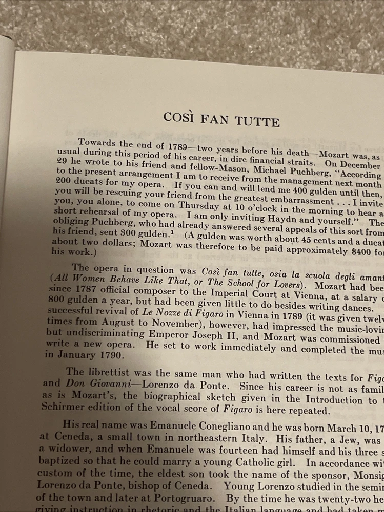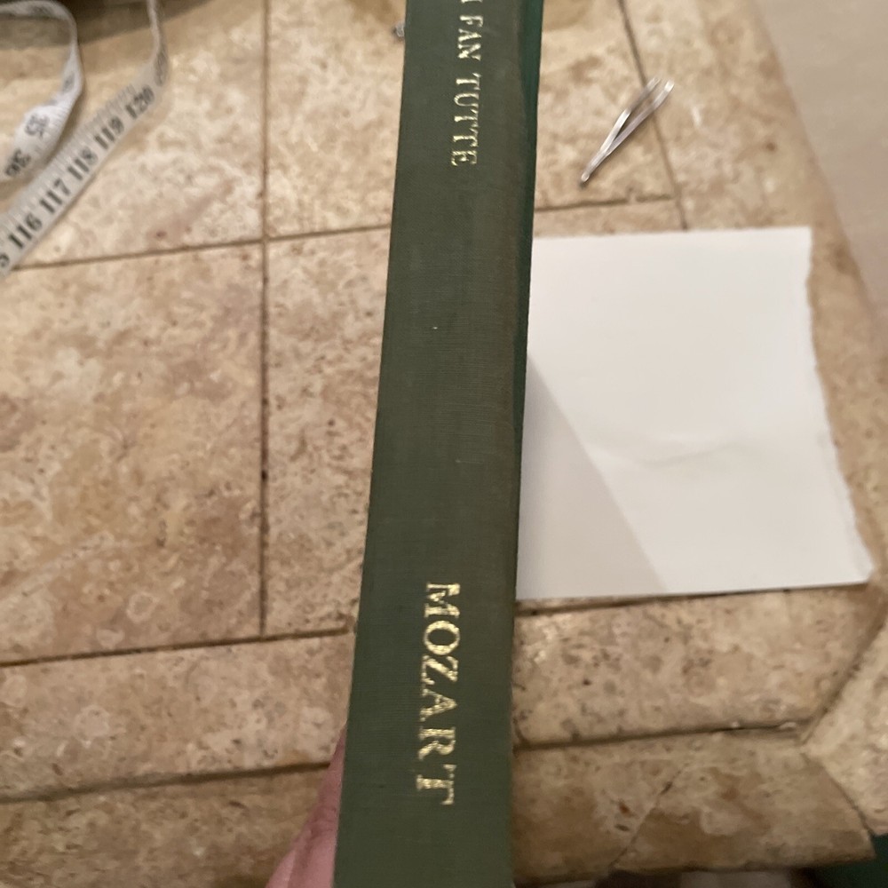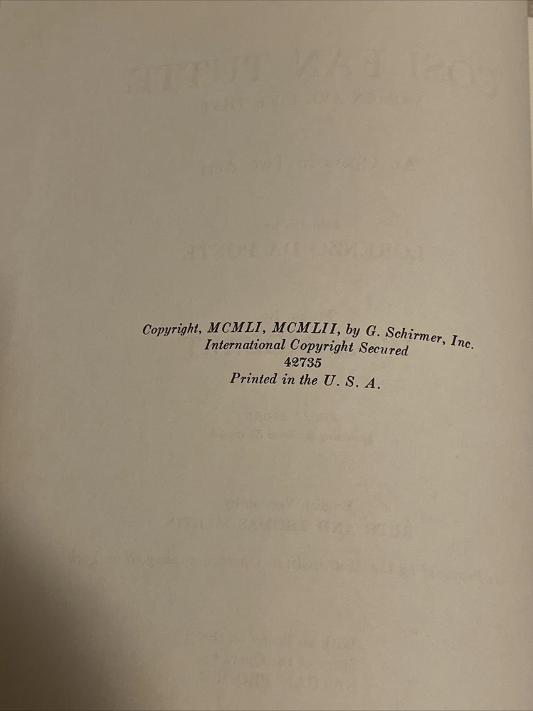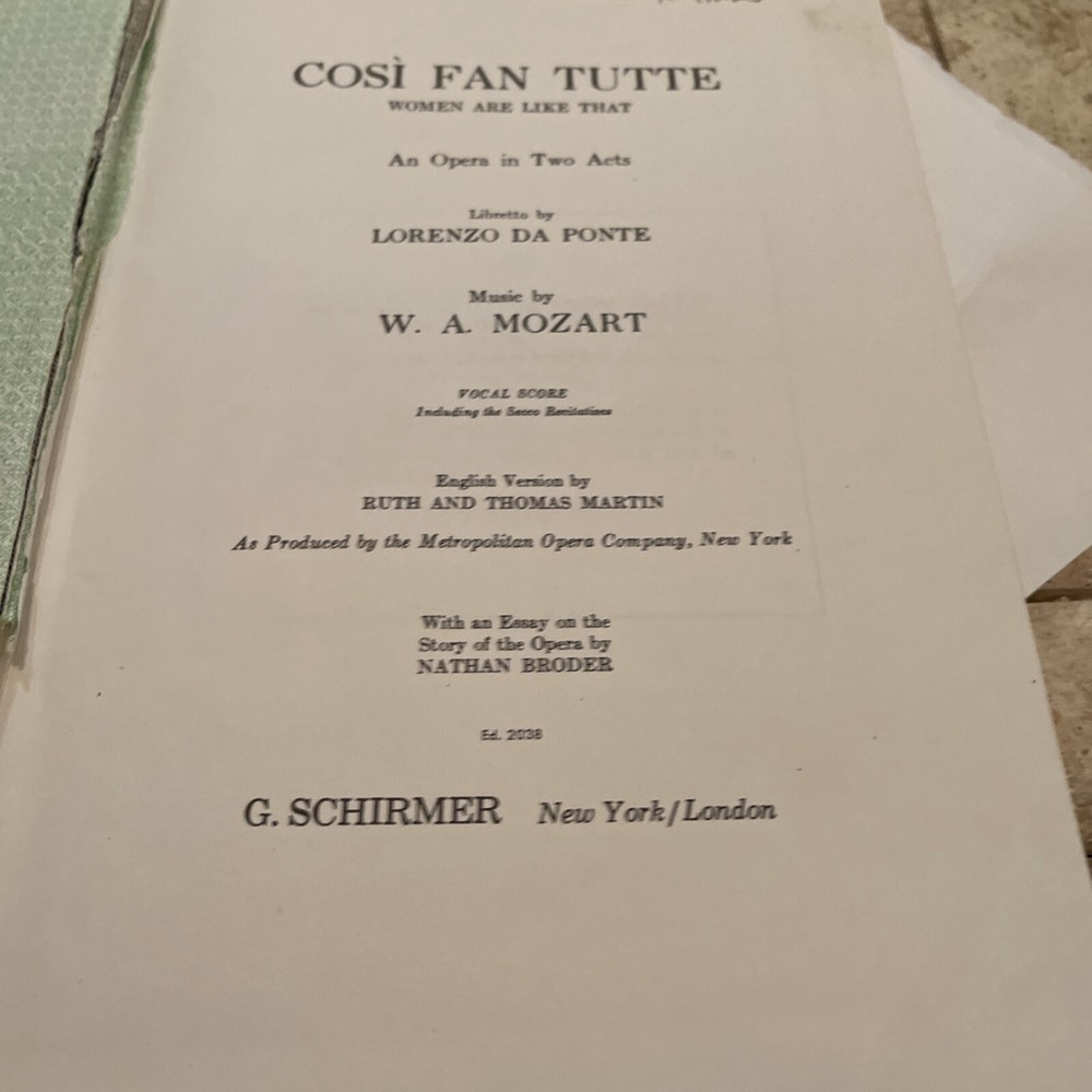his is a collectible vintage vocal score of Wolfgang Amadeus Mozart's beloved two-act opera, Così Fan Tutte (Women Are Like That), published by G. Schirmer . This edition features the complete vocal score with a piano reduction and includes both the original Italian text and the English translation by Ruth and Thomas Martin . Composer : Wolfgang Amadeus Mozart. Publisher : G. Schirmer, Inc. (New York). Copyright/Publication Date : 1951 (Note: Some printings of this edition are dated 1952). Format : Hardcover (Green cloth binding). Language : Italian and English. Content : Includes a piano reduction of the orchestral score and an essay on the story of the opera by Nathan Broder.
