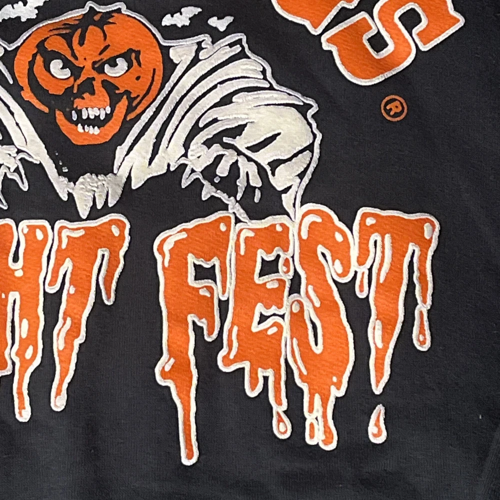 Embrace the thrill of vintage amusement park merchandise with this classic 1980s Six Flags Fright Fest Pumpkin Sweatshirt. This black pullover features a striking graphic print that captures the essence of Halloween and the horror theme parks of yesteryear. Designed with a comfortable crew neck and long sleeves, it's a perfect addition for any fan of seasonal events and vintage apparel. Crafted from soft, knit cotton, this sweatshirt is machine washable for easy care and is built to last through all seasons, from the cool autumn leaves to the warm summer nights. With its regular fit in a size 2XL, it offers both style and comfort for walking and hiking adventures or simply for everyday wear. This unique piece is a must-have for collectors and enthusiasts alike.