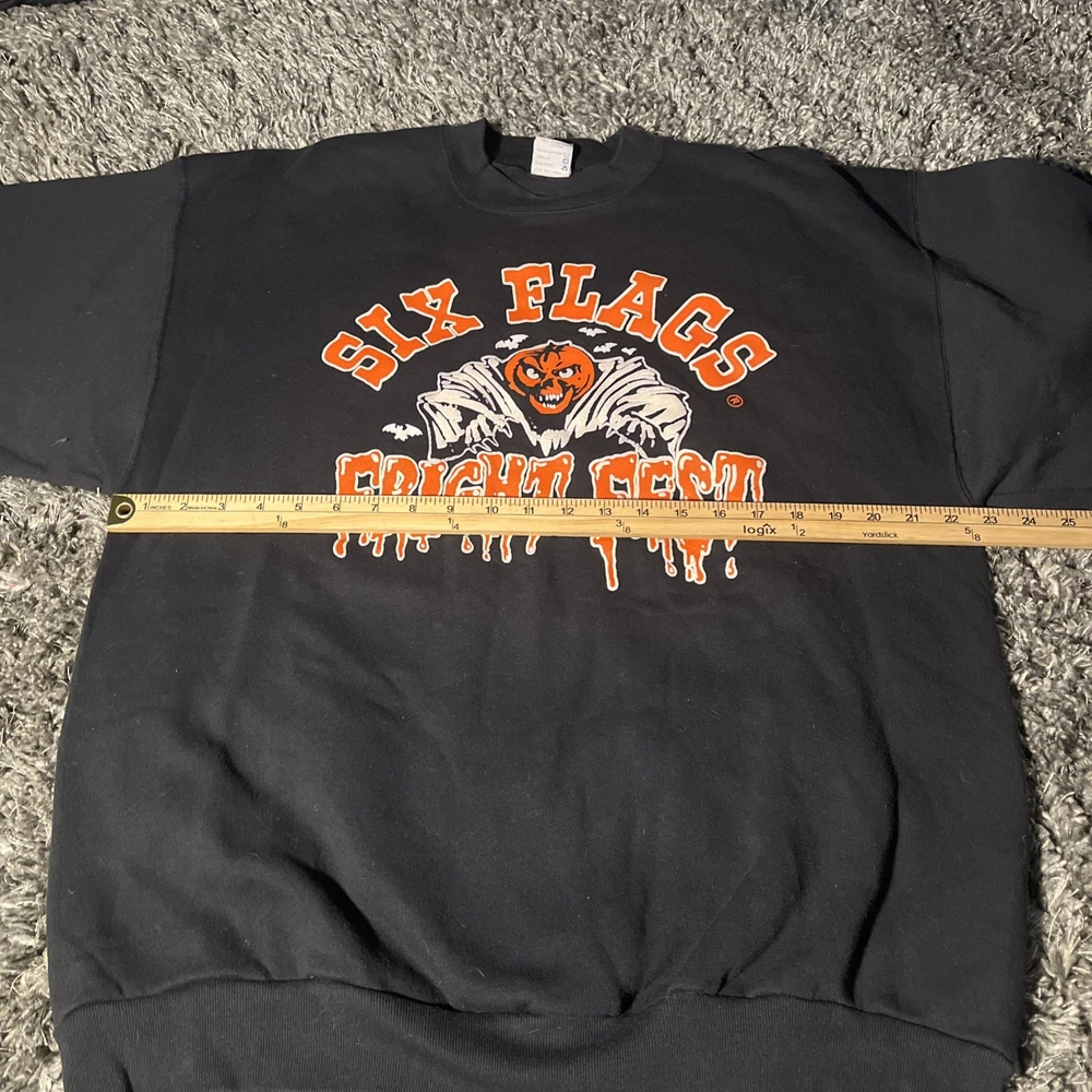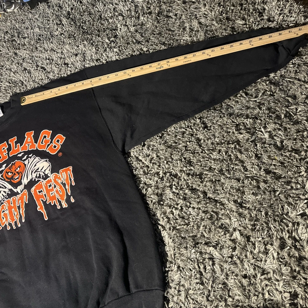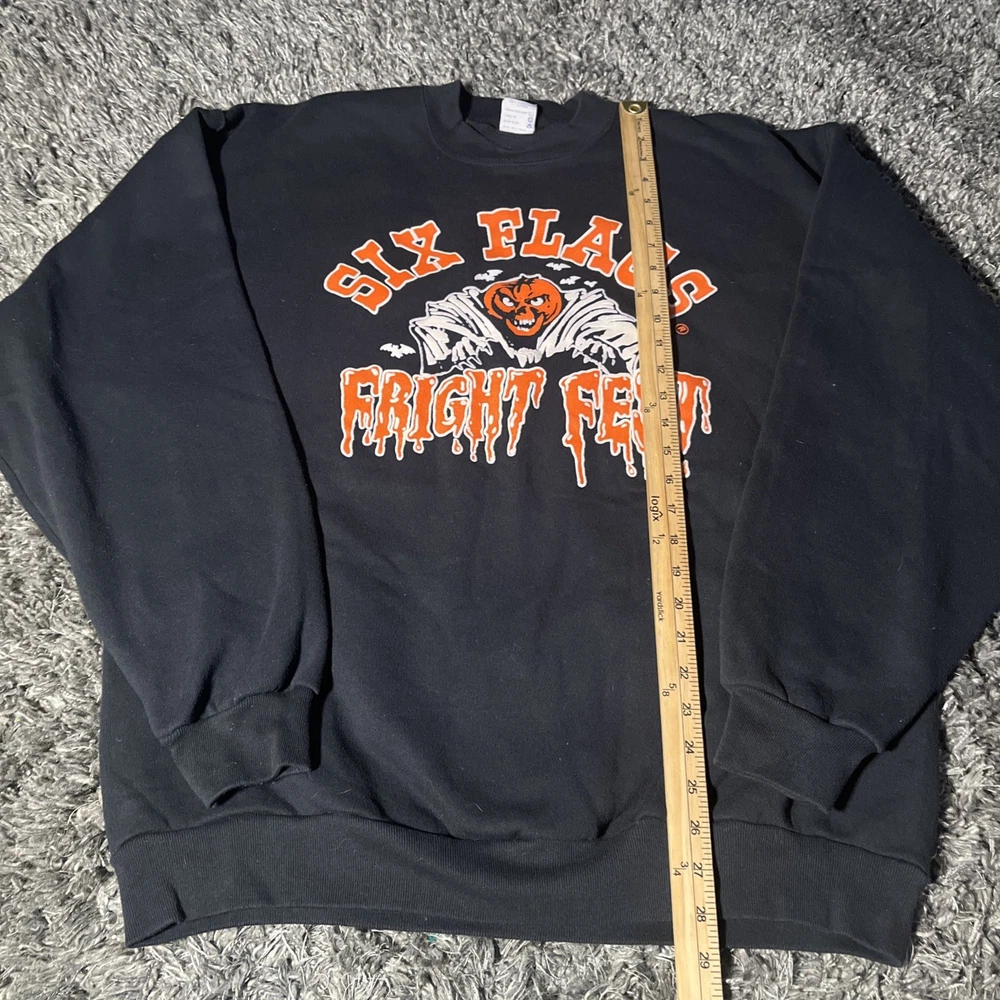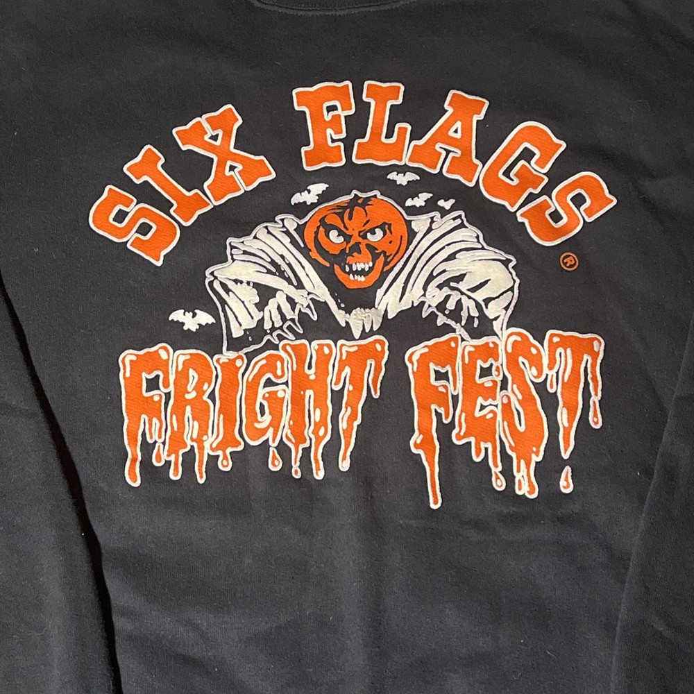 Style: Pullover Garment Care: Machine Washable Brand: Six Flags Fit: Regular Pattern: Graphic Print Size Type: Regular Sleeve Length: Long Sleeve Performance/Activity: Walking, Hiking Vintage: Yes Neckline: Crew Neck Fabric Type: Knit Type: Sweatshirt Department: Men Material: Cotton Country/Region of Manufacture: United States Theme: Halloween, Horror, Amusement Park Season: Fall, Spring, Winter, Summer Color: Black Size: 2XL Features: Graphic Print, All Seasons