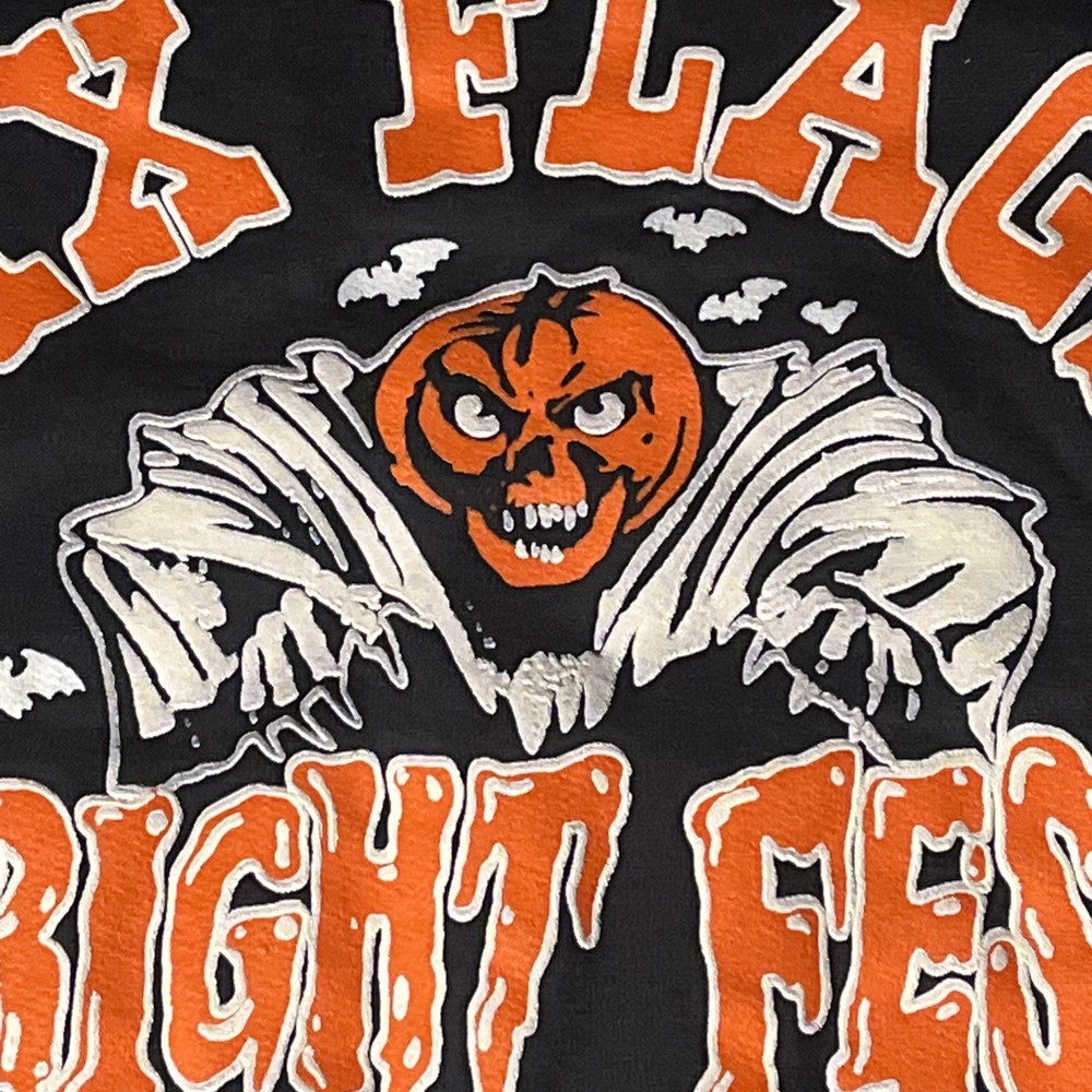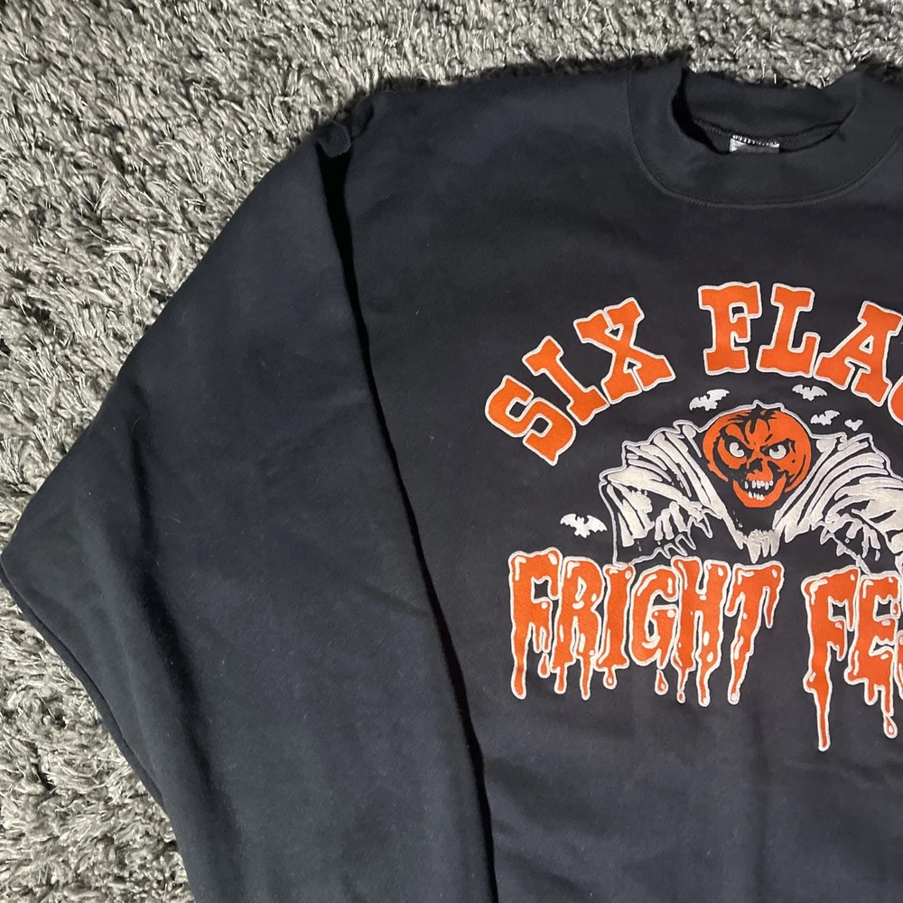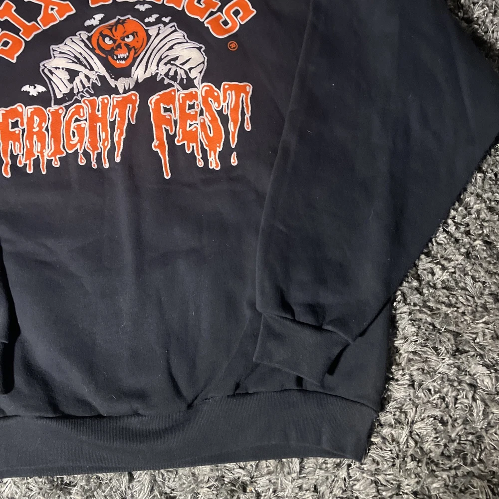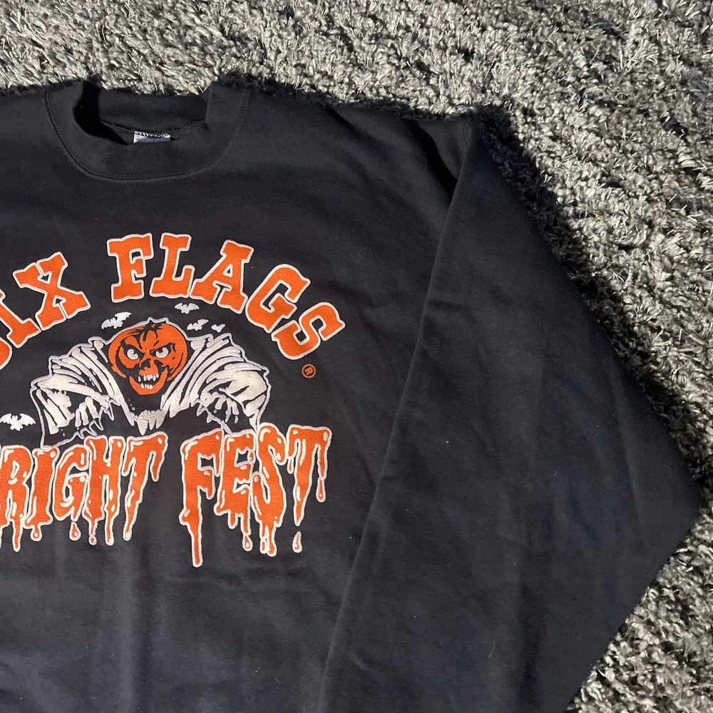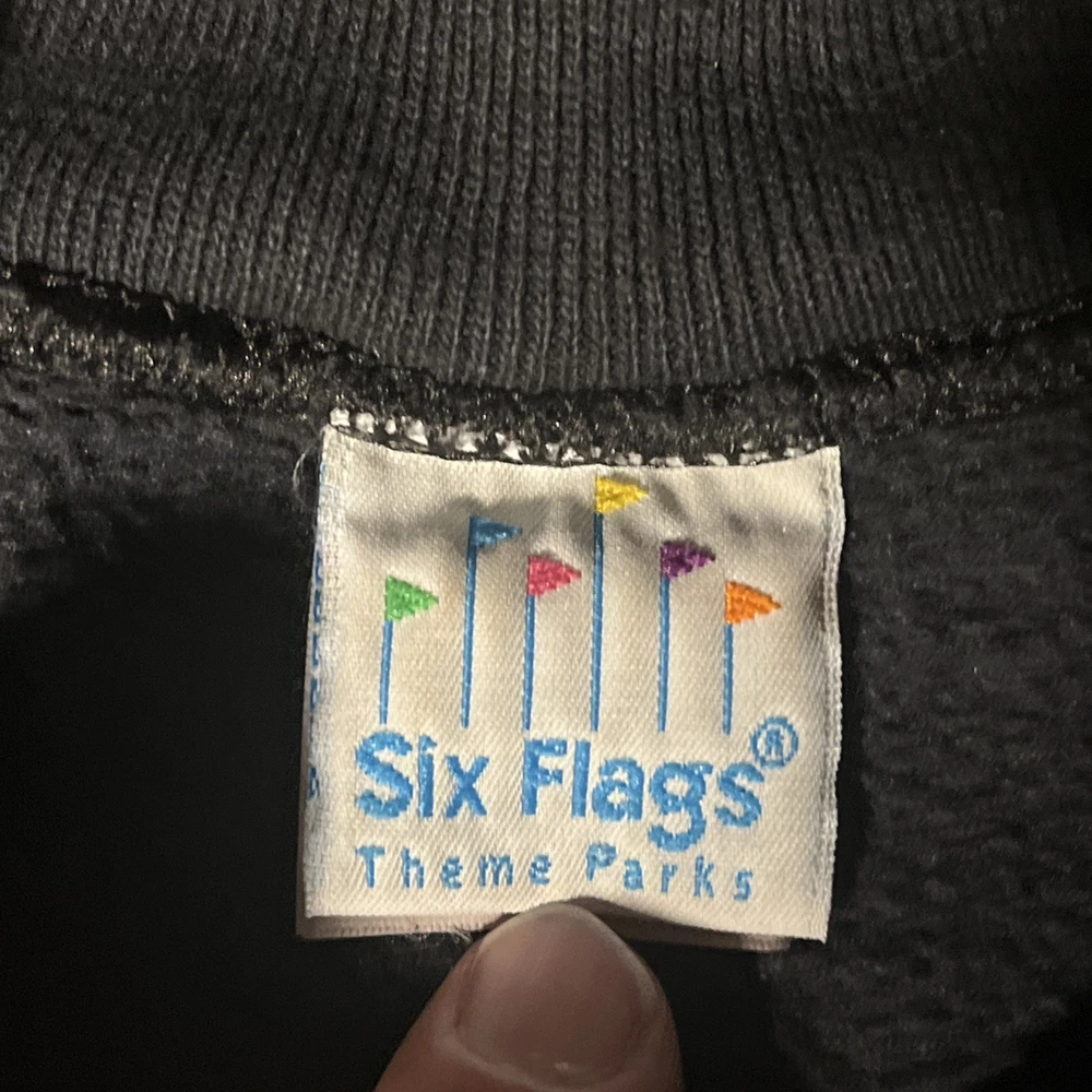 Style: Pullover Garment Care: Machine Washable Brand: Six Flags Fit: Regular Pattern: Graphic Print Size Type: Regular Sleeve Length: Long Sleeve Performance/Activity: Walking, Hiking Vintage: Yes Neckline: Crew Neck Fabric Type: Knit Type: Sweatshirt Department: Men Material: Cotton Country/Region of Manufacture: United States Theme: Halloween, Horror, Amusement Park Season: Fall, Spring, Winter, Summer Color: Black Size: 2XL Features: Graphic Print, All Seasons