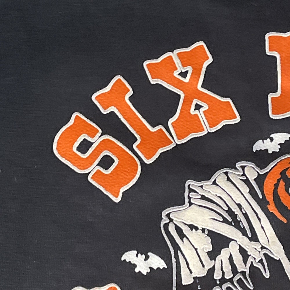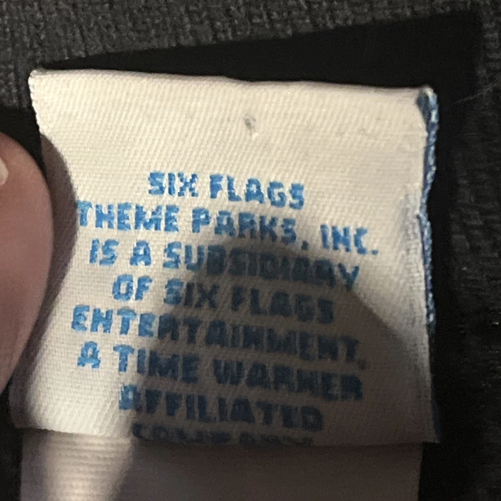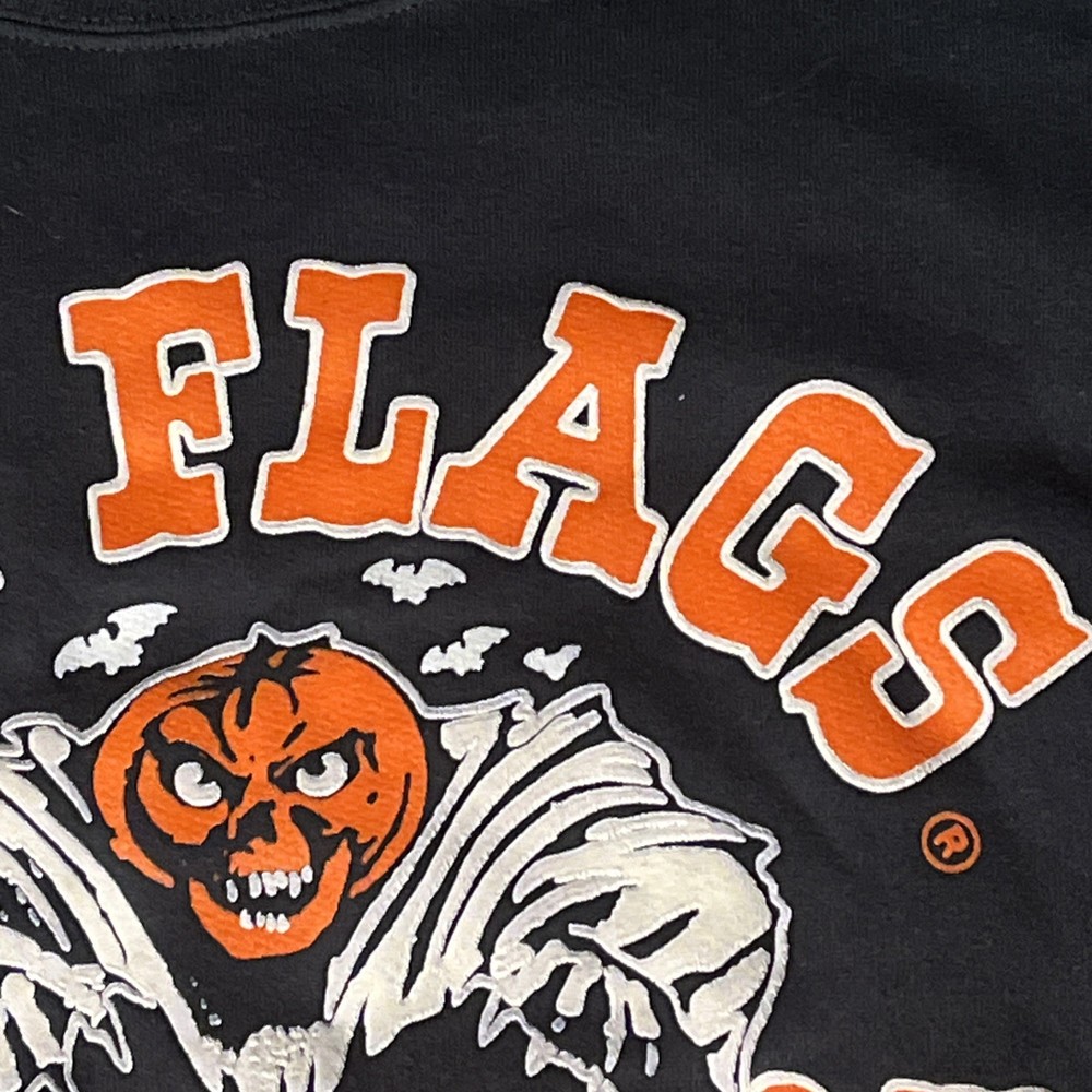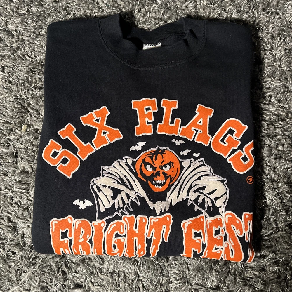 Style: Pullover Garment Care: Machine Washable Brand: Six Flags Fit: Regular Pattern: Graphic Print Size Type: Regular Sleeve Length: Long Sleeve Performance/Activity: Walking, Hiking Vintage: Yes Neckline: Crew Neck Fabric Type: Knit Type: Sweatshirt Department: Men Material: Cotton Country/Region of Manufacture: United States Theme: Halloween, Horror, Amusement Park Season: Fall, Spring, Winter, Summer Color: Black Size: 2XL Features: Graphic Print, All Seasons