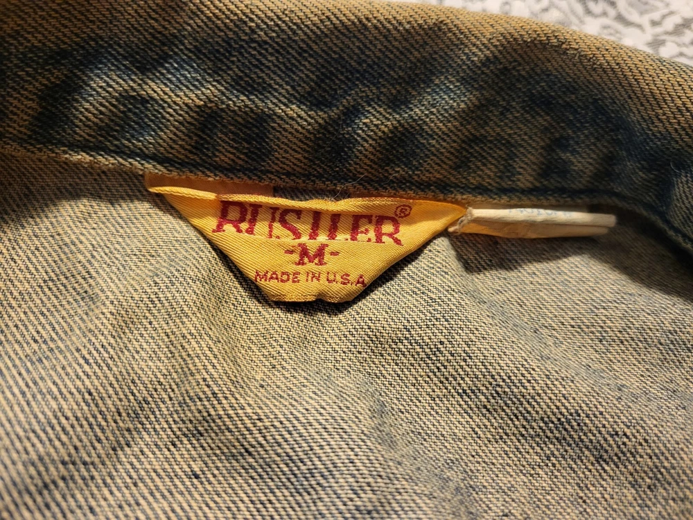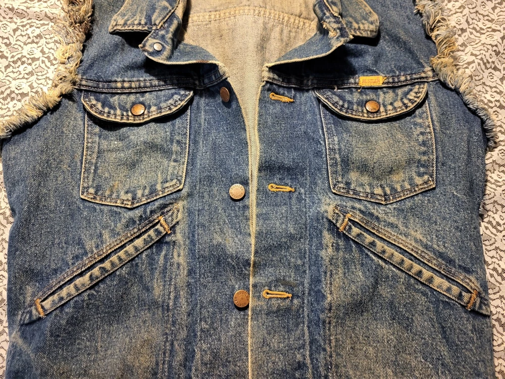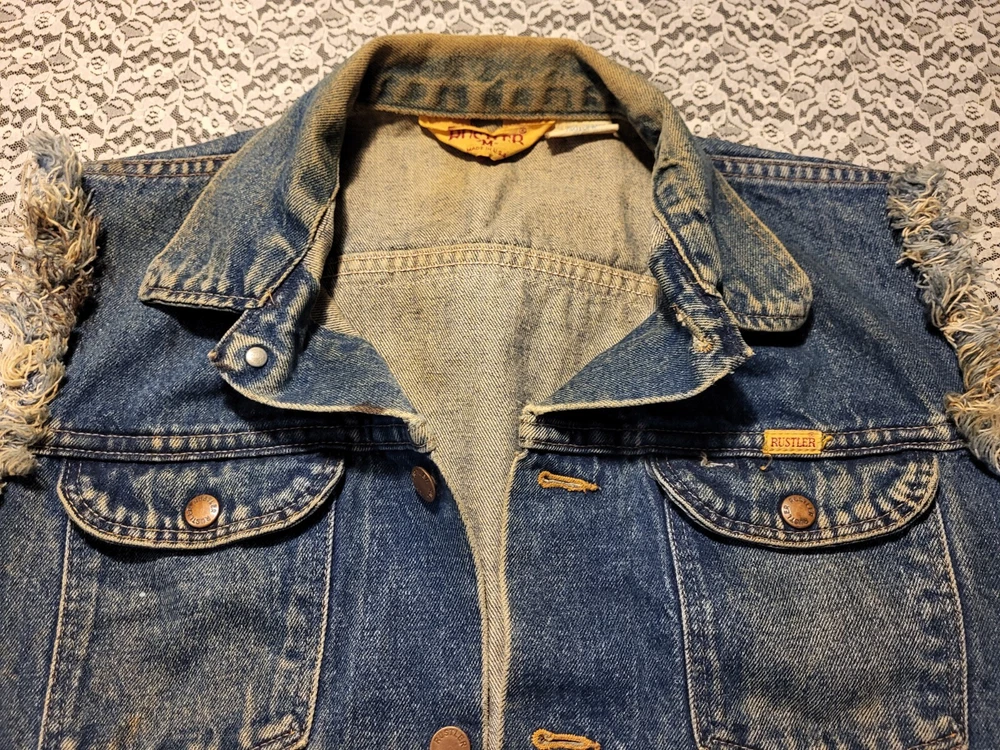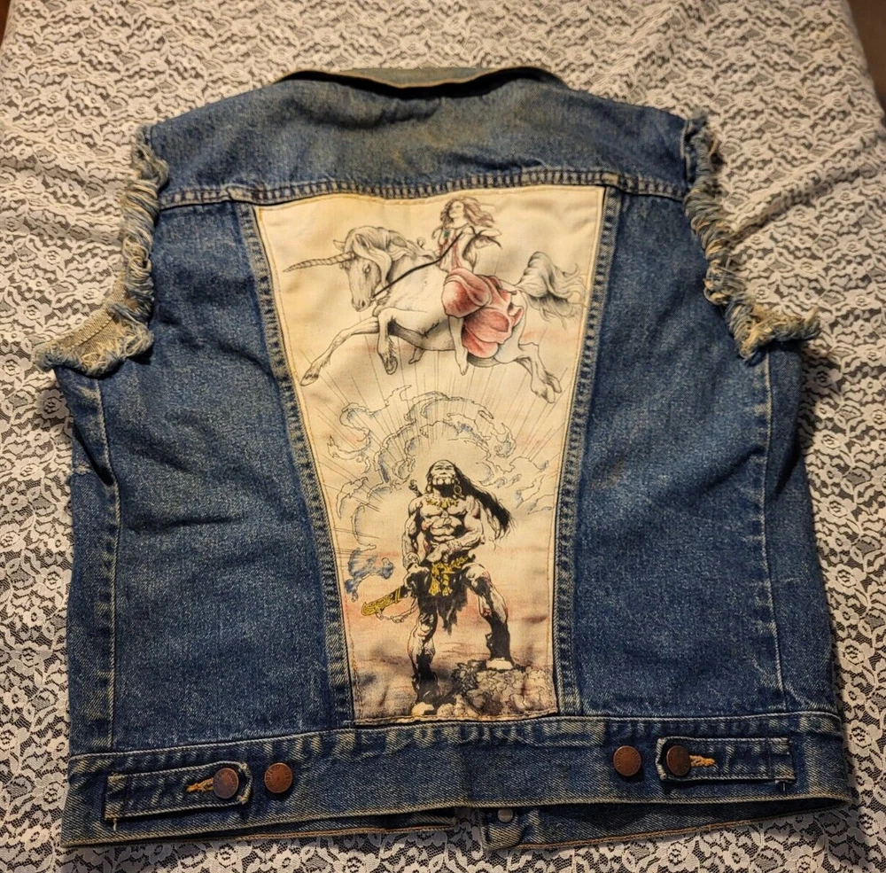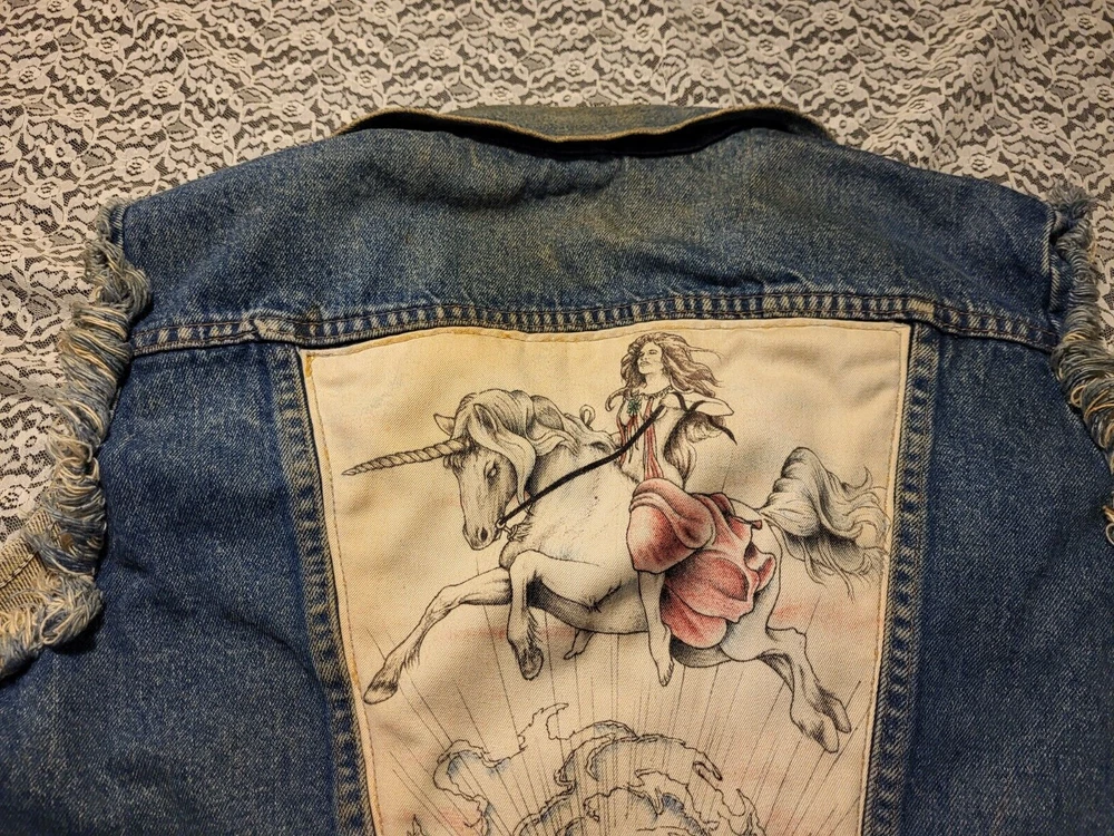 VTG 1980's-RUSTLER JEAN JACKET VEST-SIZE M MENS-WARRIOR-UNICORN BACK PATCH MEASURES 44" AROUND CHEST 35" AROUND WAISTBAND 36" TOP OF SHOULDERS 22" TOP TO BOTTOM VERY COOL APPLIED FABRIC ON BACK. A BEAUTY RIDING A UNICORN AND A MUSCULAR WARRIOR WITH SWORD. VTG 1980's-RUSTLER JEAN JACKET VEST-SIZE M MENS-WARRIOR-UNICORN BACK PATCH PLEASE CHECK- MY OTHER LISTINGS, I HAPPILY COMBINE WONDERFUL ADDITION TO ANY COLLECTION. R SHIPPING INCLUDES DELIVERY CONFIRMATION AND TRACKING NUMBER. PLEASE CHECK MY OTHER LISTINGS, I HAPPILY COMBINE. THANKS FOR LOOKING AND GOOD LUCK! PLEASE BE AWARE THAT MOST ITEMS I SELL ARE VINTAGE, THEY ARE ACQUIRED FROM RUMMAGE SALES, YARD SALES AND AUCTIONS. MY HOME IS A NON SMOKING HOME, BUT I DO HAVE 2 WELL LOVED KITTY'S. I DO NOT KNOW THE ORIGINS NOR ENVIRONMENT FROM WHICH THE ITEMS I BUY COME FROM. THEY HAVE BEEN IN A HOME WITH PETS...THEY ALSO MAY HAVE BEEN FROM A SMOKERS HOME.