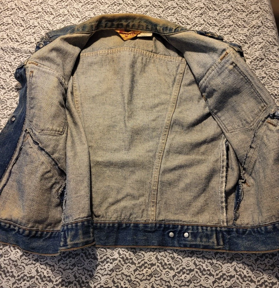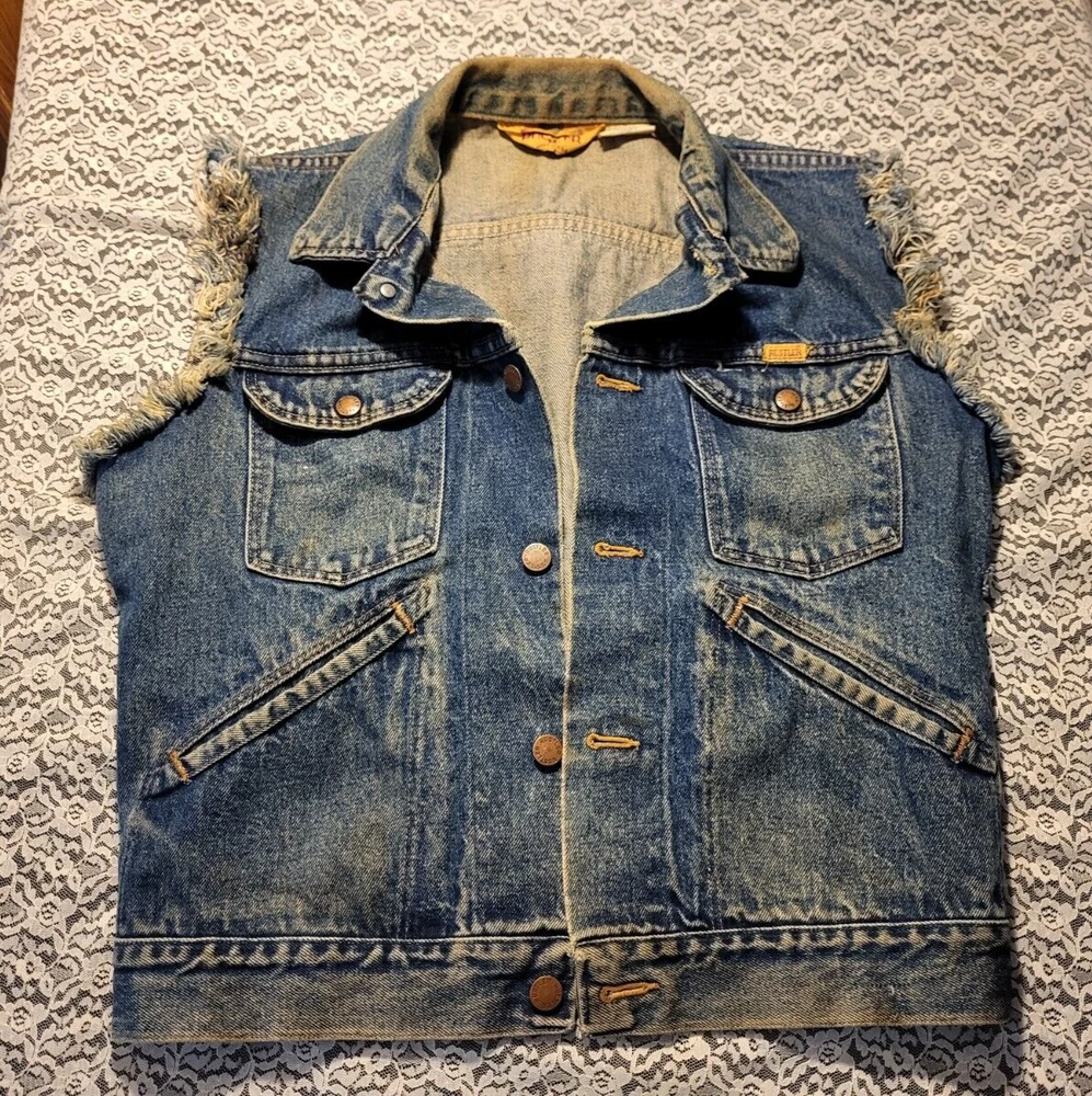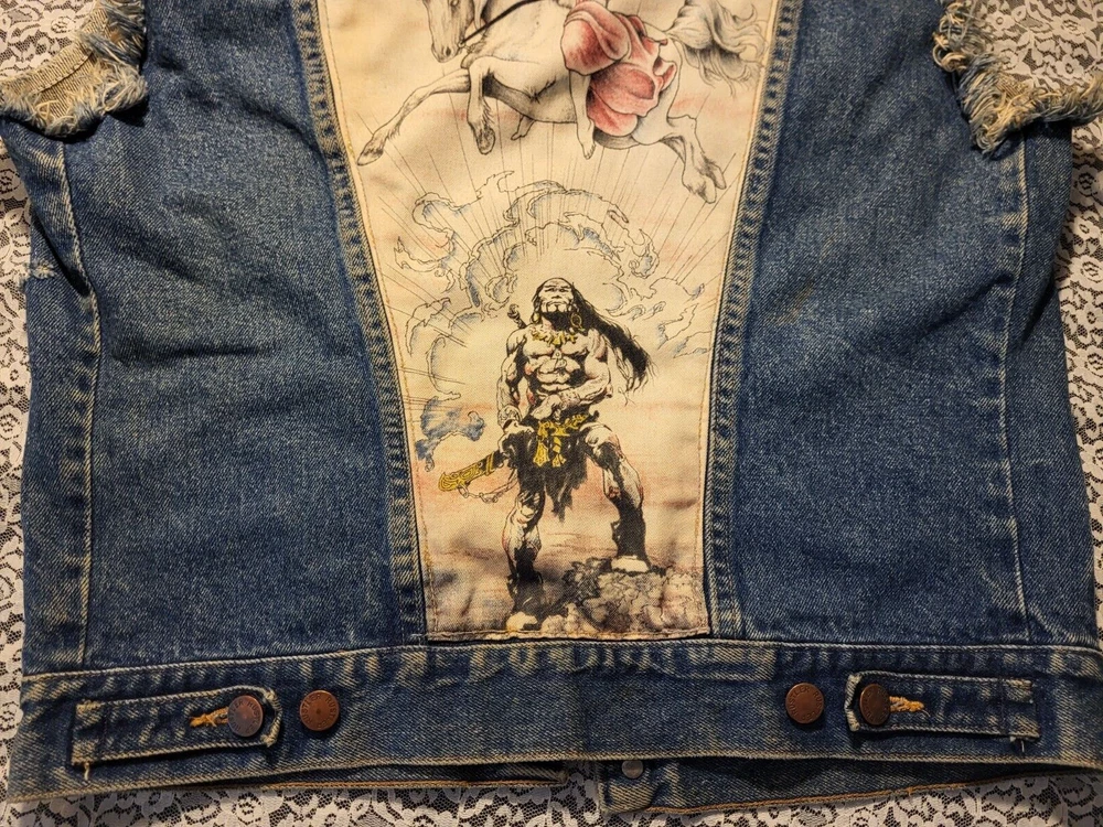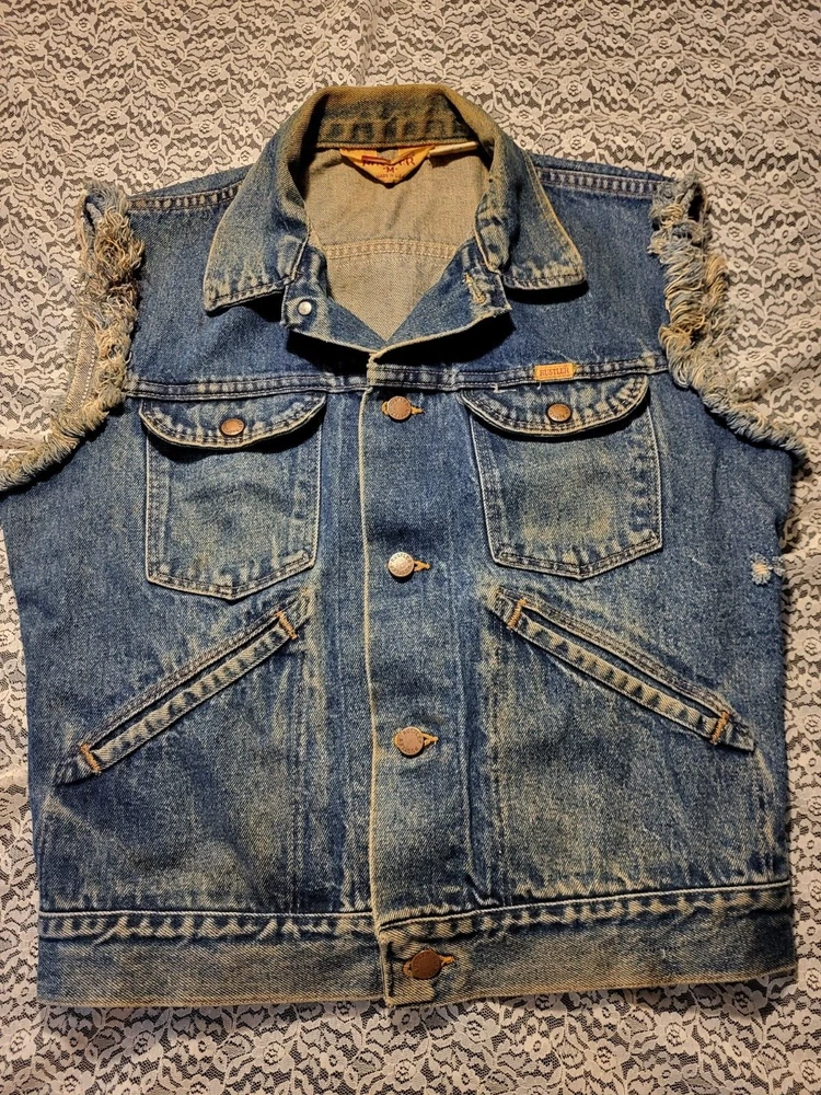 VTG 1980's-RUSTLER JEAN JACKET VEST-SIZE M MENS-WARRIOR-UNICORN BACK PATCH MEASURES 44" AROUND CHEST 35" AROUND WAISTBAND 36" TOP OF SHOULDERS 22" TOP TO BOTTOM VERY COOL APPLIED FABRIC ON BACK. A BEAUTY RIDING A UNICORN AND A MUSCULAR WARRIOR WITH SWORD. VTG 1980's-RUSTLER JEAN JACKET VEST-SIZE M MENS-WARRIOR-UNICORN BACK PATCH PLEASE CHECK- MY OTHER LISTINGS, I HAPPILY COMBINE WONDERFUL ADDITION TO ANY COLLECTION. R SHIPPING INCLUDES DELIVERY CONFIRMATION AND TRACKING NUMBER. PLEASE CHECK MY OTHER LISTINGS, I HAPPILY COMBINE. THANKS FOR LOOKING AND GOOD LUCK! PLEASE BE AWARE THAT MOST ITEMS I SELL ARE VINTAGE, THEY ARE ACQUIRED FROM RUMMAGE SALES, YARD SALES AND AUCTIONS. MY HOME IS A NON SMOKING HOME, BUT I DO HAVE 2 WELL LOVED KITTY'S. I DO NOT KNOW THE ORIGINS NOR ENVIRONMENT FROM WHICH THE ITEMS I BUY COME FROM. THEY HAVE BEEN IN A HOME WITH PETS...THEY ALSO MAY HAVE BEEN FROM A SMOKERS HOME.