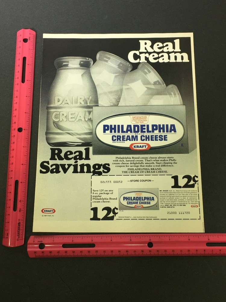 VTG 1981 Kraft Philadelphia Brand Cream and Cheese Pasteurized Print Ad Coupon Good Edges may have minor wear and/or small fine rips. Comes with plastic protective covering. Size: 11.10" x 8.14" Advertisement in good condition Coupon expired and no longer can be used Offer expired and no longer can be used ORIGINAL. NOT A REPRINT. Front and back included. See pictures PLEASE VIEW OUR OTHER RETRO HARD TO FIND ADS AND THOUSANDS OF VINTAGE ITEMS IN OUR STORE. ANY ITEMS ADDED TO THE CART FOR BUY IT NOW MAY APPLY FOR A BUY 2 TAKE 1 FREE OFFER. WE ALSO OFFER COMBINED SHIPPING!