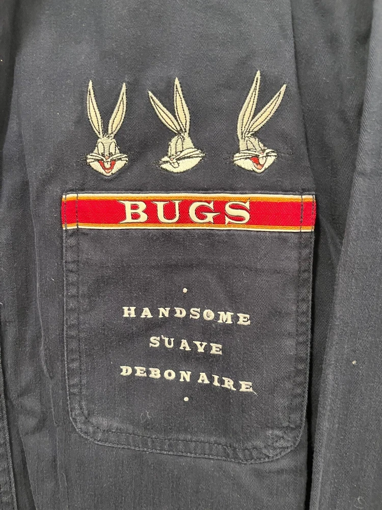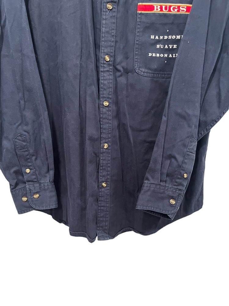 This vintage button-up shirt from Warner Bros. Studio features the iconic Bugs Bunny character and is perfect for a casual occasion. The shirt is made of cotton and has a solid pattern with an embroidered accent. It has long sleeves, a collared neckline, and a button-down closure. Plus, it has pockets for added convenience. Great addition to your Bugs Bunny Collection. Size: Medium Chest: 48” Underarm to Underarm: 24” Length: 32” Cotton Machine Washable