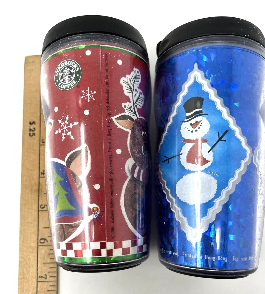 VTG 2001 STARBUCKS 8 OZ Barista Christmas Mugs Cups Tumblers Lidded Lot of 2 Very good pre-owned condition.