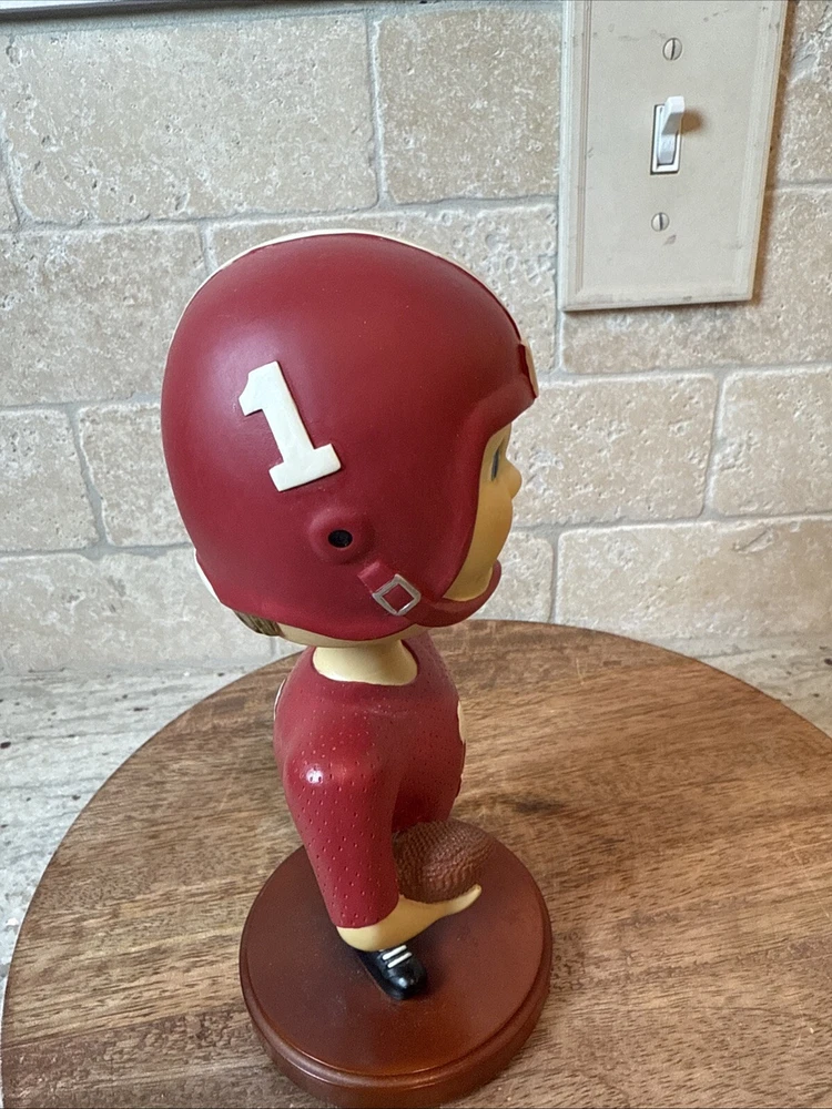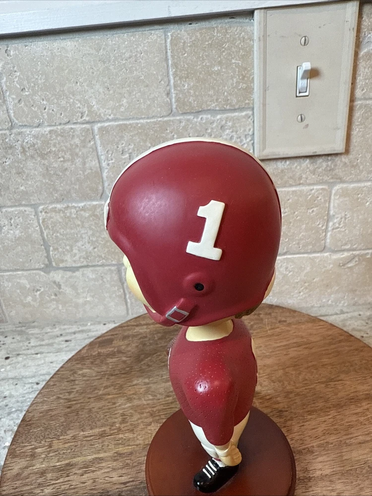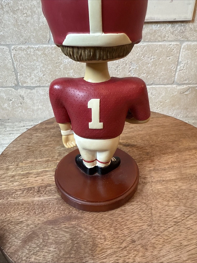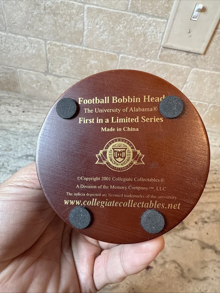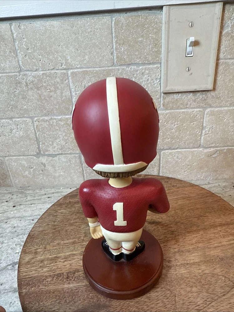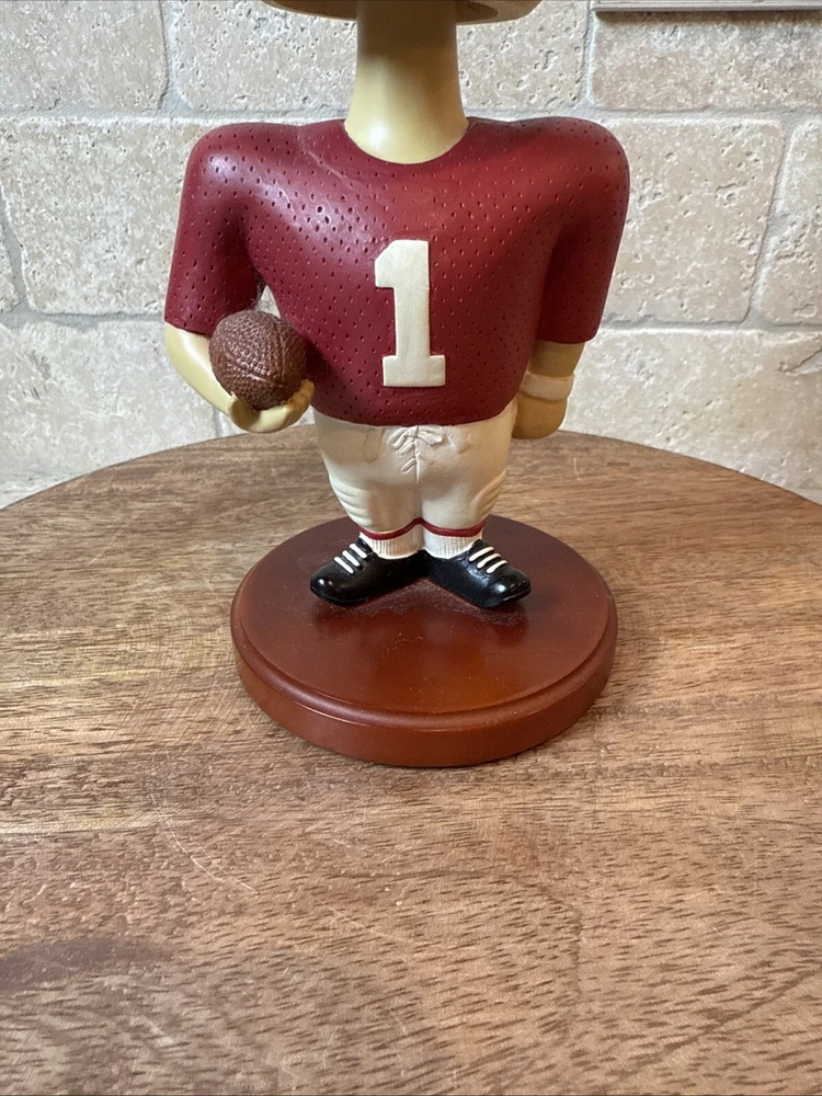 This vintage bobblehead features the iconic Alabama Crimson Tide football team from 2001. It is a officially licensed product from Memory Company and is a must-have for any fan of the team. The intricately designed head is a perfect addition to any collection and is sure to be a conversation starter. The bobblehead is made with high-quality materials and has been well-maintained over the years. It is a great way to show your love and support for the Alabama Crimson Tide.