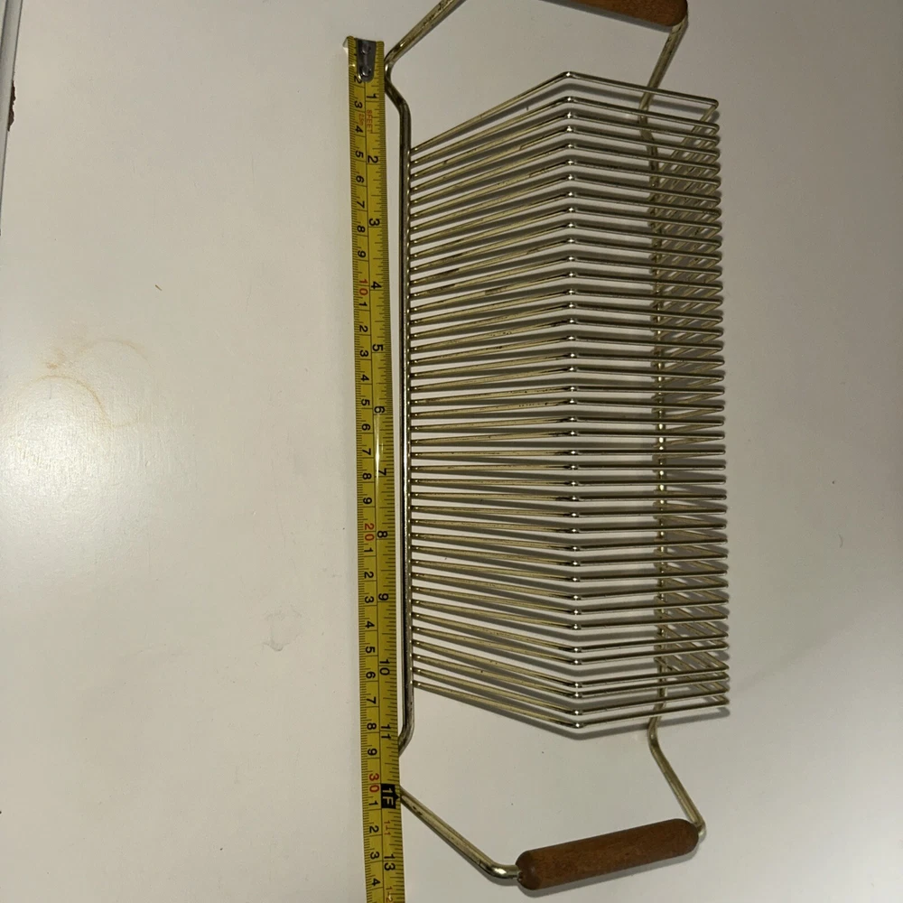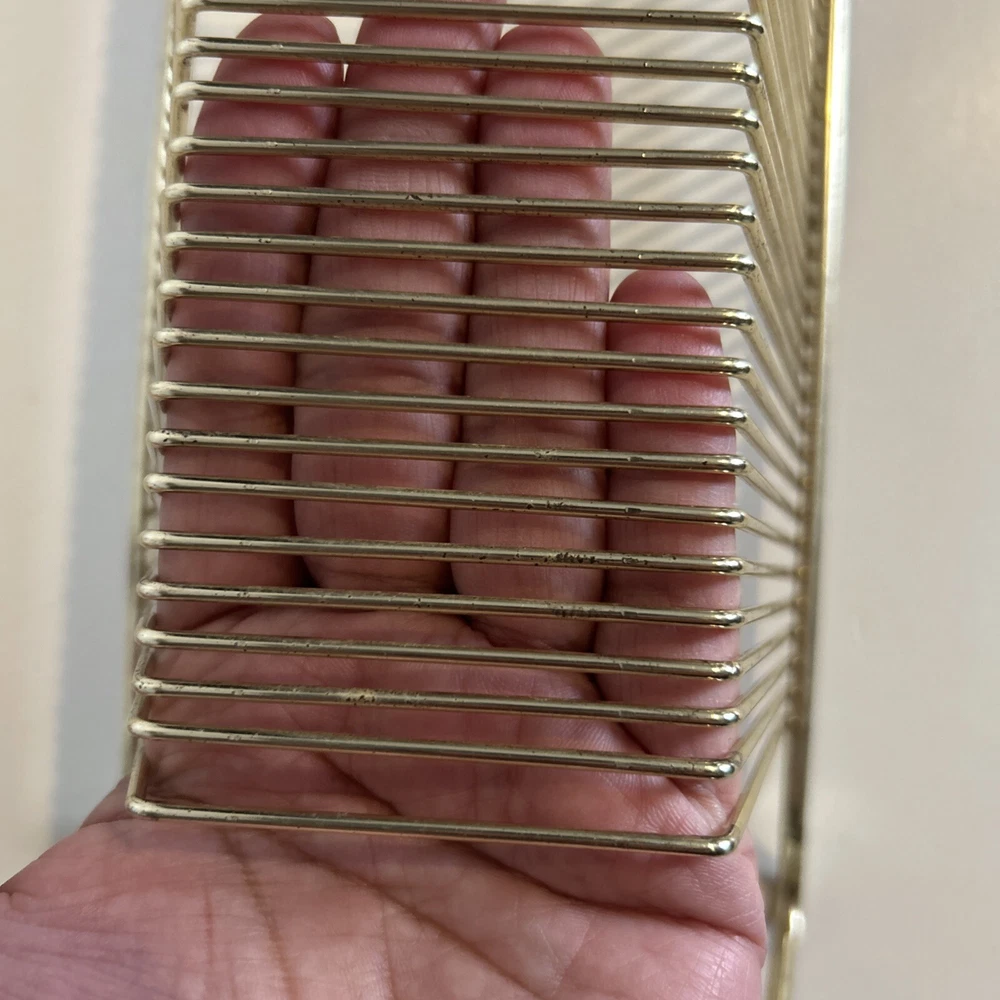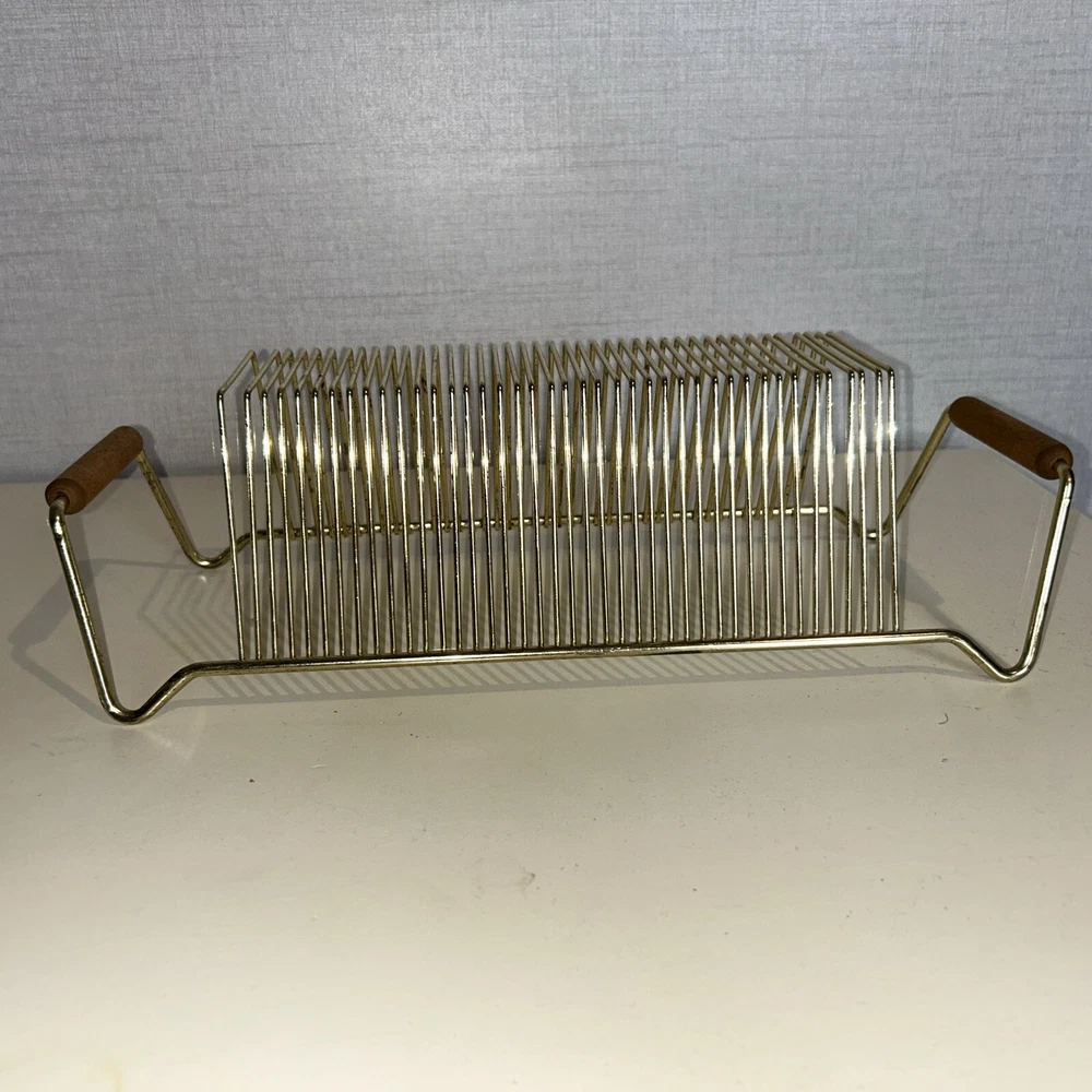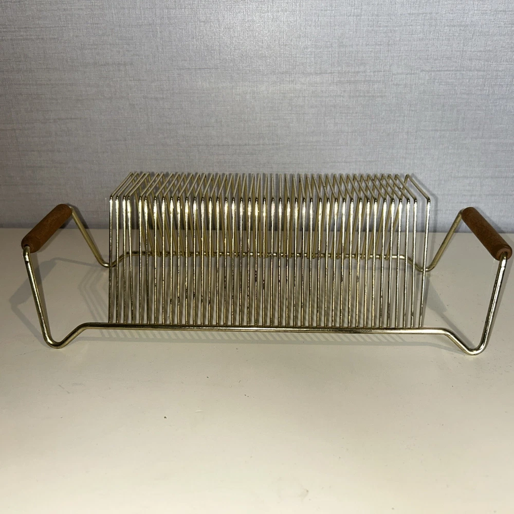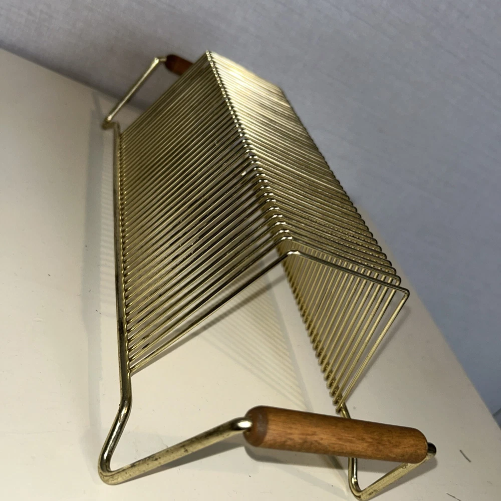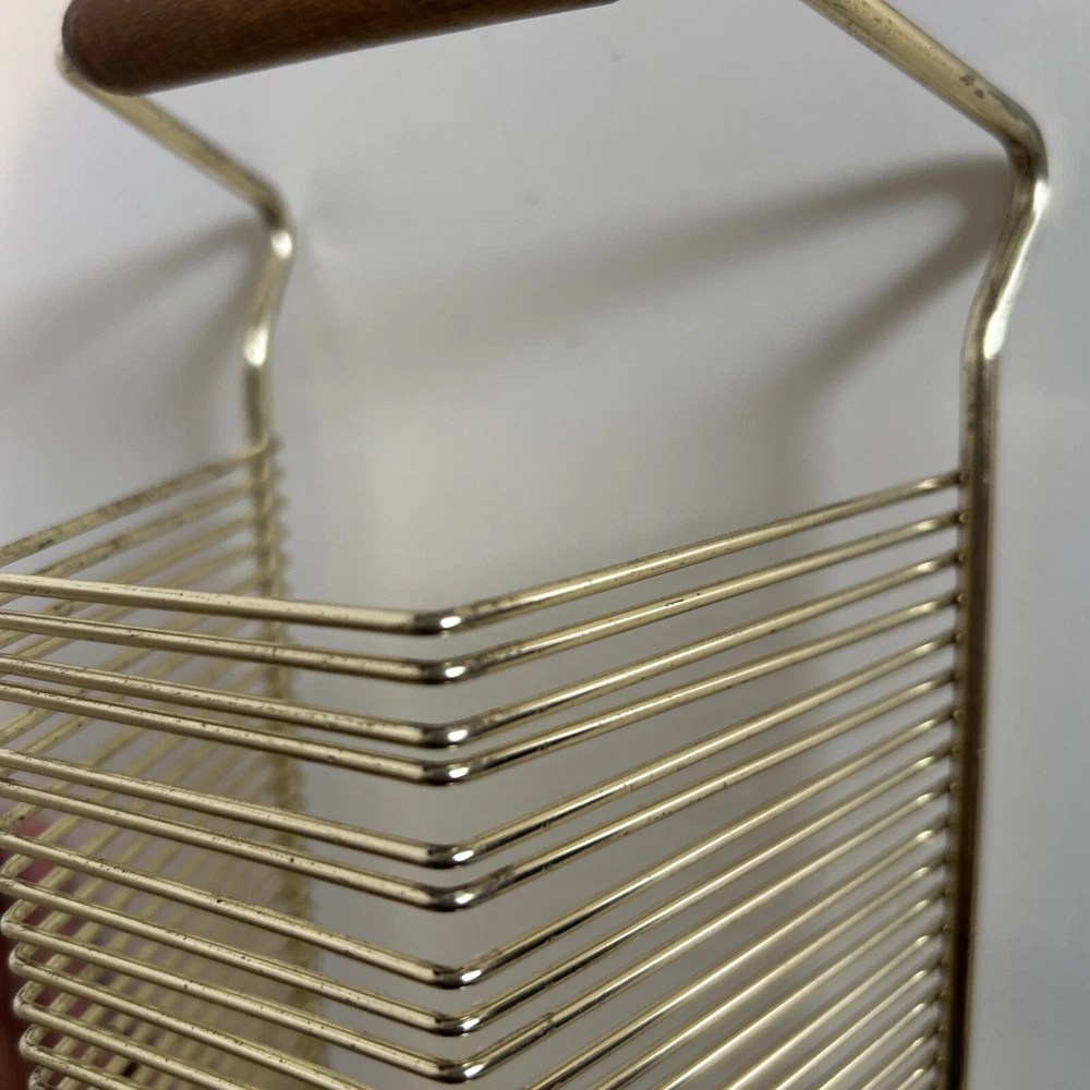 This vintage wire album is the perfect addition to any collector's storage needs. It can hold up to 40 records, both 45 and 78 vinyl, and has sturdy wooden handles for easy movement. The gold color and metal material add a touch of elegance to any room. Designed to fit 12" records, this rack is a must-have for any music enthusiast. Its unit type is a rack and it is made in an unknown country/region of manufacture. This item falls under the categories of Music and Audio Media Accessories. It has signs of use such as paint that fell off, but it is still good condition.