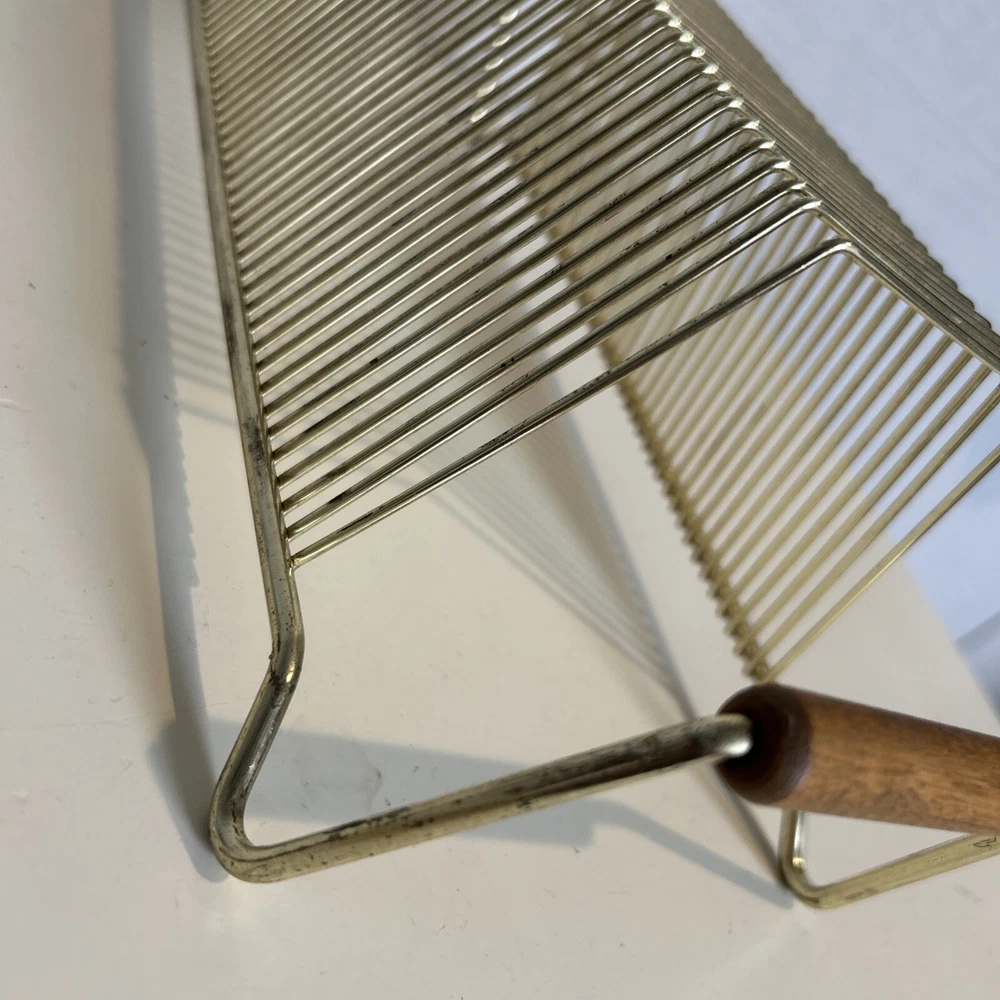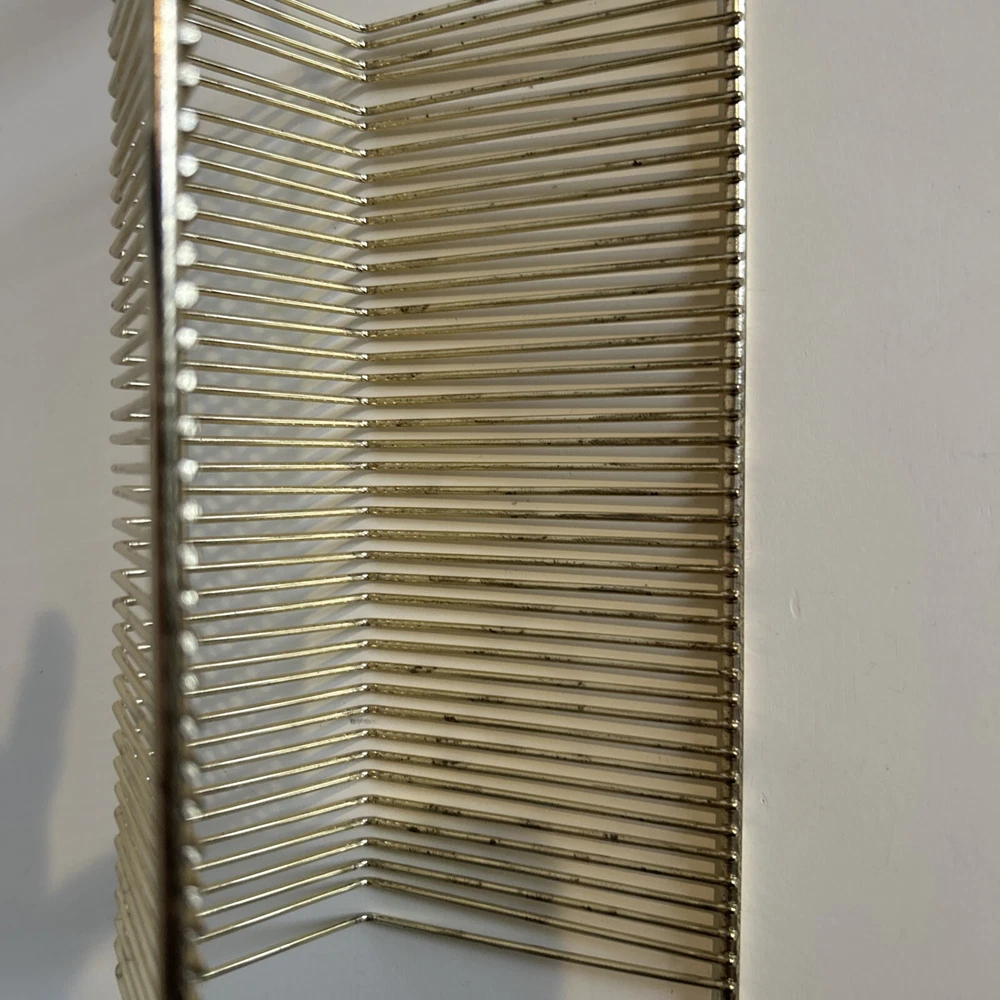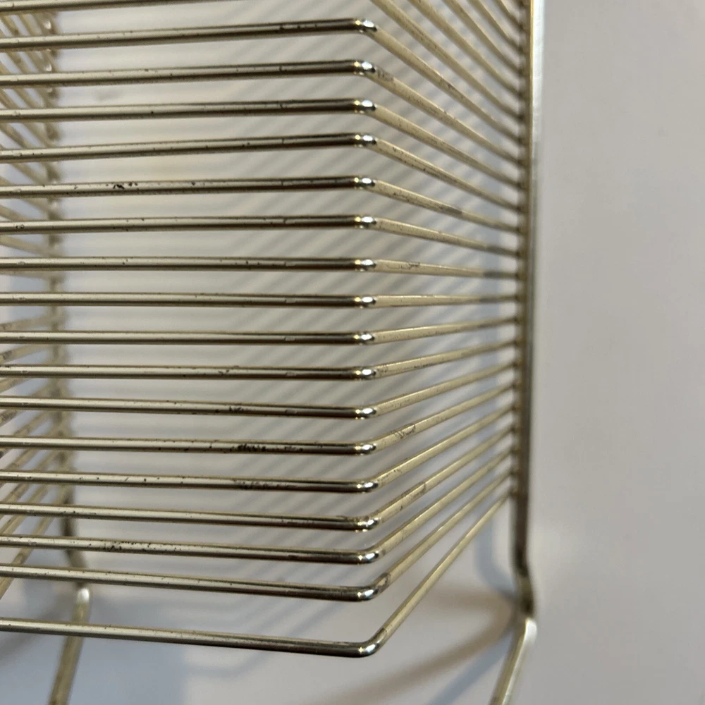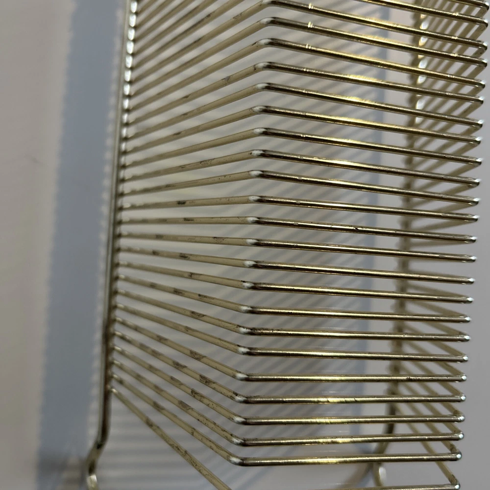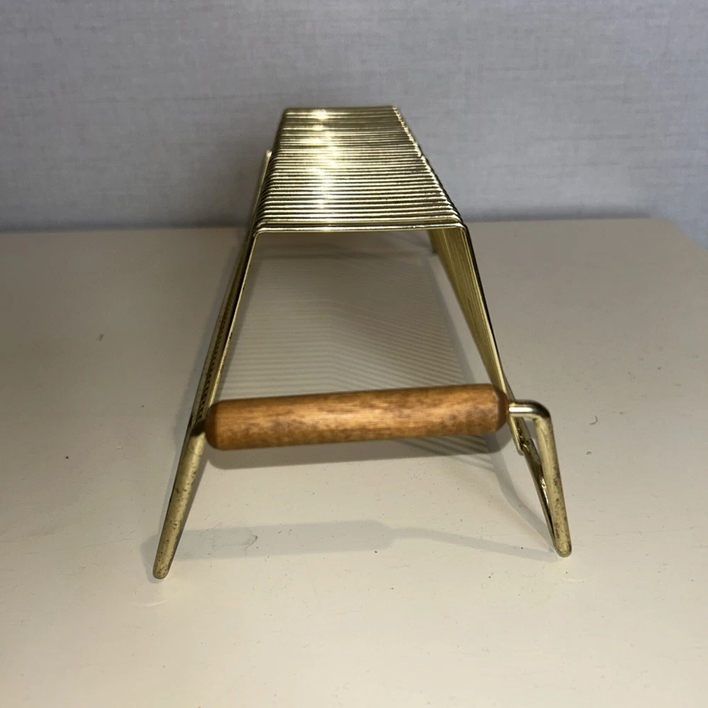 This vintage wire album is the perfect addition to any collector's storage needs. It can hold up to 40 records, both 45 and 78 vinyl, and has sturdy wooden handles for easy movement. The gold color and metal material add a touch of elegance to any room. Designed to fit 12" records, this rack is a must-have for any music enthusiast. Its unit type is a rack and it is made in an unknown country/region of manufacture. This item falls under the categories of Music and Audio Media Accessories. It has signs of use such as paint that fell off, but it is still good condition.