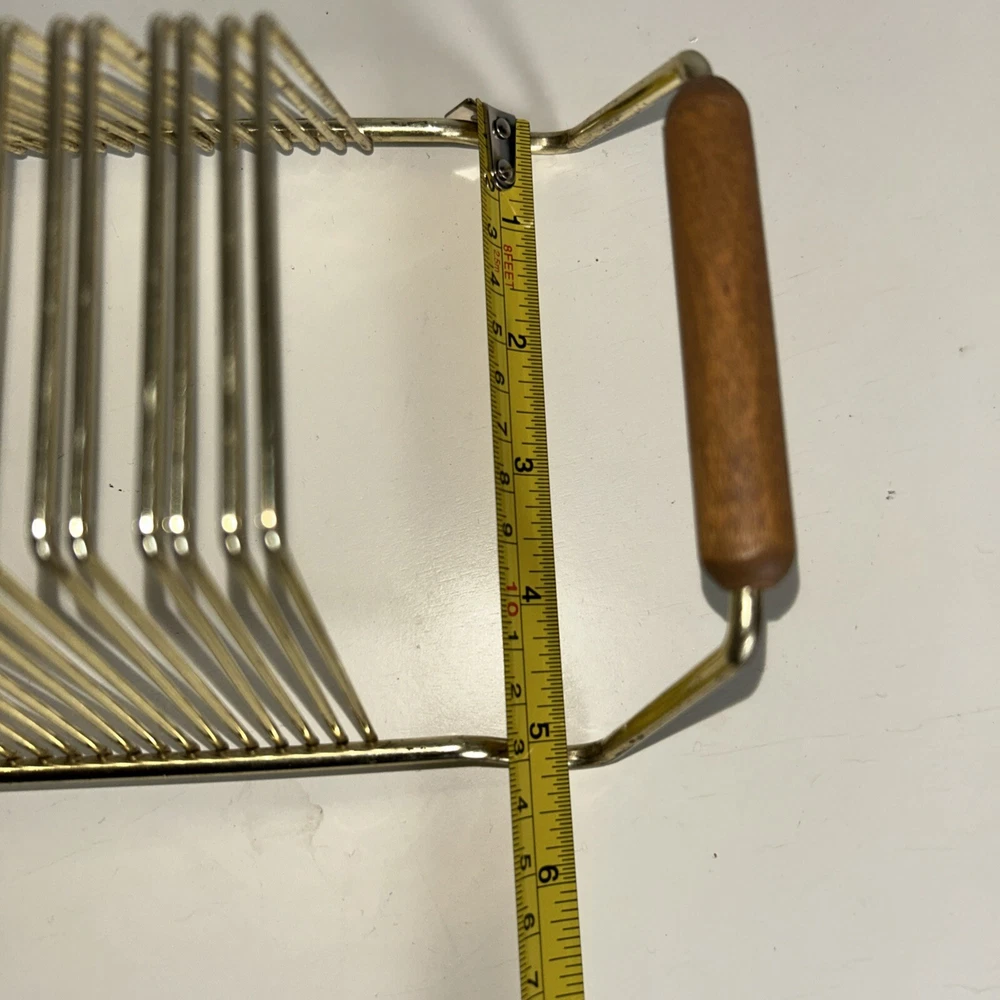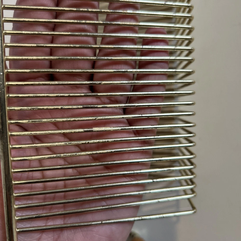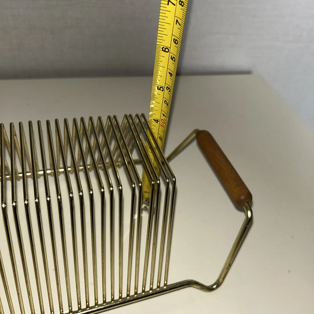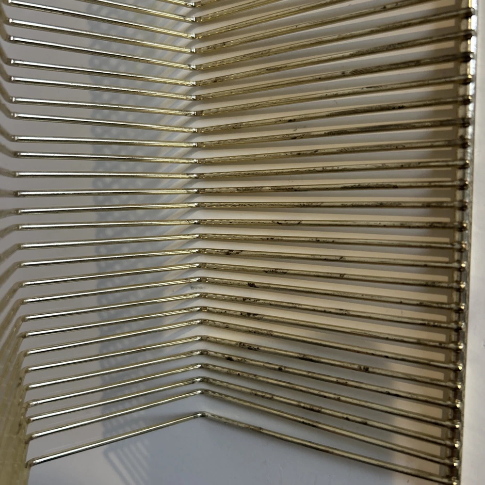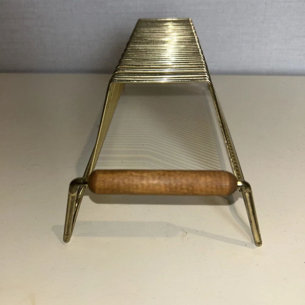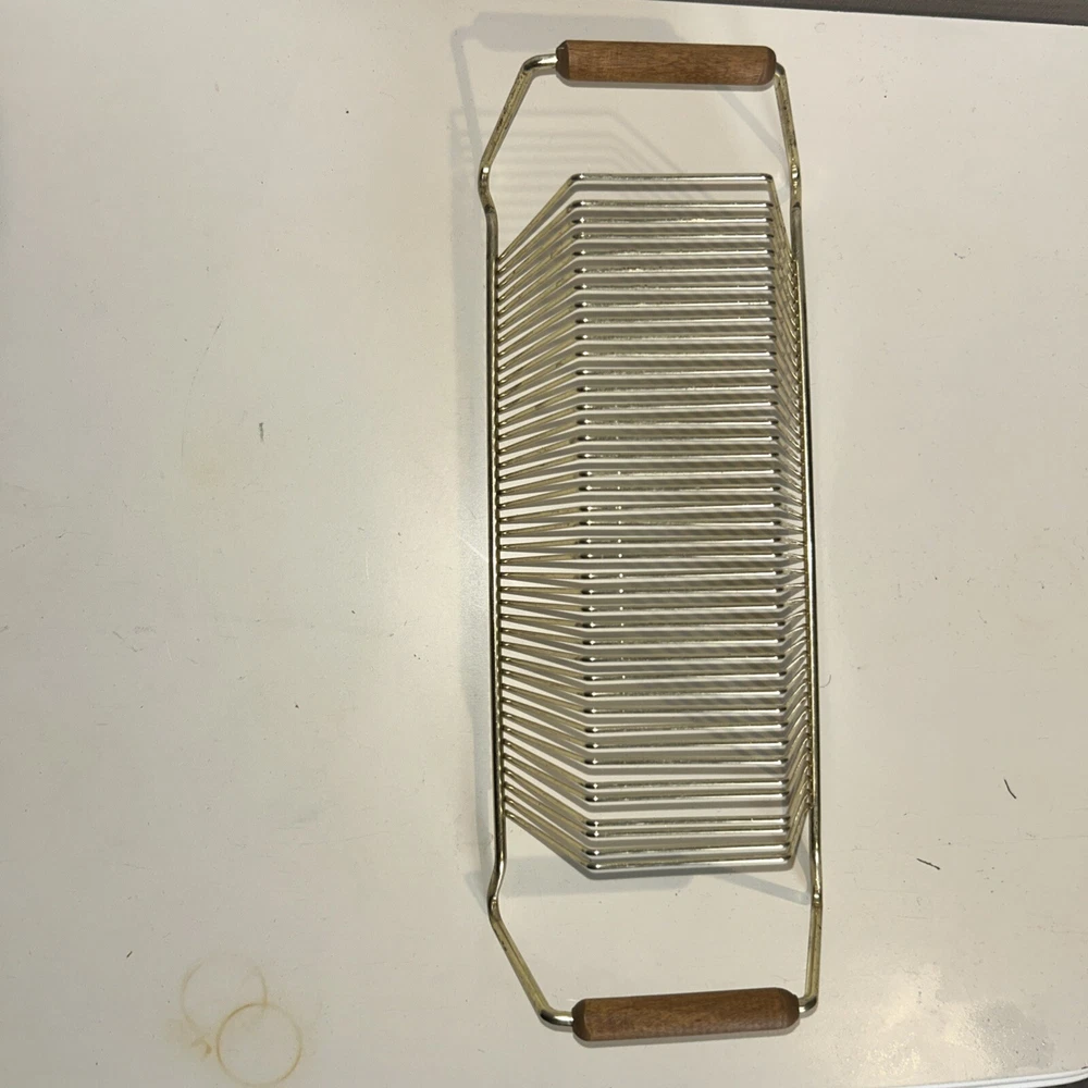This vintage wire album is the perfect addition to any collector's storage needs. It can hold up to 40 records, both 45 and 78 vinyl, and has sturdy wooden handles for easy movement. The gold color and metal material add a touch of elegance to any room. Designed to fit 12" records, this rack is a must-have for any music enthusiast. Its unit type is a rack and it is made in an unknown country/region of manufacture. This item falls under the categories of Music and Audio Media Accessories. It has signs of use such as paint that fell off, but it is still good condition.