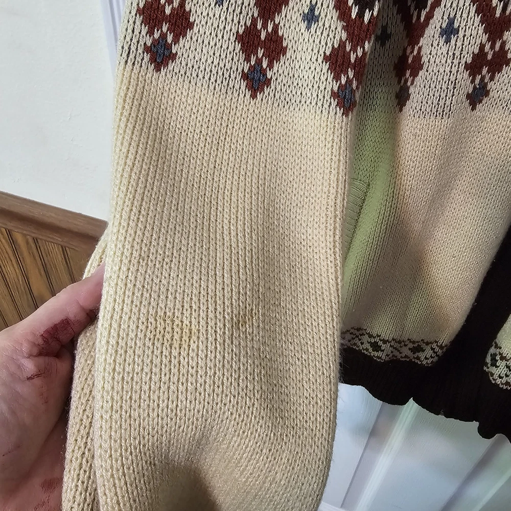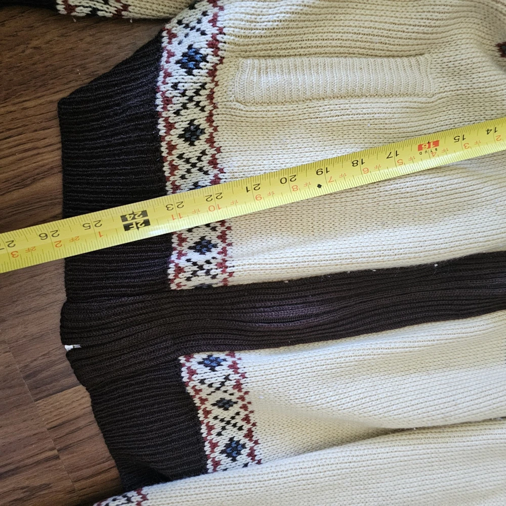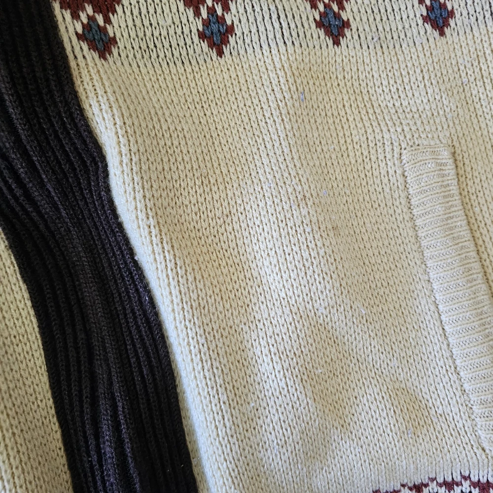 The VTG 60s Campus Sweater is a vintage men's cardigan in a classic argyle pattern with a high neck and long sleeves. Made of tight-knit acrylic fabric, this brown sweater features a heavyweight design that is perfect for colder seasons like winter, fall, and spring. With a retro vibe and a nod to grandpa core, this sweater is ideal for casual, workwear, or travel occasions, making it a versatile and stylish addition to any man's wardrobe. There is pilling and stains that I have not tried to clean. See photos for wear sold as is