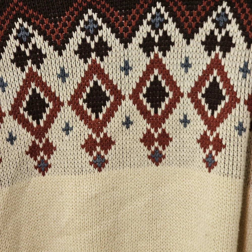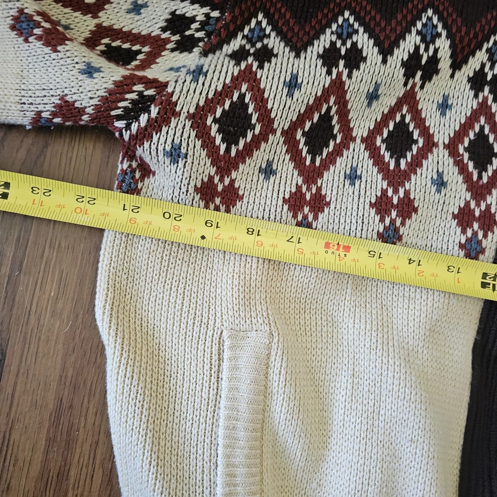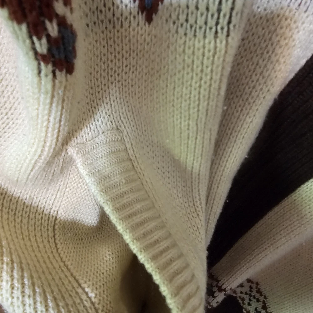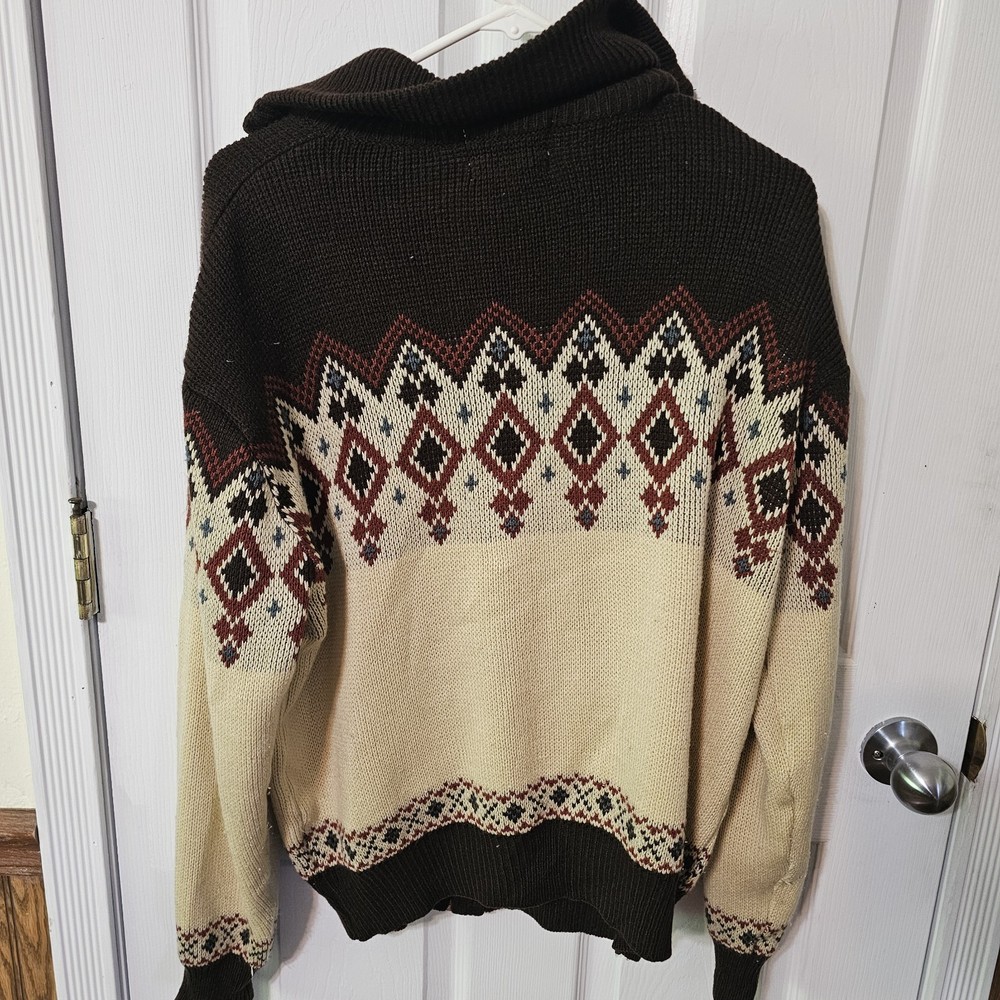 The VTG 60s Campus Sweater is a vintage men's cardigan in a classic argyle pattern with a high neck and long sleeves. Made of tight-knit acrylic fabric, this brown sweater features a heavyweight design that is perfect for colder seasons like winter, fall, and spring. With a retro vibe and a nod to grandpa core, this sweater is ideal for casual, workwear, or travel occasions, making it a versatile and stylish addition to any man's wardrobe. There is pilling and stains that I have not tried to clean. See photos for wear sold as is