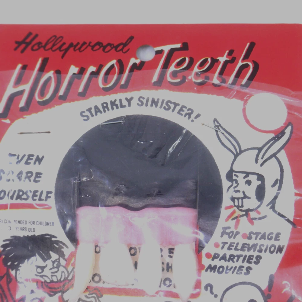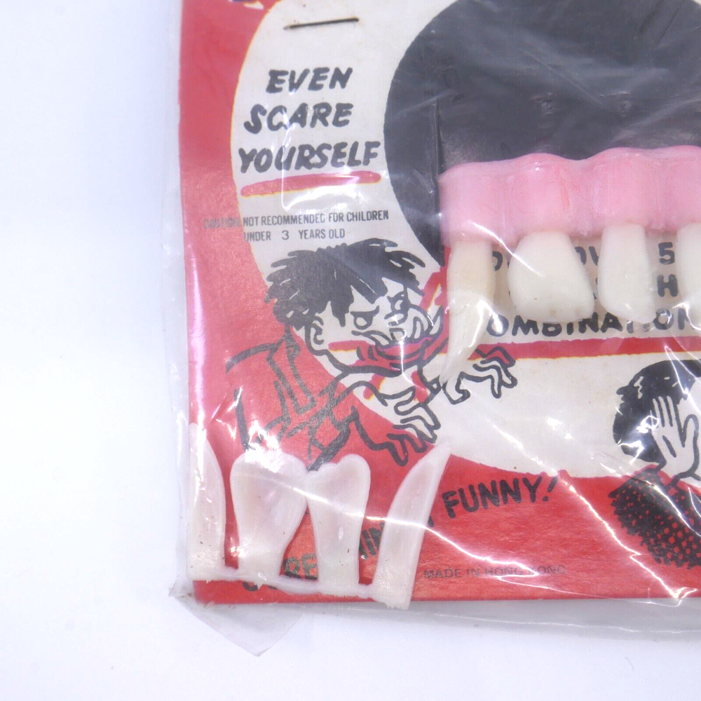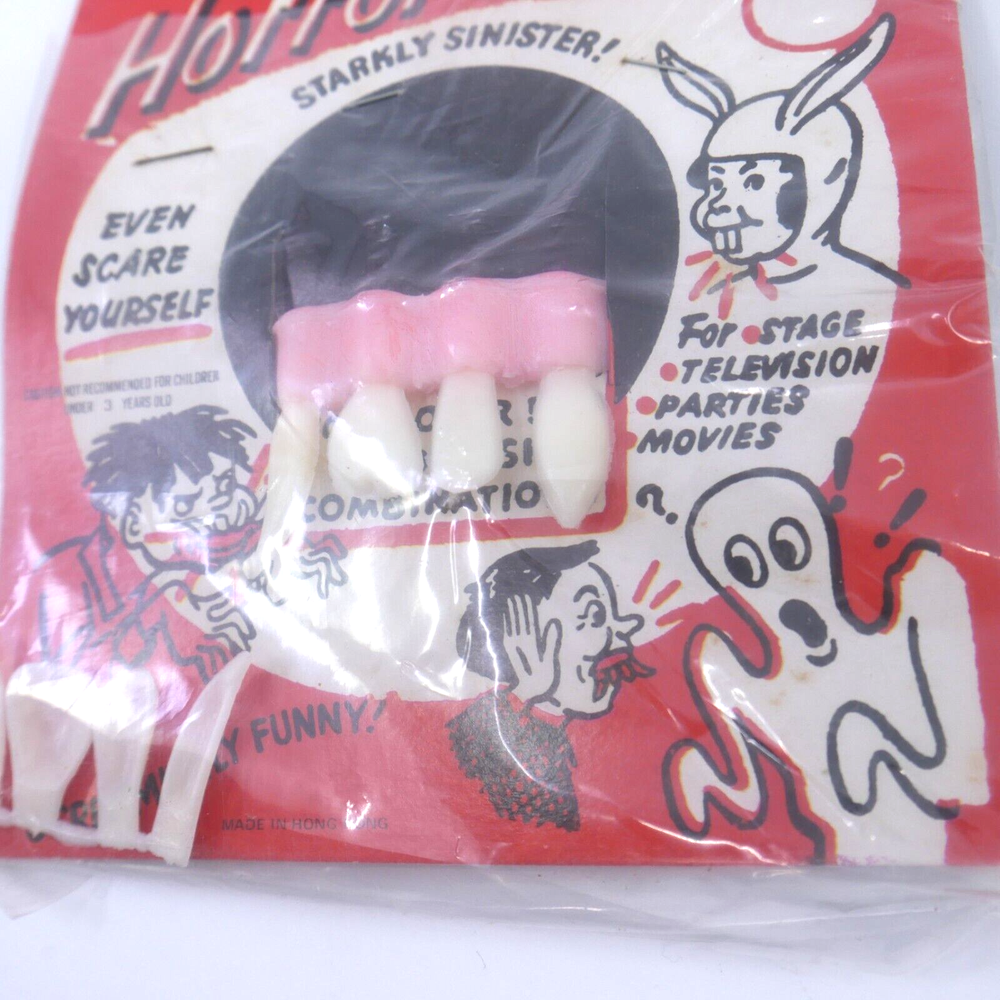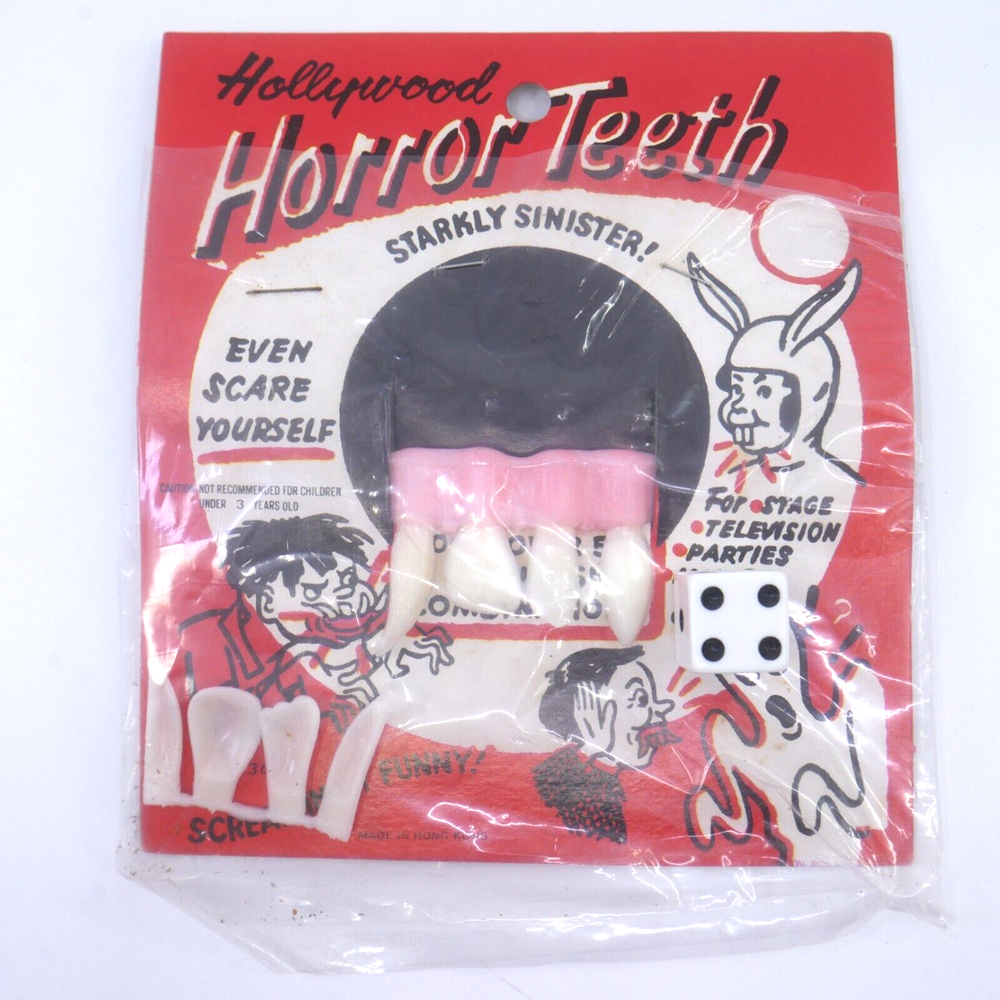 1 pair of vintage Halloween Horror Teeth These are unused. Dice in 2nd picture for size PERFECT for your vintage halloween display- how great are those vintage graphics!?!