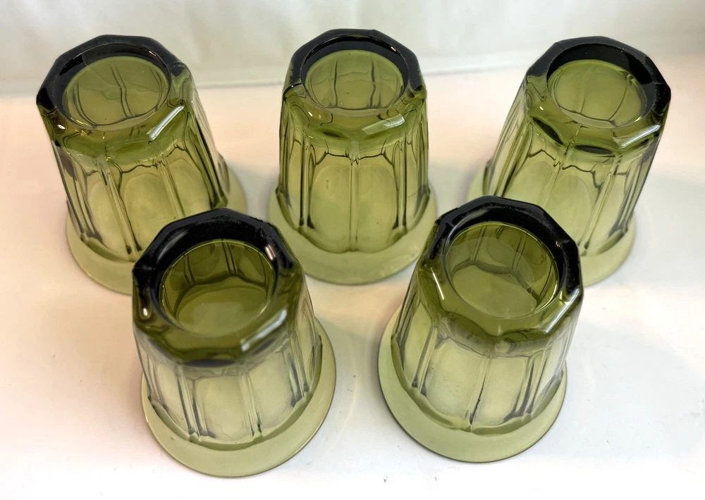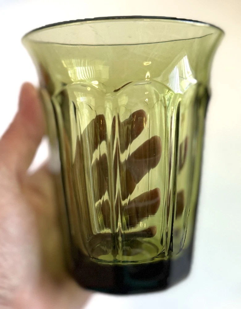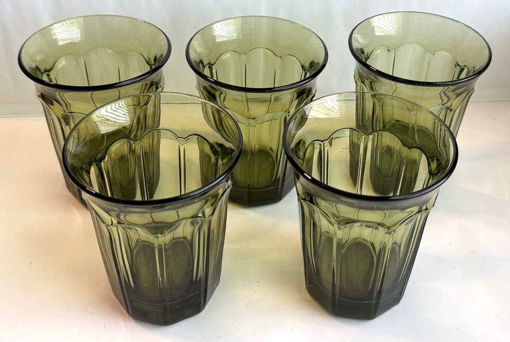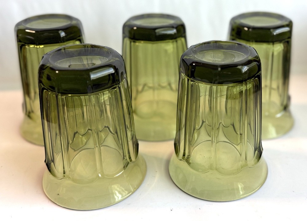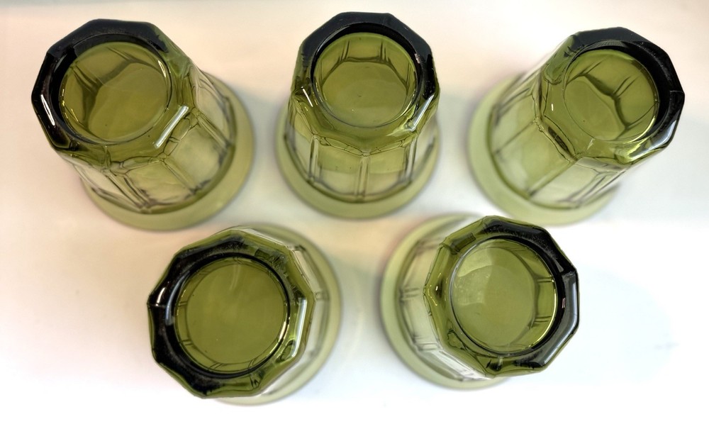 Elevate your drinkware collection with this set of five vintage Westmoreland glass tumblers, featuring the classic Colonial pattern in a vibrant green hue. Crafted in the 1970s, these glasses embody the elegance and craftsmanship of the period, making them a timeless addition to any occasion. See pics