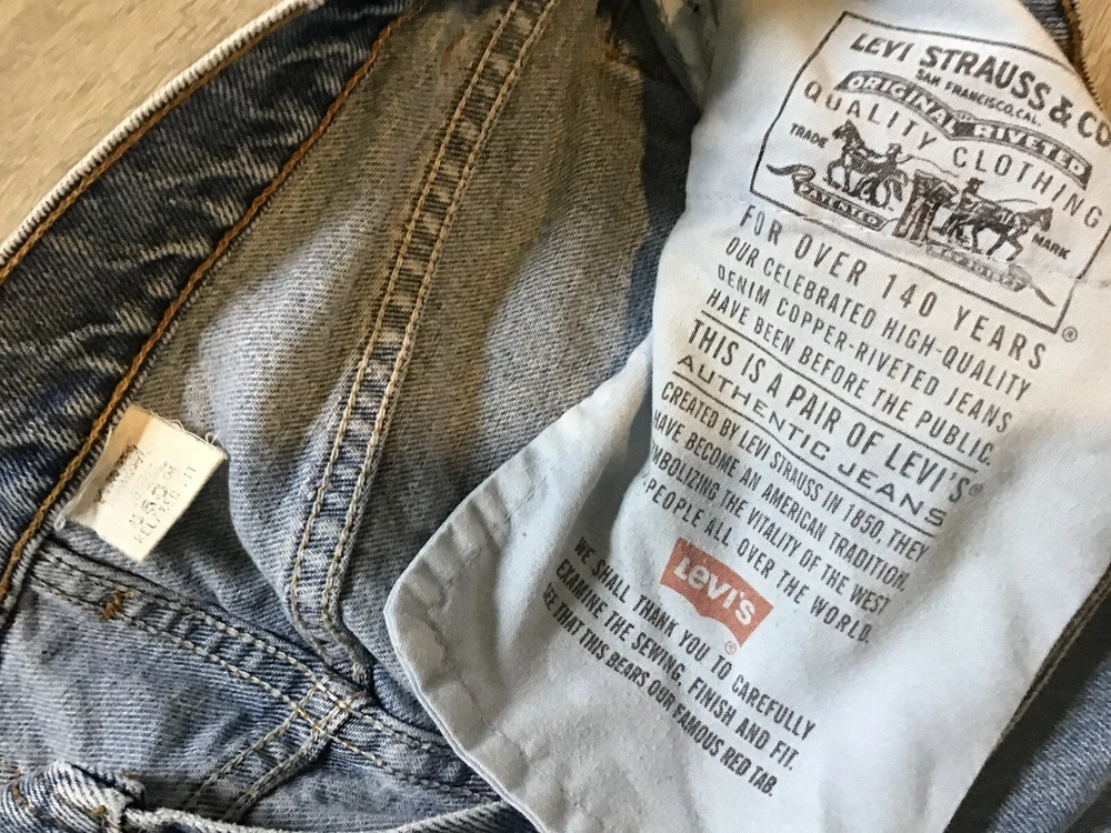 This vintage pair of Levi's 550 jeans features a classic design with 5-pocket styling, button accents, and a zip closure. The light wash denim is made in the USA and has a relaxed fit with a tapered leg, measuring 33 inches in inseam length and 34 inches in waist size. The jeans are in excellent condition and have not been personalized or distressed. The unique aspects of these jeans include their vintage status, solid pattern, and theme of USA. The garment care for these jeans is machine washable, and they have belt loops for suspenders or a belt. This product line is part of the Levi's 500 series, and the brand is well-known for its quality denim material. button shows plant 513 for mfg. sku 5 bin C2