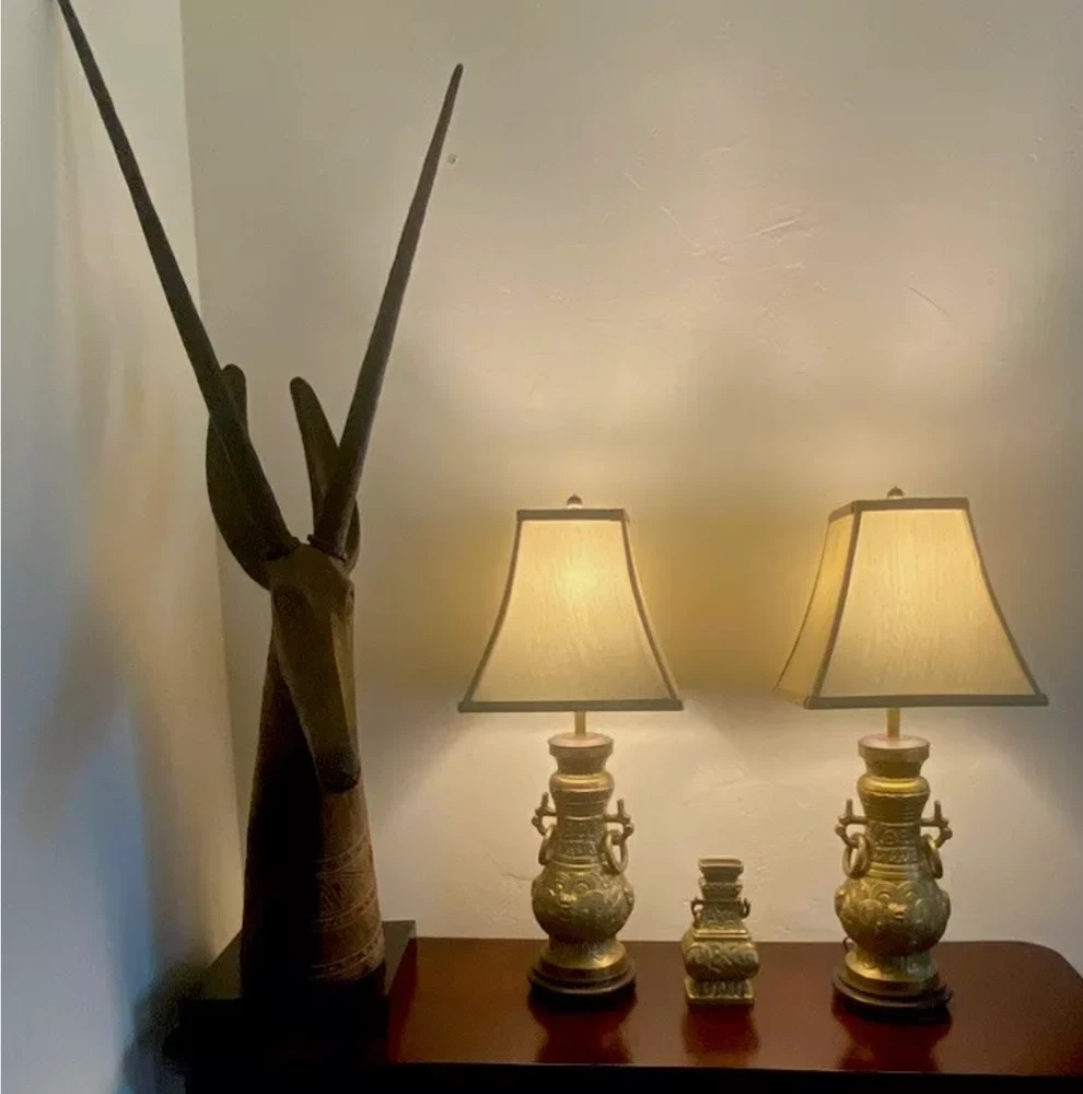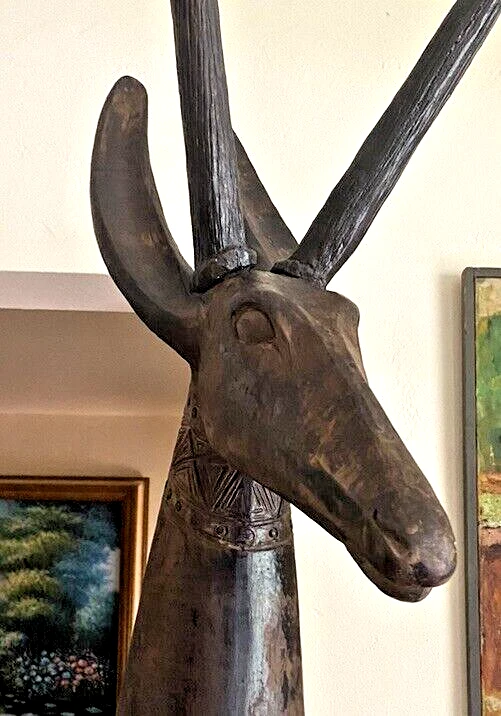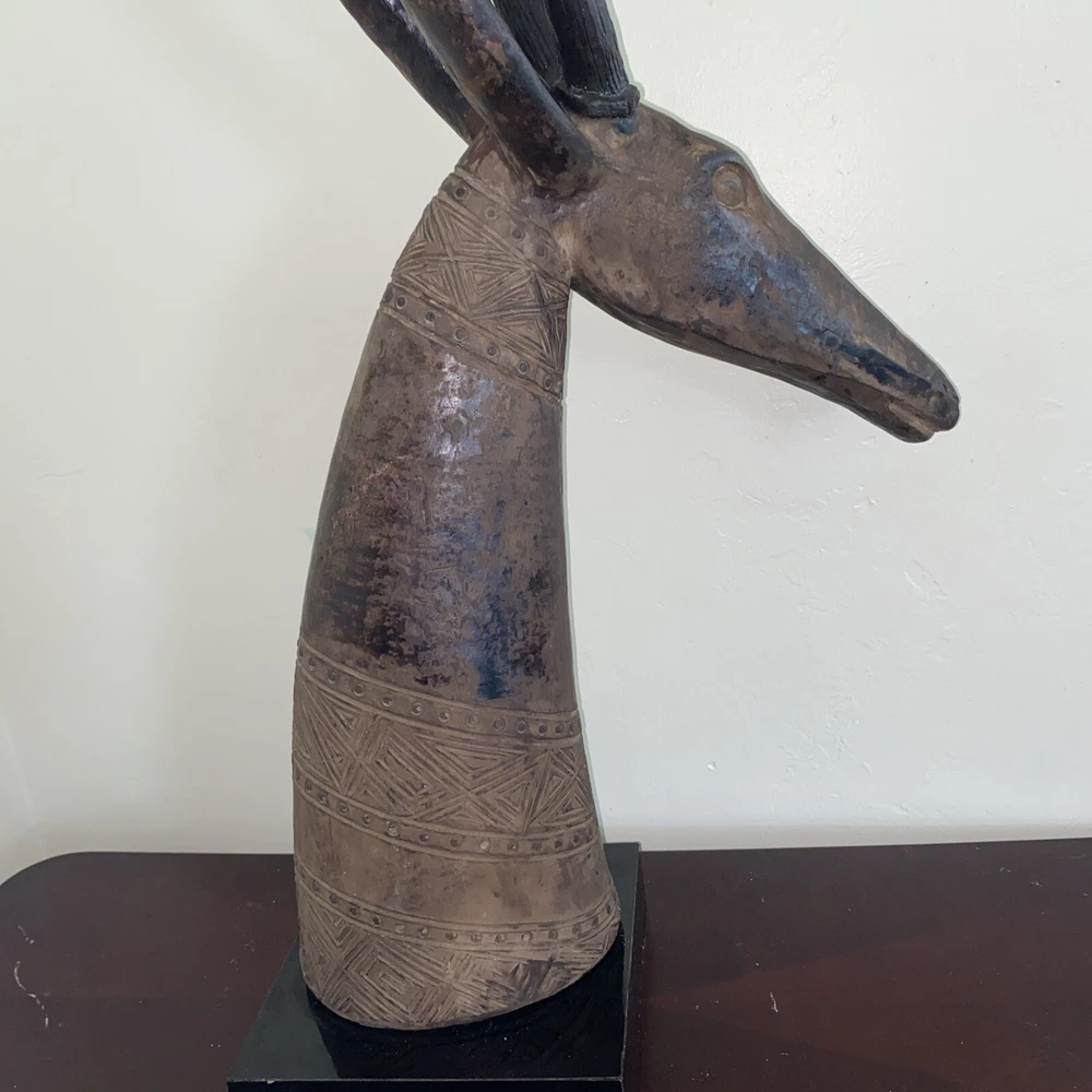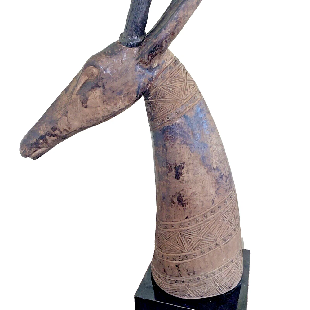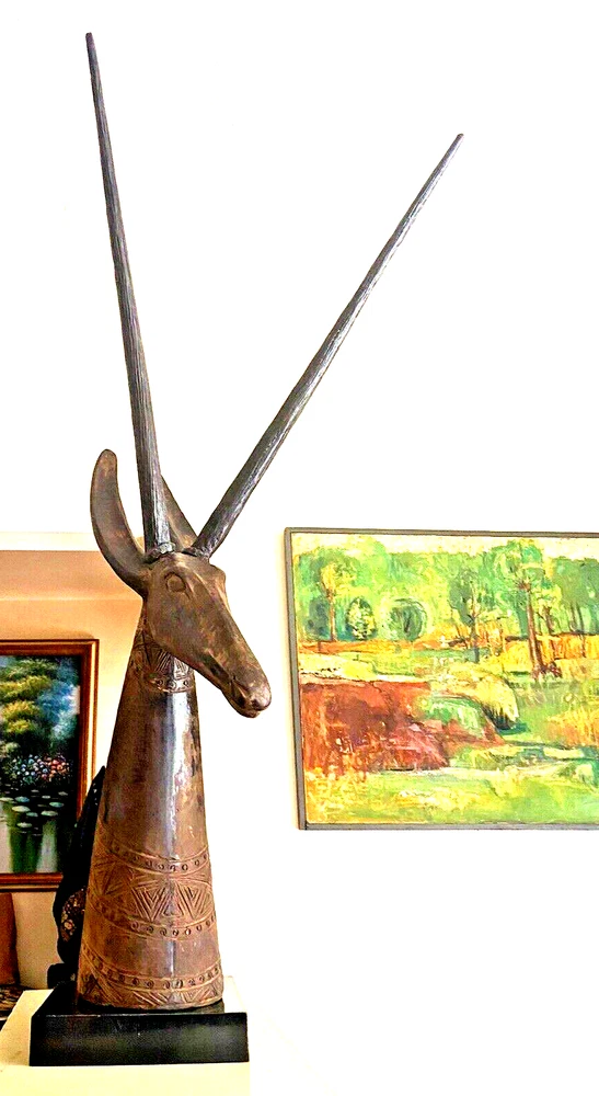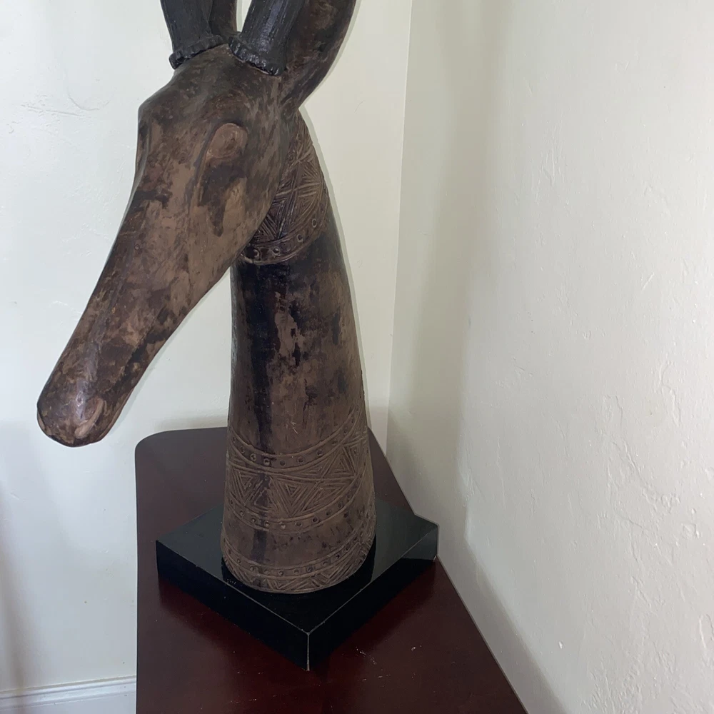 Magnificent mid-century style African Oryx Antelope ceramic Sculpture, with removable horns. According to my research, this beautiful sculpture is by Austin Productions Inc., made from cast ceramic, c. 1981. with black patina. Sits on a laminated box. Approximately 49 inches tall including the base and the horns. Base is 10 inches by 10 inches. Horns are removable. Luxury home decor that will grace a variety of rooms and decorating styles. Has only had one owner, is in good shape with some wear commensurate with age. Really beautiful, elegant and striking. Substantial item for shipping - if you prefer to pick up or to arrange own freight, that can certainly be arranged.