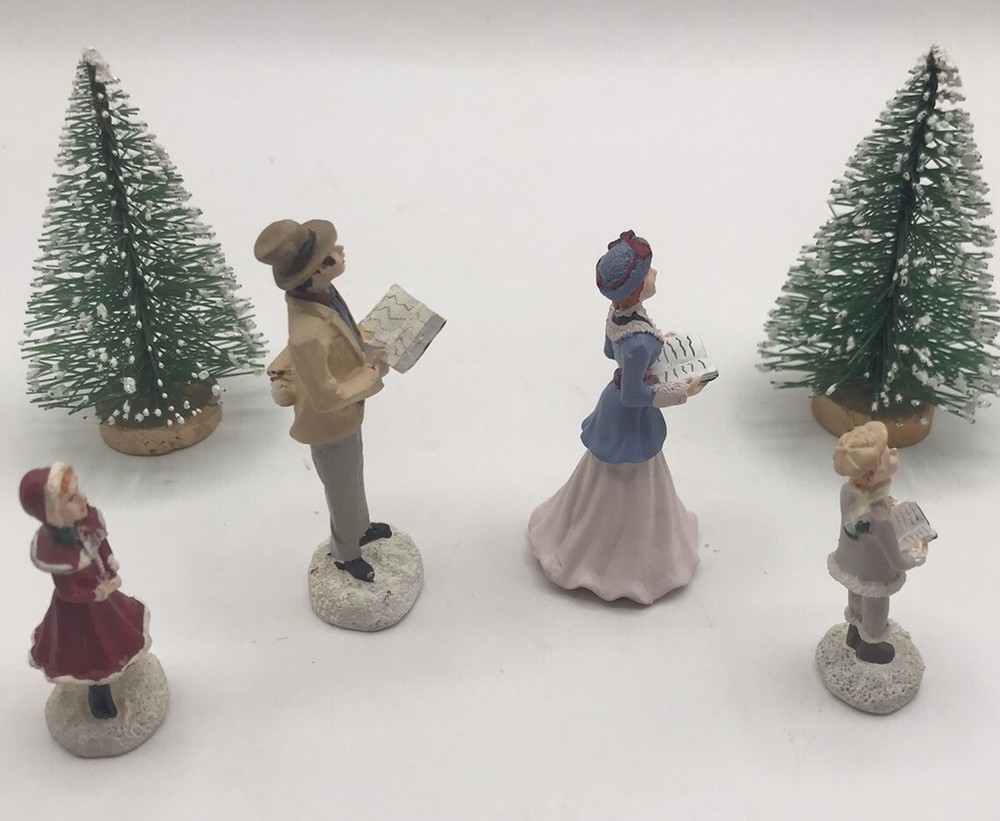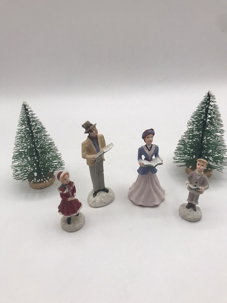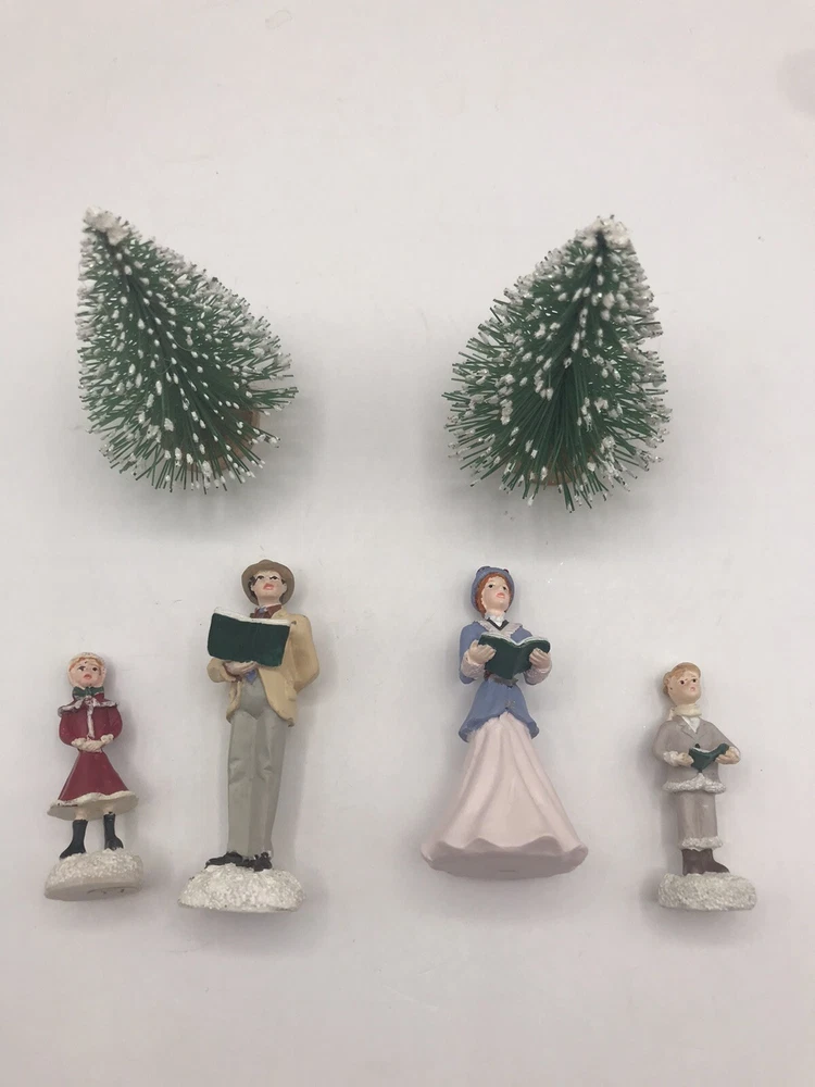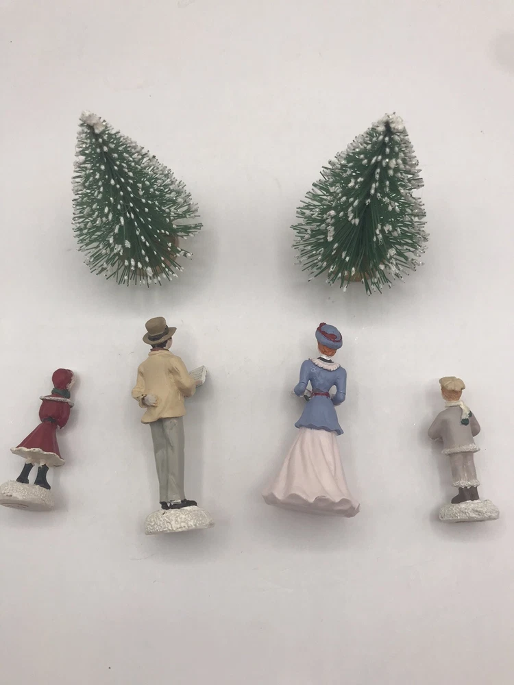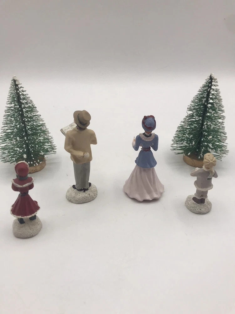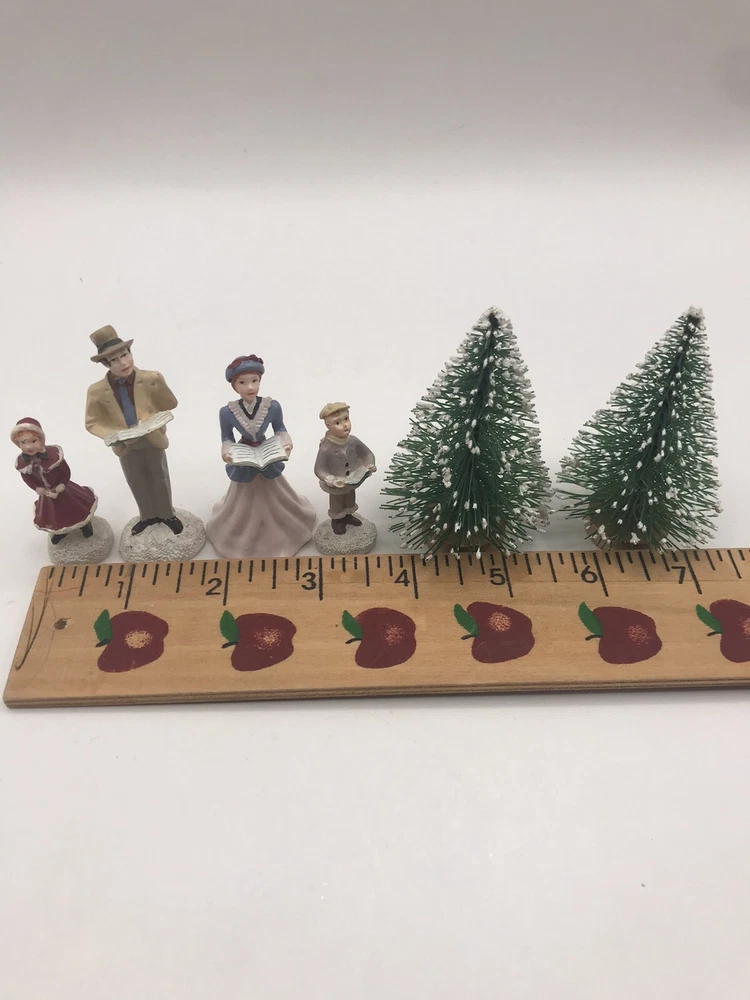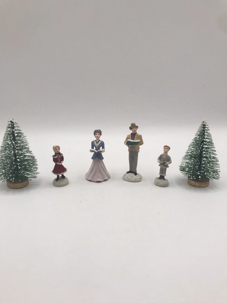 Set of 6. Price discounted because woman has been reattached at waist and arms at her previous home, please see photos. Has been very serviceable for us for many, many years. Otherwise in great condition. The trees stand 3” tall, man is 2 7/8” tall, woman 2.5” tall, children are 1 7/8” tall. Please note only bottom of original styrofoam tray available.