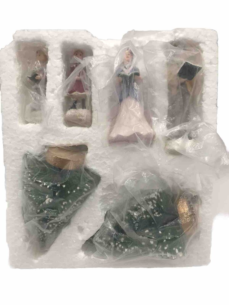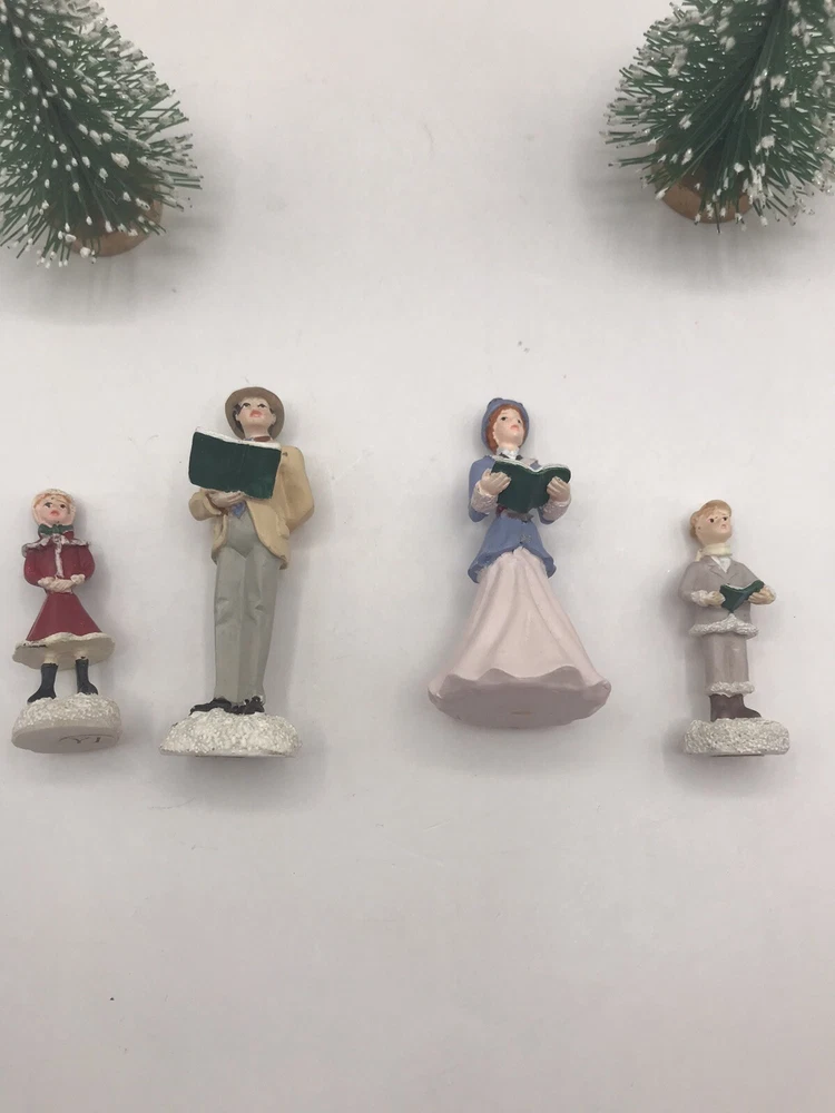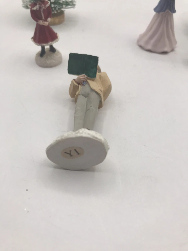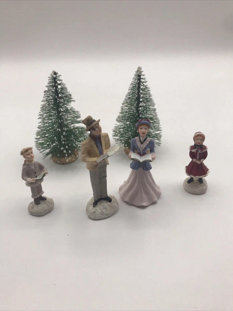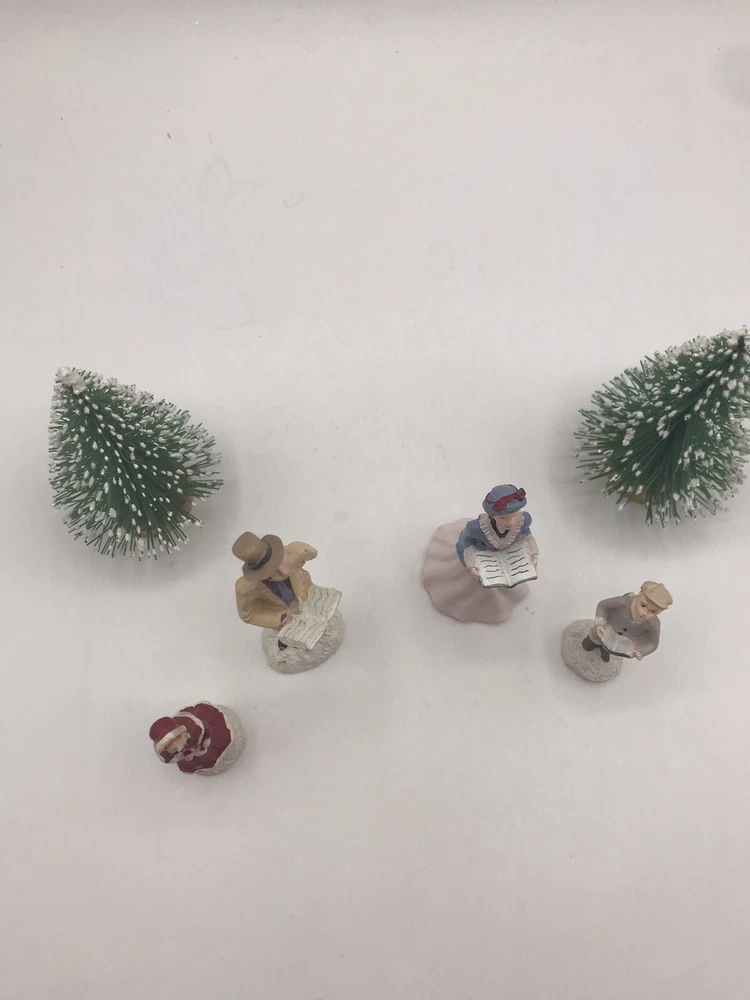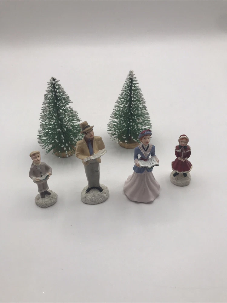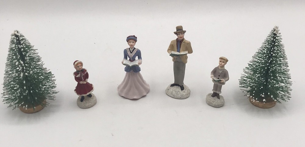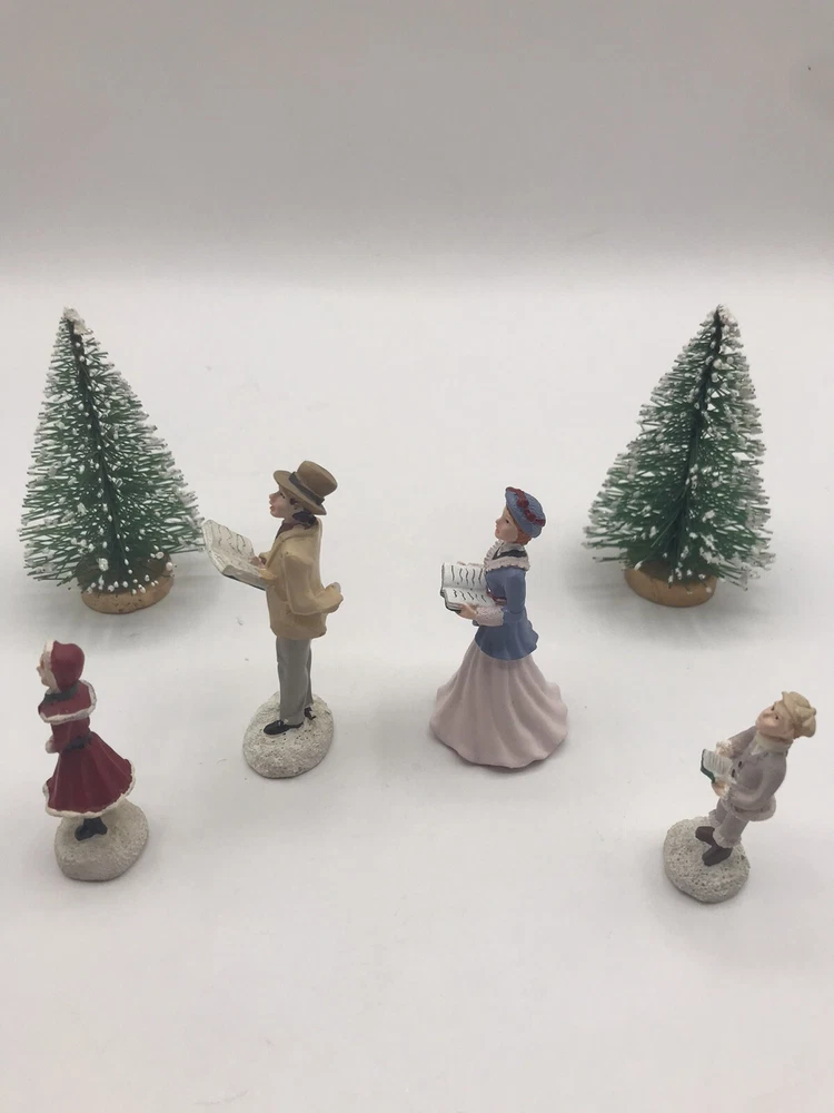 Set of 6. Price discounted because woman has been reattached at waist and arms at her previous home, please see photos. Has been very serviceable for us for many, many years. Otherwise in great condition. The trees stand 3” tall, man is 2 7/8” tall, woman 2.5” tall, children are 1 7/8” tall. Please note only bottom of original styrofoam tray available.