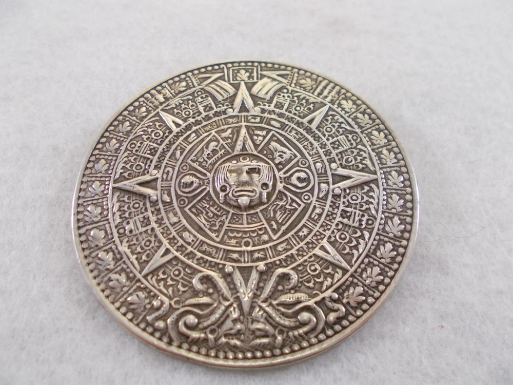 This sterling silver brooch has a bale so it can worn as a pendant. It is 2 1/2" in diameter and is a reproduction of the Aztec calendar with the Sun God in the center. It is beautifully detailed. It was purchased in Mexico in the late 1970's and is signed on the back "Hecho en Mexico" 0925 JL Gift boxed. Combined shipping is available. $4.75 for first item purchased with USPS Ground Advantage. Plus $.75 for each additional item purchased at the same time. To combine shipping on items that have different shipping cost methods (flat rate, shipping included, calculated shipping), exact weight of package will calculated and excess shipping will be refunded.