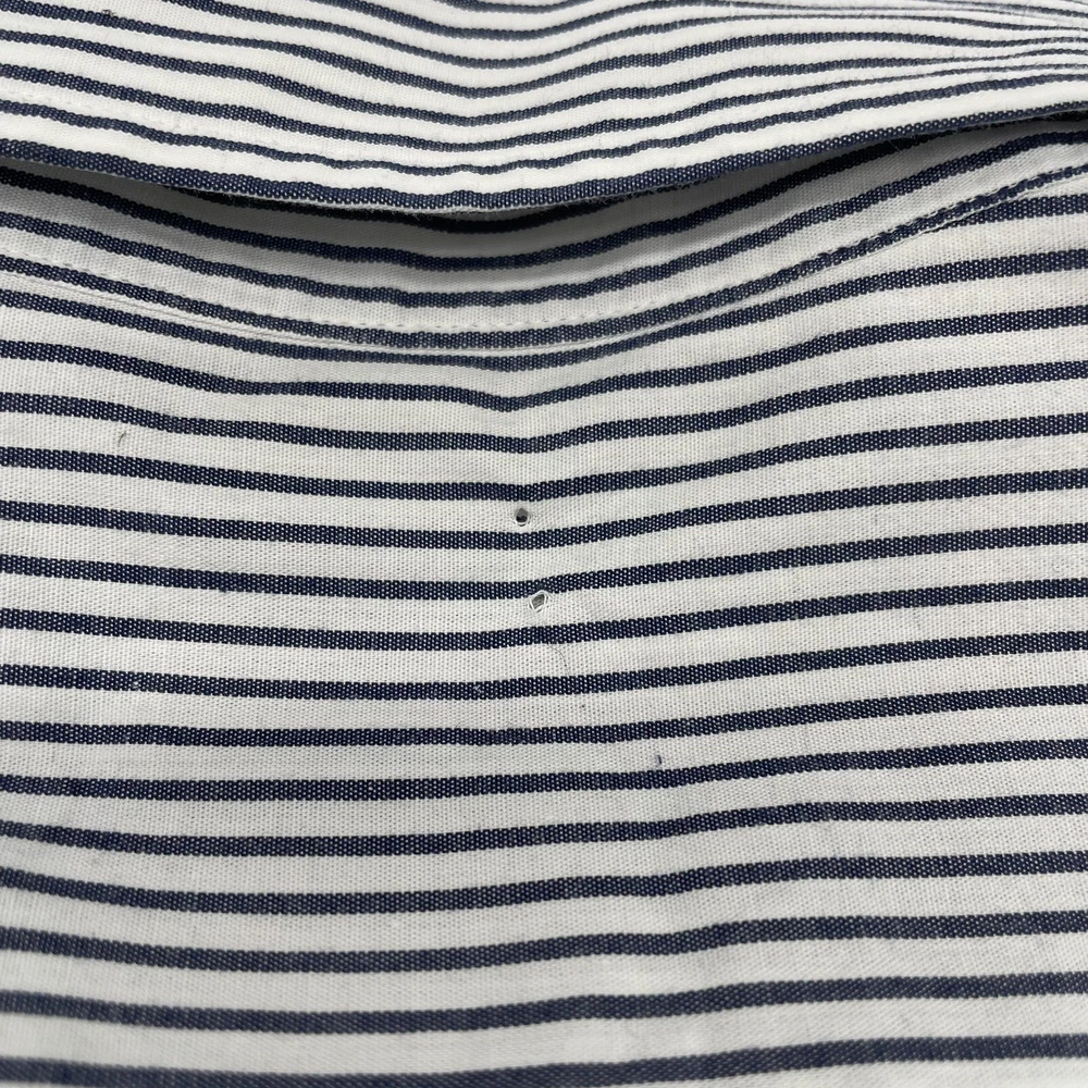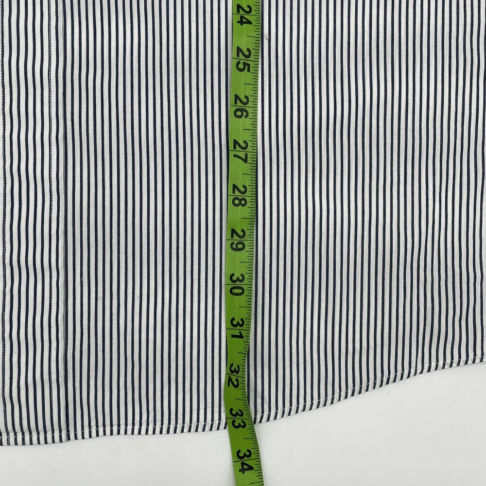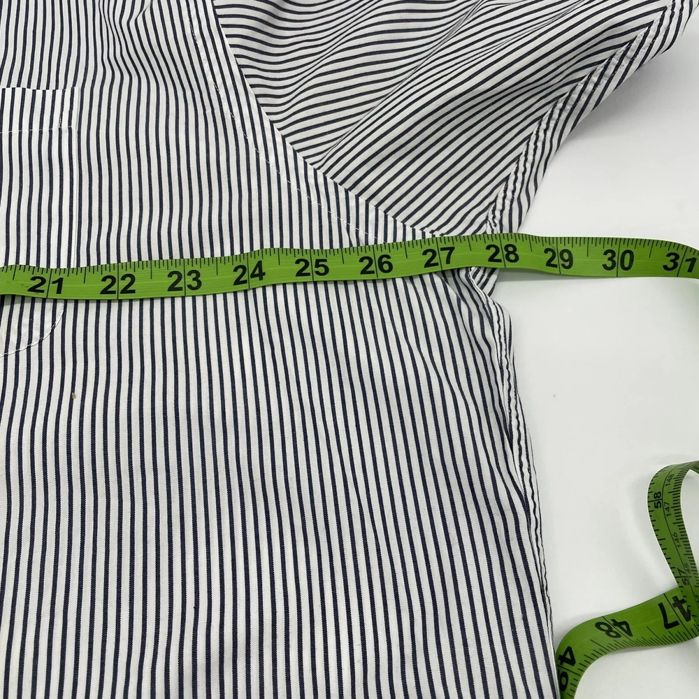 This vintage Brooks Brothers button-up shirt features a black and white striped pattern, long sleeves, and a collared neckline. The shirt is made of cotton fabric and has a regular fit. It also has button accents and a button-down collar style. *previously owned and as such may show signs of normal wear/wash wear including possible faint yellowing at the collar and two tiny holes on the back from a previous price tag. Clean, non smoking. Sold as seen in pictures. Feel free to reach out with any questions prior to purchase. Thank You!